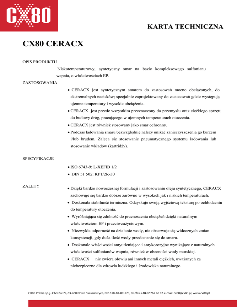 KARTA TECHNICZNA CX80 CERACX OPIS PRODUKTU Niskotemperaturowy, syntetyczny smar na bazie kompleksowego sulfonianu wapnia, o właściwościach EP. ZASTOSOWANIA CERACX jest syntetycznym smarem do zastosowań mocno obciążonych, do ekstremalnych nacisków; specjalnie zaprojektowany do zastosowań gdzie występują ujemne temperatury i wysokie obciążenia. CERACX jest przede wszystkim przeznaczony do przemysłu oraz ciężkiego sprzętu do budowy dróg, pracującego w ujemnych temperaturach otoczenia. CERACX jest również stosowany jako smar ochronny. Podczas ładowania smaru bezwzględnie należy unikać zanieczyszczenia go kurzem i/lub brudem. Zaleca się stosowanie pneumatycznego systemu ładowania lub stosowanie wkładów (kartridży). SPECYFIKACJE ISO 6743-9: L-XEFIB 1/2 DIN 51 502: KP1/2R-30 ZALETY Dzięki bardzo nowoczesnej formulacji i zastosowaniu oleju syntetycznego, CERACX zachowuje się bardzo dobrze zarówno w wysokich jak i niskich temperaturach. Doskonała stabilność termiczna. Odzyskuje swoją wyjściową teksturę po ochłodzeniu do temperatury otoczenia. Wyróżniająca się zdolność do przenoszenia obciążeń dzięki naturalnym właściwościom EP i przeciwzużyciowym. Niezwykła odporność na działanie wody, nie obserwuje się widocznych zmian konsystencji, gdy duża ilość wody przedostanie się do smaru. Doskonałe właściwości antyutleniające i antykorozyjne wynikające z naturalnych właściwości sulfonianów wapnia, również w obecności wody morskiej. CERACX nie zwiera ołowiu ani innych metali ciężkich, uważanych za niebezpieczne dla zdrowia ludzkiego i środowiska naturalnego. KARTA TECHNICZNA TYPOWE WŁAŚCIWOŚCI METODY Mydło/zagęszczacz - Klasa NLGI ASTM D 217/DIN 51 JEDNOSTKI Sulfonian wapnia - 1-2 818 Barwa Wzrokowo - Brązowa Tekstura Wzrokowo - Gładka Zakres temperatur pracy °C Penetracja w 25 °C ASTM D 217/DIN51 -35 do 190 0,1 mm 280 - 310 ASTM D 2596 kG 400 Właściwości antykorozyjne DIN 51 802/IP220/NFT stopnie 0-0 SKF- EMCOR 60-135/ISO 11007 Temperatura przepływu przy DIN 51 805 °C -33 Rozruchowy mN∙m 624 Po 1h mN∙m 72 °C > 300 mm²/s (cSt) 320 818 Obciążenie zespawania, aparat 4-kulowy ciśnieniu 1400 mbar Moment obrotowy w -20°C ASTM D 1478 Temperatura kroplenia IP 396/DIN ISO 2176 Lepkość kinematyczna oleju ASTM D 445/DIN 51 bazowego w 40 °C 562-1/ISO 3104/ IP71 NOTATKI Powyższe informacje zostały umieszczone w instrukcji w dobrej wierze i uważane są za wiarygodne. CX-80 POLSKA i przedstawiciele zrzekają się odpowiedzialności za skutki zastosowania produktu przez osoby, których metod działania nie mogą kontrolować. Klient odpowiedzialny jest za określenie przydatności produktów oraz metod ich zastosowania lub przygotowania /co jest ważniejsze niż użycie wspomniane w literaturze/. Ponadto odpowiedzialnością klienta jest obserwacja i dostosowanie środków ostrożności w celu ochrony pracowników i mienia podczas przenoszenia i stosowania któregoś z produktów.