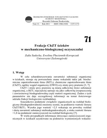 ŚRODKOWO-POMORSKIE TOWARZYSTWO NAUKOWE OCHRONY ŚRODOWISKA Rocznik Ochrona Środowiska Tom 13. Rok 2011 ISSN 1506-218X 1157-1172 71 Frakcje ChZT ścieków w mechaniczno-biologicznej oczyszczalni Zofia Sadecka, Ewelina Płuciennik-Koropczuk Uniwersytet Zielonogórski 1. Wstęp W celu scharakteryzowania zawartości substancji organicznej w ściekach, stosuje się powszechnie znane wskaźniki takie jak: biochemiczne zapotrzebowanie tlenu (BZT5), chemiczne zapotrzebowanie tlenu (ChZT), ogólny węgiel organiczny (OWO) czy straty przy prażeniu [3, 7]. ChZT i straty przy prażeniu są miarą całkowitej ilości substancji organicznej, a BZT5 najczęściej opisuje się jako całkowitą (rozpuszczoną i zawiesinową) biodegradowalną część materii organicznej. Żaden z tych parametrów nie daje szczegółowej informacji na temat ilościowego udziału frakcji biologicznie rozkładalnej. Szacunkowo podatność związków organicznych na rozkład biologiczny (biodegradowalność) możemy ocenić, na podstawie wartość ilorazu ChZT/BZT5. Wysoka jego wartość >2,5 wskazuje na powolny rozkład i dużą zawartość substancji niebiodegradowalnych, a niska wartość ilorazu <1,8 na podatność zanieczyszczeń na rozkład biologiczny [7]. W wielu przypadkach informacje dotyczące zanieczyszczeń organicznych w ściekach uzyskiwane na podstawie wymienionych wskaźni- 1158 Zofia Sadecka, Ewelina Płuciennik-Koropczuk ków są niewystarczające i konieczna jest bardziej dokładna ich charakterystyka. W ostatnich latach, jednym z najbardziej znaczących osiągnięć w technologii ścieków jest frakcjonowanie ChZT, pozwalające wyróżnić frakcje odniesione do wielkości cząstek i ich podatności na rozkład biochemiczny. Wyznaczenie składowych ChZT dostarcza bardziej szczegółowej charakterystyki składu ścieków, ale przede wszystkim pozwala na zidentyfikowanie łatwo i trudno rozkładalnych frakcji ChZT. W ściekach bytowo-gospodarczych wyróżnia się cztery podstawowe frakcje ChZT [2]: frakcję substancji organicznych rozpuszczonych biologiczne łatwo rozkładalnych SS, frakcję substancji organicznych rozpuszczonych biologicznie nierozkładalnych SI, frakcję substancji organicznych w zawiesinie biologicznie nierozkładalnych X I oraz frakcję substancji organicznych w zawiesinie biologicznie wolno rozkładalnych XS. Wyznaczenie oraz śledzenie zmian frakcji ChZT w poszczególnych etapach mechaniczno-biologicznego oczyszczania ścieków pozwala ocenić efektywność poszczególnych procesów technologicznych jak i wyznaczyć skuteczność pracy oczyszczalni ścieków. W pracy przeprowadzono ocenę skuteczności rozkładu zanieczyszczeń organicznych w ściekach po poszczególnych procesach mechaniczno-biologicznego oczyszczania ze szczególnym uwzględnieniem zmian frakcji ChZT w ciągu technologicznym oczyszczalni w Zielonej Górze. 2. Frakcje ChZT Podstawowy podział całkowitego ChZT [2, 10, 11] w ściekach surowych na frakcje stosowany w projektowaniu i modelowaniu systemów oczyszczania ścieków przedstawiono na rys. 1. Przyjmuje się, że procentowy udział zawiesin w ściekach bytowo – gospodarczych wynosi około 57% ChZT, a koloidów i substancji rozpuszczonych łącznie około 43% [9]. Procentowy udział frakcji zawiesinowej, obecnej w całkowitym ChZT ścieków bytowo-gospodarczych, wynosi 65÷79%, a rozpuszczonej 21÷35% (rys. 1). Procentowy udział składników organicznych w całkowitym ChZT ścieków bytowo gospodarczych wg różnych modeli przedstawiono na rys. 2. Frakcje ChZT ścieków w mechaniczno-biologicznej oczyszczalni 1159 Rys. 1. Podział ChZT całkowitego w ściekach bytowo-gospodarczych na frakcje [2, 13] Fig. 1. Division of total COD into fractions in domestic wastewater [2, 13] Rys. 2. Procentowy udział składników organicznych w ChZT całkowitym ścieków bytowo-gospodarczych a) model klasyczny, b) model postklasyczny, c) model uwzględniający stan skupienia związków organicznych, d) model uwzględniający podatność związków organicznych na biologiczny rozkład [8] Fig. 2. Percentage contribution of organic components in total COD of domestic sewage a) classical model, b) postclassical model, c) model considering the state of aggregation of organic compounds, d) model considering biodegradability of organic compounds [8] Zofia Sadecka, Ewelina Płuciennik-Koropczuk 1160 Po uwzględnieniu kryterium rozpuszczalności oraz podatności substancji organicznych na biodegradację, całkowite ChZT ścieków surowych można wyznaczyć w sposób uproszczony jako sumę frakcji, zgodnie z równaniem [1, 2, 12]: ChZTcałk.= SI + SS + XS + XI, mg O2/dm3, gdzie: SS – stężenie rozpuszczonych substancji organicznych, biologicznie łatwo rozkładalnych, mg O2/dm3, SI – stężenie rozpuszczonych substancji organicznych, biologicznie nierozkładalnych, mg O2/dm3, XS – stężenie substancji organicznych w zawiesinie, biologicznie wolno rozkładalnych, mg O2/dm3, XI – stężenie substancji organicznych w zawiesinie, biologicznie nierozkładalnych, mg O2/dm3. Udział poszczególnych frakcji substancji organicznych w ściekach miejskich wg modelu ASIM1 (Activated Sludge SIMulation Program) przedstawiono na rys. 3 [7, 14]. 20 40 60 280 20 mg/dm3 – substancje rozpuszczone nie ulegające biodegradacji 40 mg/dm3 – substancje nierozpuszczone oporne na biodegradację 60 mg/dm3 – substancje rozpuszczone łatwo ulegające biodegradacji 280 mg/dm3 – substancje nierozpuszczone wolno ulegające degradacji Rys. 3. Udział frakcji substancji organicznych w ściekach miejskich wg modelu ASIM 1 [14] Fig. 3. Fractions of organic matter in domestic wastewater by activated sludge model ASIM 1 [14] Frakcje ChZT ścieków w mechaniczno-biologicznej oczyszczalni 1161 3. Cel i zakres badań Celem badań było wyznaczenie frakcji ChZT w ściekach surowych i ich zmian w ściekach po kolejnych procesach ich mechanicznobiologicznego oczyszczania. Badania prowadzono w centralnej ocz