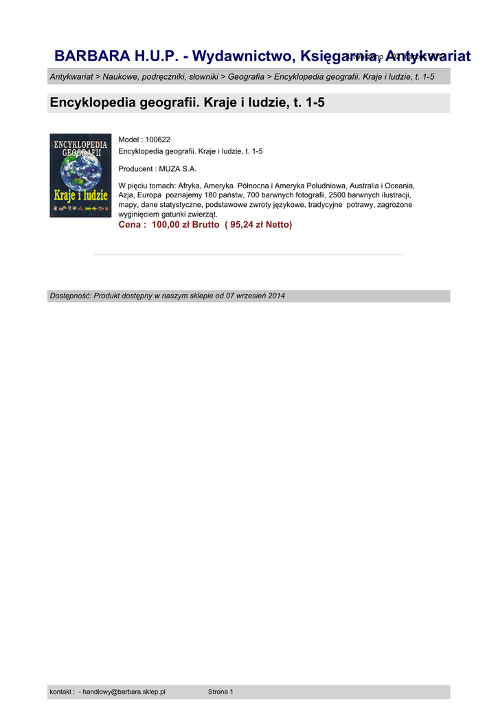Utworzono Antykwariat : 02 marzec 2017 BARBARA H.U.P. - Wydawnictwo, Księgarnia, Antykwariat > Naukowe, podręczniki, słowniki > Geografia > Encyklopedia geografii. Kraje i ludzie, t. 1-5 Encyklopedia geografii. Kraje i ludzie, t. 1-5 Model : 100622 Encyklopedia geografii. Kraje i ludzie, t. 1-5 Producent : MUZA S.A. W pięciu tomach: Afryka, Ameryka Północna i Ameryka Południowa, Australia i Oceania, Azja, Europa poznajemy 180 państw, 700 barwnych fotografii, 2500 barwnych ilustracji, mapy, dane statystyczne, podstawowe zwroty językowe, tradycyjne potrawy, zagrożone wyginięciem gatunki zwierząt. Cena : 100,00 zł Brutto ( 95,24 zł Netto) Dostępność: Produkt dostępny w naszym sklepie od 07 wrzesień 2014 kontakt : - [email protected] Strona 1