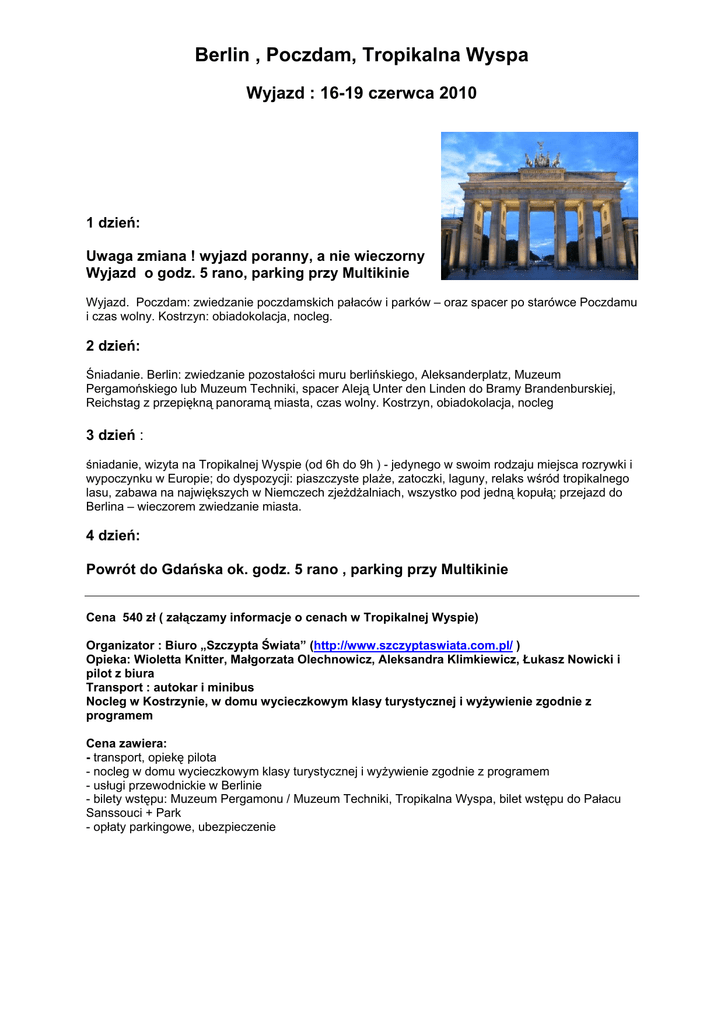 Berlin , Poczdam, Tropikalna Wyspa Wyjazd : 16-19 czerwca 2010 1 dzień: Uwaga zmiana ! wyjazd poranny, a nie wieczorny Wyjazd o godz. 5 rano, parking przy Multikinie Wyjazd. Poczdam: zwiedzanie poczdamskich pałaców i parków – oraz spacer po starówce Poczdamu i czas wolny. Kostrzyn: obiadokolacja, nocleg. 2 dzień: Śniadanie. Berlin: zwiedzanie pozostałości muru berlińskiego, Aleksanderplatz, Muzeum Pergamońskiego lub Muzeum Techniki, spacer Aleją Unter den Linden do Bramy Brandenburskiej, Reichstag z przepiękną panoramą miasta, czas wolny. Kostrzyn, obiadokolacja, nocleg 3 dzień : śniadanie, wizyta na Tropikalnej Wyspie (od 6h do 9h ) - jedynego w swoim rodzaju miejsca rozrywki i wypoczynku w Europie; do dyspozycji: piaszczyste plaże, zatoczki, laguny, relaks wśród tropikalnego lasu, zabawa na największych w Niemczech zjeżdżalniach, wszystko pod jedną kopułą; przejazd do Berlina – wieczorem zwiedzanie miasta. 4 dzień: Powrót do Gdańska ok. godz. 5 rano , parking przy Multikinie Cena 540 zł ( załączamy informacje o cenach w Tropikalnej Wyspie) Organizator : Biuro „Szczypta Świata” (http://www.szczyptaswiata.com.pl/ ) Opieka: Wioletta Knitter, Małgorzata Olechnowicz, Aleksandra Klimkiewicz, Łukasz Nowicki i pilot z biura Transport : autokar i minibus Nocleg w Kostrzynie, w domu wycieczkowym klasy turystycznej i wyżywienie zgodnie z programem Cena zawiera: - transport, opiekę pilota - nocleg w domu wycieczkowym klasy turystycznej i wyżywienie zgodnie z programem - usługi przewodnickie w Berlinie - bilety wstępu: Muzeum Pergamonu / Muzeum Techniki, Tropikalna Wyspa, bilet wstępu do Pałacu Sanssouci + Park - opłaty parkingowe, ubezpieczenie Lista rzeczy na wyjazd: - wygodne obuwie - nieprzemakalne okrycie - czapka z daszkiem i krem z filtrem - wygodna odzież, umożliwiająca ubranie się na „cebulkę”, kapcie, piżama, przybory toaletowe - strój kąpielowy, klapki, ręcznik - paszport - kieszonkowe (nasza propozycja): max. 50 euro + 50 zł - jeżeli dziecko przyjmuje jakieś lekarstwa, prosimy o sposób dawkowania - aviomarin, lokomotiv (jeżeli występuje problem z choroba lokomocyjną) - płyty z filmami na czas podróży (prosimy o rozsądny dobór) - książkę, zeszyt, długopis, karty – rozrywki podróżne - jedzenie do autokaru, ale takie, które nie wybrudzi tapicerki samochodu - ewentualnie wilgotne chusteczki, żeby odświeżyć się w podroży Proszę uczulić dzieci, że rozmowy telefoniczne poza granicami Polski są dosyć drogie. Nie odpowiadamy, za przedmioty wartościowe zabierane przez dzieci. TROPIKALNA WYSPA – INFORMACJE – CENNIK Wstęp: • • • • Wstęp zaplanowany jest TYLKO do jednej strefy – STREFY TROPIKALNEJ. Wstęp za wszystkich uczestników wliczony jest w koszty wycieczki, opłacany jest przez pilota wycieczki przed wejściem. Otrzymacie opaskę chipową, za pomocą której dokonacie bezgotówkowo dalszych opłat w Tropical Islands. Na opasce znajduje się numer – jest to numer szafki w przebieralni. By otworzyć szafkę należy przytrzymać opaskę chip przed sensorem. Na opasce dla dzieci znajduje się limit – 35euro. Płacić bezgotówkowo: • • • • Za wszystkie wydatki dokonane w Tropical Islands (posiłki, napoje, pamiątki, usługi, dopłaty itd.) płacicie łącznie przed wyjściem. Za koszty poniesione podczas pobytu na wyspie biuro „Szczypta Świata” nie odpowiada. W tym celu wszelkie wydatki zapisywane są na chipie umieszczonym na opasce na rękę. Przy każdorazowej zmianie strefy (np.: z tropikalnej na strefę saun) – opłata 8,50 euro. W przypadku utraty lub uszkodzenia karty Tropikal Island pobiera opłatę w wysokości 150,- EUR (dzieci 35,- EUR). PRZYKŁADOWE KOSZTY: restauracja Jabarimba Czynne codziennie w godzinach: 12.30 – 23.00 Ceny: Duże Barbecue 15,80 euro Możecie podchodzić do bufetu, ile tylko chcecie i stale próbować nowych kombinacji smakowych. Małe Barbecue 9,80 euro Komponujecie swój zestaw przy bufecie jeden raz. Naleśnikarnia Crêperie Latiki w Pawilonie Bali Przykładowe ceny: Crepes z farszem z pasków kurczaka i mango z kokosowym sosem curry i ananasem - 6,60 Euro. Crepes z bananem i żurawinowym chutney udekorowany sosem czekoladowym - 4,50 Euro. Czynne codziennie od 11:30 do 18:30 Burger, pizza, kiełbaska i spółka - Restauracja samoobsługowa Mondial Zestaw - frytki, hamburger i napój bezalkoholowy (0,3 l) - 8,10 euro; tak samo jak spaghetti bolognese z napojem bezalkoholowym (0,3 l). Godziny otwarcia restauracji Mondial: codziennie od 11:00 do 23:00 Zjeżdżalnia Zjeżdżalnia wodna o wysokości 27 metrów to frajda dla małych i dużych! Czekają nas Was cztery różne ślizgawki posiadające certyfikat niemieckiego TÜV. Od łagodnej familijnej ślizgawki na pecjalnych oponach po zjeżdżalnię turbo, na której można rozwinąć prędkość nawet do 70 kilometrów na godzinę! Godziny otwarcia: codziennie od 9:00 do 1:00 Cena: 3,50 EUR / dzień zjeżdżania Uwaga: zjeżdżalnie są obiektami sportowymi, korzystanie z nich odbywa się na własną odpowiedzialność! Niebieska zjeżdżalnia turbo jest dostępna dla dzieci od 14 roku życia, zjeżdżanie parami lub w więcej osób jest zabronione! Klub dla Dzieci "Tropino" Na 4.000 m² dzieciaki mogą wspinać się, skakać i szaleć do woli Jest tu i nowy tor wyścigowy, i obiekt do wspinaczki, i rowery wodne, a nawet trampolina! Można się ścigać samochodzikami, wspinać, zostać kapitanem albo po prostu do woli sobie poskakać. Te i wiele innych atrakcji czeka na najmłodszych w Klubie dla Dzieci "Tropino". Godziny otwarcia: codziennie od 09:00 do 21:00 Cena: 3,50 EUR za dzień zabawy Ważne: zespół animatorów nie zajmuje się opieką nad dziećmi! Odpowiedzialność za dzieci ponoszą wyłącznie rodzice. Niezapomniane widoki z balonu Poszybować w powietrzu na wysokości 55 metrów – co za ekscytujące przeżycie! Naszym powietrznym balonem może wznieść się do g