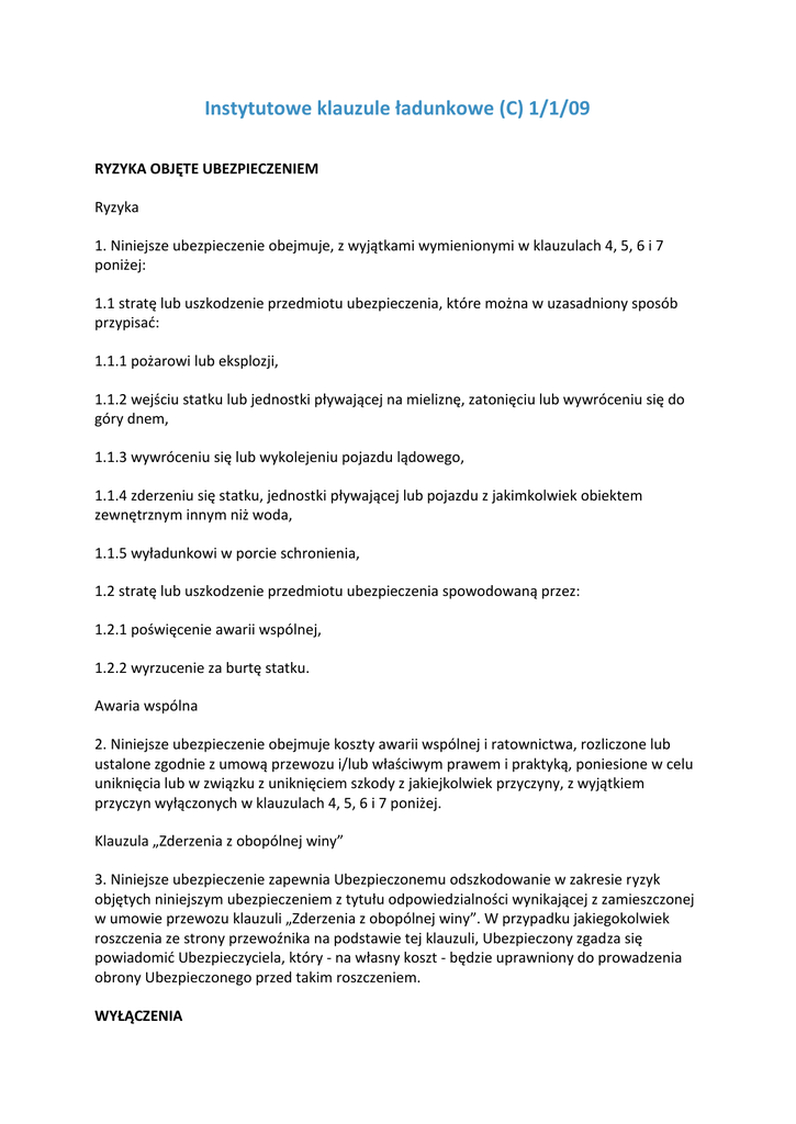 Instytutowe klauzule ładunkowe (C) 1/1/09 RYZYKA OBJĘTE UBEZPIECZENIEM Ryzyka 1. Niniejsze ubezpieczenie obejmuje, z wyjątkami wymienionymi w klauzulach 4, 5, 6 i 7 poniżej: 1.1 stratę lub uszkodzenie przedmiotu ubezpieczenia, które można w uzasadniony sposób przypisać: 1.1.1 pożarowi lub eksplozji, 1.1.2 wejściu statku lub jednostki pływającej na mieliznę, zatonięciu lub wywróceniu się do góry dnem, 1.1.3 wywróceniu się lub wykolejeniu pojazdu lądowego, 1.1.4 zderzeniu się statku, jednostki pływającej lub pojazdu z jakimkolwiek obiektem zewnętrznym innym niż woda, 1.1.5 wyładunkowi w porcie schronienia, 1.2 stratę lub uszkodzenie przedmiotu ubezpieczenia spowodowaną przez: 1.2.1 poświęcenie awarii wspólnej, 1.2.2 wyrzucenie za burtę statku. Awaria wspólna 2. Niniejsze ubezpieczenie obejmuje koszty awarii wspólnej i ratownictwa, rozliczone lub ustalone zgodnie z umową przewozu i/lub właściwym prawem i praktyką, poniesione w celu uniknięcia lub w związku z uniknięciem szkody z jakiejkolwiek przyczyny, z wyjątkiem przyczyn wyłączonych w klauzulach 4, 5, 6 i 7 poniżej. Klauzula „Zderzenia z obopólnej winy” 3. Niniejsze ubezpieczenie zapewnia Ubezpieczonemu odszkodowanie w zakresie ryzyk objętych niniejszym ubezpieczeniem z tytułu odpowiedzialności wynikającej z zamieszczonej w umowie przewozu klauzuli „Zderzenia z obopólnej winy”. W przypadku jakiegokolwiek roszczenia ze strony przewoźnika na podstawie tej klauzuli, Ubezpieczony zgadza się powiadomić Ubezpieczyciela, który - na własny koszt - będzie uprawniony do prowadzenia obrony Ubezpieczonego przed takim roszczeniem. WYŁĄCZENIA 4. Niniejsze ubezpieczenie w żadnym razie nie obejmuje: 4.1 straty, uszkodzenia ani wydatków, jakie można przypisać świadomie wadliwemu postępowaniu Ubezpieczonego 4.2 zwykłego wycieku, zwykłej utraty na wadze lub objętości, lub zwykłego zużycia przedmiotu ubezpieczenia 4.3 straty, uszkodzenia ani wydatków spowodowanych niedostatecznym albo nieodpowiednim opakowaniem/przygotowaniem przedmiotu ubezpieczenia, aby mógł on przetrwać zwykłe warunki panujące podczas przewozu objętego ubezpieczeniem, wówczas, gdy takie opakowanie lub przygotowanie wykonane zostaje przez Ubezpieczonego lub jego pracowników lub ma miejsce przed rozpoczęciem niniejszego ubezpieczenia (w rozumieniu niniejszych klauzul „opakowanie” obejmuje zasztauowanie w kontenerze, a termin „pracownicy” nie obejmuje samodzielnych wykonawców) 4.4 straty, uszkodzenia ani wydatków spowodowanych wadą ukrytą lub naturalnymi właściwościami przedmiotu ubezpieczenia 4.5 straty, uszkodzenia ani wydatków spowodowanych opóźnieniem, nawet gdyby opóźnienie to spowodowane zostało ryzykiem objętym ubezpieczeniem (z wyjątkiem wydatków płatnych na podstawie klauzuli 2) 4.6 straty, uszkodzenia ani wydatków wynikających z niewypłacalności lub uchybień finansowych właściciela, armatora, zarządzającego, operatora lub czarterującego statek w sytuacji, gdy w czasie załadunku przedmiotu ubezpieczenia na pokład jednostki pływającej, Ubezpieczony był świadom lub – przy zwykłym toku czynności – winien być świadom, iż taka niewypłacalność lub uchybienie finansowe mogą przeszkodzić w zwykłym przebiegu podróży. Niniejsze wyłączenie nie ma zastosowania w sytuacji, kiedy umowa ubezpieczenia została zawarta na rzecz osoby roszczącej na podstawie niniejszych klauzul, która nabyła lub zgodziła się nabyć przedmiot ubezpieczenia w dobrej wierze na mocy wiążącego kontraktu. 4.7 rozmyślnego uszkodzenia lub zniszczenia przedmiotu ubezpieczenia lub jakiejkolwiek jego części wskutek bezprawnego czynu jakiejkolwiek osoby, 4.8 straty, uszkodzenia ani wydatków bezpośrednio lub pośrednio spowodowanych przez lub wynikających z użycia jakiejkolwiek broni wojennej o działaniu opartym na rozszczepieniu atomowym lub jądrowym i/lub fuzji albo innej podobnej reakcji albo sile radioaktywnej lub materii radioaktywnej. 5. 5.1 Niniejsze ubezpieczenie w żadnym razie nie obejmuje straty, szkody, lub wydatków wynikających z: 5.1.1 braku zdolności żeglugowej lub niezdatności statku lub jednostki pływającej do bezpiecznego przewozu przedmiotu ubezpieczenia w sytuacji, gdy Ubezpieczony wiedział o takiej niezdolności żeglugowej lub niezdatności w czasie załadunku przedmiotu ubezpieczenia na pokład tego statku lub jednostki pływającej, 5.1.2 niezdatności kontenera lub środka przewozu do bezpiecznego przewozu przedmiotu ubezpieczenia, wówczas gdy załadunek zostaje przeprowadzony: przed rozpoczęciem ochrony w ramach niniejszego ubezpieczenia, lub przez Ubezpieczonego lub jego pracowników, a są oni świadomi takiej niezdatności w czasie załadunku. 5.2 Wyłączenie 5.1.1 powyŜej nie ma zastosowania w sytuacji, kiedy umowa ubezpieczenia została zawarta na rzecz strony roszczącej na podstawie niniejszych klauzul, która nabyła lub zgodziła się nabyć przedmiot ubezpieczenia w dobrej wierze na mocy wiążącego kontraktu. 5.3 Ubezpieczyciel nie będzie podważał domniemania zdolności zeglugowej statku i zdatności statku do przewozu przedmiotu ubezpieczenia do miejsca przeznaczenia. 6. Niniejsze ubezpieczenie w zadnym razie nie obejmuje straty, uszkodzenia ani wydatków spowodowanych przez 6.1 wojnę, wojnę domową, rewolucję, bunt, powstanie lub zamieszki społeczne powstałe z ich przyczyny lub jakiekolwiek wrogie działania ze strony lub przeciwko państwu biorącemu udział w wojnie 6.2 zabór, zajęcie, zatrzymanie, ograniczenie swobody lub przetrzymanie oraz konsekwencje tych czynów lub ich usiłowań 6.3 porzucone miny, torpedy, bomby lub inną porzuconą broń wojenną. 7. Niniejsze ubezpieczenie w żadnym razie nie obejmuje straty, uszkodzenia ani wydatków: 7.1 spowodowanych przez strajkujących, robotników objętych lokautem lub osoby biorące udział w niepokojach robotniczych, rozruchach lub zamieszkach społe