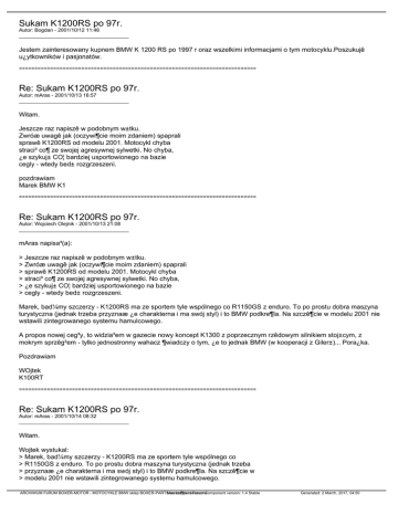 Sukam K1200RS po 97r. Autor: Bogdan - 2001/10/12 11:46 _____________________________________ Jestem zainteresowany kupnem BMW K 1200 RS po 1997 r oraz wszelkimi informacjami o tym motocyklu.Poszukujê u¿ytkowników i pasjonatów. ============================================================================ Re: Sukam K1200RS po 97r. Autor: mAras - 2001/10/13 16:57 _____________________________________ Witam. Jeszcze raz napiszê w podobnym w±tku. Zwróæ uwagê jak (oczywi¶cie moim zdaniem) spaprali sprawê K1200RS od modelu 2001. Motocykl chyba straci³ co¶ ze swojej agresywnej sylwetki. No chyba, ¿e szykuj± CO¦ bardziej usportowionego na bazie cegly - wtedy bed± rozgrzeszeni. pozdrawiam Marek BMW K1 ============================================================================ Re: Sukam K1200RS po 97r. Autor: Wojciech Olejnik - 2001/10/13 21:08 _____________________________________ mAras napisa³(a): > Jeszcze raz napiszê w podobnym w±tku. > Zwróæ uwagê jak (oczywi¶cie moim zdaniem) spaprali > sprawê K1200RS od modelu 2001. Motocykl chyba > straci³ co¶ ze swojej agresywnej sylwetki. No chyba, > ¿e szykuj± CO¦ bardziej usportowionego na bazie > cegly - wtedy bed± rozgrzeszeni. Marek, bad¼my szczerzy - K1200RS ma ze sportem tyle wspólnego co R1150GS z enduro. To po prostu dobra maszyna turystyczna (jednak trzeba przyznaæ ¿e charakterna i ma swój styl) i to BMW podkre¶la. Na szczê¶cie w modelu 2001 nie wstawili zintegrowanego systemu hamulcowego. A propos nowej ceg³y, to widzia³em w gazecie nowy koncept K1300 z poprzecznym rzêdowym silnikiem stoj±cym, z mokrym sprzêg³em - tylko jednostronny wahacz ¶wiadczy o tym, ¿e to jednak BMW (w kooperacji z Giler±)... Pora¿ka. Pozdrawiam WOjtek K100RT ============================================================================ Re: Sukam K1200RS po 97r. Autor: mAras - 2001/10/14 08:32 _____________________________________ Witam. Wojtek wystukal: > Marek, bad¼my szczerzy - K1200RS ma ze sportem tyle wspólnego co > R1150GS z enduro. To po prostu dobra maszyna turystyczna (jednak trzeba > przyznaæ ¿e charakterna i ma swój styl) i to BMW podkre¶la. Na szczê¶cie w > modelu 2001 nie wstawili zintegrowanego systemu hamulcowego. ARCHIWUM FoRUM BOXER-MOTOR - MOTOCYKLE BMW sklep BOXER-PARTS.eu MamboBoard czê¶ci i akcesoria Forum Component version: 1.4 Stable Generated: 2 March, 2017, 04:50 Oczywiscie masz racje. I nie zmienia tego obrazu nawet BoxerCup. Po prostu nie przekonuje mnie promocja R1100S jako motocykla usportowionego. Kazdy chcialby jezdzic motocyklem spelniajacym po czesci jego marzenia. Mi troche w ofercie BMW brakuje motocykla sportowo-turystycznego z naciskiem na "sportowo". Jak chociazby Aprilia Futura dla przykladu. Poczekamy - zobaczymy. Ja tam mysle, ze kasa zrobi swoje i BMW sprobuje i ta nisze zagospodarowac. pozdrowienia Marek BMW K1 ============================================================================ Re: Sukam K1200RS po 97r. Autor: Wojciech Olejnik - 2001/10/14 22:54 _____________________________________ mAras napisa³(a): > Mi troche w ofercie BMW > brakuje motocykla sportowo-turystycznego z naciskiem na > "sportowo". Jak chociazby Aprilia Futura dla przykladu. > Poczekamy - zobaczymy. > Ja tam mysle, ze kasa zrobi swoje i BMW sprobuje i ta nisze > zagospodarowac. No w³a¶nie - ciekawe co wyniknie z R1 desmo, maszyny stricte sportowej (przynajmniej w zamy¶le konstrukcyjnym). Pozdrawiam WOjtek ============================================================================ ARCHIWUM FoRUM BOXER-MOTOR - MOTOCYKLE BMW sklep BOXER-PARTS.eu MamboBoard czê¶ci i akcesoria Forum Component version: 1.4 Stable Generated: 2 March, 2017, 04:50