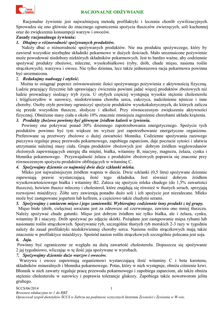 RACJONALNE ODŻYWIANIE Racjonalne żywienie jest najważniejszą metodą profilaktyki i leczenia chorób cywilizacyjnych. Sprowadza się ono głównie do znacznego ograniczenia spożycia tłuszczów zwierzęcych, soli kuchennej oraz do zwiększenia konsumpcji warzyw i owoców. Zasady racjonalnego żywienia: 1. Dbajmy o różnorodność spożywanych produktów. Należy dbać o różnorodność spożywanych produktów. Nie ma produktu spożywczego, który by zawierał wszystkie niezbędne składniki pokarmowe w dużych ilościach. Mało urozmaicone pożywienie może powodować niedobory niektórych składników pokarmowych. Jest to bardzo ważne, aby codziennie spożywać produkty zbożowe, mleczne, wysokobiałkowe (ryby, drób, chude mięso, nasiona roślin strączkowych), warzywa i owoce. Nie tylko dzienna, lecz także jednorazowa racja pokarmowa powinna być urozmaicona. 2. Redukujmy nadwagę i otyłość. Można to osiągnąć poprzez zrównoważenie ilości spożywanego pożywienia z aktywnością fizyczną. Ludzie pracujący fizycznie lub uprawiający ćwiczenia powinni jadać więcej produktów zbożowych niż ludzie prowadzący siedzący tryb życia. U otyłych częściej występują wysokie stężenie cholesterolu i trójglicerydów w surowicy, niedokrwienna choroba serca, cukrzyca, nadciśnienie tętnicze i inne choroby. Osoby otyłe powinny ograniczyć spożycie produktów wysokokalorycznych, do których zalicza się przede wszystkim tłuszcze, słodycze i alkohol. Przy równoczesnym zwiększeniu aktywności fizycznej. Obniżenie masy ciała o około 10% znacznie zmniejsza zagrożenie chorobami układu krążenia. 3. Produkty zbożowe powinny być głównym źródłem kalorii w żywieniu. Powinny one pokrywać ponad 30% dziennego zapotrzebowania energetycznego. Spożycie tych produktów powinno być tym większe im wyższe jest zapotrzebowanie energetyczne organizmu. Preferowane są przetwory zbożowe o dużej zawartości błonnika. Codzienne spożywania razowego pieczywa reguluje pracę przewodu pokarmowego, zapobiega zaparciom, daje poczucie sytości i ułatwia utrzymanie należnej masy ciała. Grupa produktów zbożowych jest dobrym źródłem węglowodanów złożonych zapewniających energię dla mięśni, białka, witaminy B, niacyny, magnezu, żelaza, cynku i błonnika pokarmowego. Przyswajalność żelaza z produktów zbożowych poprawia się znacznie przy równoczesnym spożyciu produktów obfitujących w witaminę C. 4. Spożywajmy dziennie co najmniej dwie duże szklanki mleka. Mleko jest najważniejszym źródłem wapnia w diecie. Dwie szklanki (0,5 litra) spożywane dziennie zapewniają prawie wystarczającą ilość tego składnika. Jest również dobrym źródłem wysokowartościowego białka i witaminy B2. Zaleca się spożycie mleka chudego (do 1,5% zawartości tłuszczu), bowiem tłuszcz mleczny i cholesterol, które znajdują się również w tłustych serach, sprzyjają rozwojowi miażdżycy. Żółte sery zawierają ponadto dużo soli i ich spożycie jest niezalecane. Mleko może być zastępowane jogurtem lub kefirem, a częściowo także chudymi serami. 5. Spożywajmy z umiarem mięso i jego zamienniki. Wybierajmy codziennie inny produkt z tej grupy. Mięso białe (drób, cielęcina) uważane jest za zdrowsze od czerwonego, zawiera ono mniej tłuszczu. Należy spożywać chude gatunki. Mięso jest dobrym źródłem nie tylko białka, ale i żelaza, cynku, witaminy B i niacyny. Drób spożywać po zdjęciu skórki. Pożądane jest zastępowanie mięsa rybami lub nasionami roślin strączkowych. Spożywanie ryb, szczególnie tłustych ryb morskich 2-3 razy w tygodniu należy do zasad profilaktyki niedokrwiennej choroby serca. Nasiona roślin strączkowych mają także znaczenie w profilaktyce miażdżycy. Spośród nasion roślin strączkowych szczególnie polecana jest soja. 6. Jaja. Powinny być ograniczone ze względu na dużą zawartość cholesterolu. Dopuszcza się spożywanie 2 jaj tygodniowo, wliczając w tę ilość jaja spożywane w wyrobach. 7. Spożywajmy dziennie dużo warzyw i owoców. Warzywa i owoce zapewniają organizmowi wystarczającą ilość witaminy C i beta karotenu, składników mineralnych i błonnika pokarmowego. Potas, który w nich występuje, obniża ciśnienie krwi. Błonnik w nich zawarty reguluje pracę przewodu pokarmowego i zapobiega zaparciom, ale także obniża stężenie cholesterolu w surowicy i poprawia tolerancje glukozy. Zapobiega także nowotworom jelita grubego. ŚCCS/06/2014 1 Broszura edukacyjna nr 1 do RBŻ Opracował zespół dietetyków ŚCCS w Zabrzu na podstawie wytycznych Instytutu Żywności i Żywienia w W-wie. RACJONALNE ODŻYWIANIE 8. Ograniczajmy spożycie tłuszczów, w szczególności zwierzęcych, a także produktów zawierających cholesterol. Tłuszcze zwierzęce podnoszą poziom cholesterolu w surowicy i zwiększają krzepliwość krwi. Oleje roślinne nie mają takiego działania. Produkty bogate w cholesterol (podroby, jaja) również podnoszą stężenie cholesterolu. Dużo tłuszczu niekorzystnego dla zdrowia znajduje się także w tłustym mięsie, tłustych wędlinach, ciastach, czekoladzie, kremach, lodach, chipsach. Zamiast tłustych deserów należy wybierać biszkopty, owoce, galaretki owocowe. Spośród tłuszczów poleca się oleje roślinne i margaryny miękkie. Oleje sojowy i słonecznikowy powinny być spożywane tylko na zimno. Do obróbki kulinarnej żywności nadaje się olej rzepakowy i oliwkowy. Olej raz użyty do termicznej obróbki żywności nie powinien być użyty ponownie. Ludzie z podwyższonym stężeniem cholesterolu we krwi nie powinni spożywać masła i smalcu. Do smarowania pieczywa powinni stosować miękkie margaryny kubkowe. 9. Spożycie kawy. W ostatnich latach podniesiono znaczenie właściwego wyboru zwyczajowo spożywanych używek w profilaktyce miażdżycy. Wykazano, że kawa gotowana oraz parzona w szklance podnosi stężenie cholesterolu we krwi i wpływa
