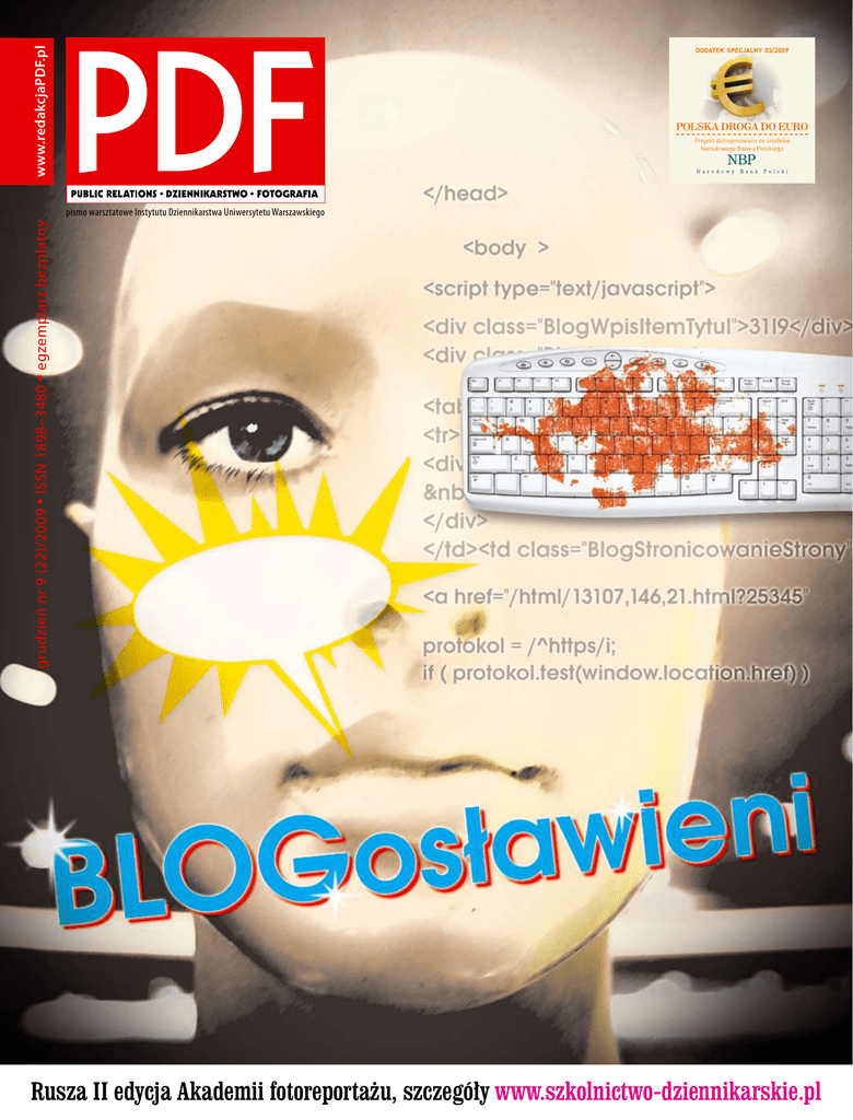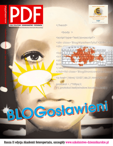 www.redakcjaPDF.pl DODATEK SPECJALNY 03/2009 POLSKA DROGA DO EURO Projekt dofinansowany ze środków Narodowego Banku Polskiego grudzień nr 9 (22)/2009 • ISSN 1898–3480 • egzemplarz bezpłatny pismo warsztatowe Instytutu Dziennikarstwa Uniwersytetu Warszawskiego Rusza II edycja Akademii fotoreportażu, szczegóły www.szkolnictwo-dziennikarskie.pl Naczelna strona Ale Na wejściu Karmiciele blogosfery dziennikarstwo numer! 03 Połączy czy podzieli środowisko dziennikarskie Grand Press 2009 oraz Press Club. 04–05 Zapisz to, Kisch! – rozmowa z Wojciechem Jagielskim o zawodzie reportera. kultura & społeczeństwo public relations euro foto raport staże 06 Puls redakcji – MaleMan. 07 W praktyce – praca w TV SLD. 08 –09 BLOGosławieni – czym są blogi, czym będą w przyszłości. 10 Czym jest diaporama? 11 Kolumna Zygmunta – zdjęcia w szczytnym celu. Zbigniew Żbikowski Zostać dziennikarzem? Nic prostszego. Jeszcze niedawno trzeba było w tym celu zatrudnić się w jakiejś redakcji lub przynajmniej nazwiązać z nią współpracę. Dziennikarz bowiem to ten, który nie tylko dociera gdzie trzeba i zbiera informacje, ale też je upowszechnia. Bez redakcji – prasowej, radiowej, telewizyjnej – było to zasadniczo niemożliwe. (Zasadniczo, bo konspira wiedziała, jak tę niedogodność omijać). Dzisiaj wystarczy założyć blog. I już się jest autorem, redaktorem i wydawcą w jednym. Dziennikarstwo to zawód otwarty. Nie trzeba kończyć specjalnych szkół, kursów i aplikacji, by przystąpić do czynności redakcyjnych. Internet wszystko łyknie, blog wszystko pomieści. W epoce fusion, kiedy wszystko z wszystkim można pomieszać i podać jako oryginalny projekt, produkt, strawę, materiał prasowy, nie trzeba nawet dbać o czystość gatunkową. Można pisać, co w duszy gra, łącząc news z felietonem, artykuł publicystyczny z reportażem, recenzję z wywiadem. Zawsze ktoś to przeczyta, jak nie rodzina, to znajomi, i skomentuje. A gdy takich blogów zaistnieje million, będzie się mówić o zjawisku. Blogowanie to już JEST zjawisko, które trudno ignorować. Zwłaszcza odkąd następuje coraz bardziej przybierająca na sile migracja autorów z mediów tradycyjnych do wirtualnej blogosfery. Chcesz zaistnieć? Pokaż się w telewizji i prasie. A chcesz zaistnieć naprawdę? Założ do tego swój blog. Taki jest wymóg czasów i jeśli jest od niego ucieczka, to tylko na pozycję outsidera. Nasi studenccy autorzy w „PDF” przyjrzeli się temu zjawisku i dostrzegli w nim kolosa o wielu wymiarach, a także groźnych cechach, ale przy okazji zauważyli też jego słabość. Owszem, jest on w stanie silnie wspierać kreację postaci, autorytetów, idei i zjawisk, ale sam z siebie nie kreuje indywidu- I-IV Co było przed euro? Orzeł Biały, Mikołaj Kopernik czy Stadion Narodowy na rewersie polskiego euro? Dodatek specjalny dofinansowany ze środków NBP. PLUS 12 PR na świecie, to nadal inny public relations niż polski. Różni się. Jak bardzo? Do końca nie wiem, czy grypa jest sytuacją kryzysową, ale wiem za to, że gdyby nie media, nie wiedzielibyśmy o grypie prawie nic. Dziennikarze serio potraktowali problem i w większości nie dali się skusić na to, by całość ujmować tak, jakby świat miał się niebawem skończyć. Daleko nam do sytuacji na Ukrainie, gdzie tamtejszy sztab kryzysowy ogłosił w pewnym momencie, że kończy z zapraszaniem dziennikarzy na codzienne briefingi, ponieważ powtarzają wciąż te same pytania, w związku z czym spotkania nie mają sensu. Nie wyobrażam sobie takiej sytuacji u nas z kilku powodów. Po pierwsze – żaden urzędnik nie zdecydowałaby się odciąć mediów od informacji, do których wszyscy obywatele powinni mieć dostęp. Po drugie – u nas dziennikarze stają na wysokości zadania i wymyślają takie pytania, że epidemiolodzy, immunolodzy i inni specjaliści są w kłopocie, by sprawnie na nie odpowiedzieć. Po trzecie – na szczęście – nasze służby sanitarne rozumieją, że dzięki mediom dotrą z ważnymi komunikatami do wszystkich, co byłoby wątpliwe w przypadku, gdyby sanepid chciał podstawowym środkiem komunikowania uczynić ulotki informacyjne o grypie, które drukuje z pomocą sieci spożywczej Lidl. Po którymś z kolei posiedzeniu komitetu ds. pandemii grypy minister Ewa Kopacz zorganizowała konferencję. Ona, główny epidemiolog kraju, główny inspektor sanitarny, krajowy konsultant ds. chorób zakaźnych i szefowa krajowego ośrodka ds. grypy przez ponad godzinę odpowiadali na pytania dziennikarzy. Bardzo precyzyjne pytania. Ile mamy łóżek na oddziałach zakaźnych, ile respiratorów na intensywnej terapii, jakie są zapasy leków antywirusowych, z kim resort negocjuje zakup szczepionki. Nie sądzę, by odpowiedzi na te pytania uspokoiły społeczeństwo, ale jestem pewna, że uświadomiły całemu sztabowi, że media patrzą im na ręce i jedynie udawanie, że coś się robi nie przejdzie. Nie tym razem. • 13 „Durczok Gate” – echa rzucania mięsem. 13 Pierwsza Parada Labradorów w wykonaniu Euro RSCG Sensors. 14–15 Książę i Żebrak 2009 – podsumowanie roku w kulturze. 16-18 Co warto zobaczyć, obejrzeć, posłuchać, przeczytać? Subiektywny (jak w każdej gazecie) przewodnik po świecie muzyki, teatru, filmu i książki. 19 Miejsce niezwykłe „Miasto gadających głów” 19 Bez względu na porę roku można wiosłować w klubach Gymnasiona zespół redakcyjny: Roksana Gowin, Magdalena Grzymkowska, Marcin Kasprzak, Paulina Pawlak, Julian Tomala, Julia Steffen, Magdalena Wasyłeczko, Wioletta Wysocka interesujesz się PR? Szukamy współpracowników. Kolegia redakcyjne, każda środa godz. 18:30 Instytut Dziennikarstwa UW, sala 313 (III piętro) Organizujesz spotkanie, festiwal, event, koncert? Napisz na adres: [email protected] Powiadomimy o tym studentów. | 02 | REDAKCJA redaktor naczelny: Zbigniew Żbikowski z-ca redaktora naczelnego Paweł H. 