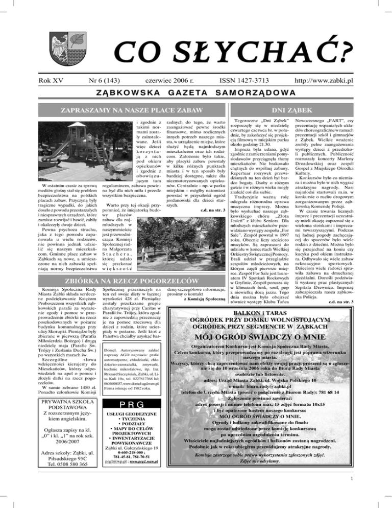 Rok XV Nr 6 (143) czerwiec 2006 r. ZĄBKOWSKA ISSN 1427-3713 G A Z E TA SAMORZĄDOWA Zapraszamy na nasze place zabaw W ostatnim czasie za sprawą mediów głośny stał się problem bezpieczeństwa na polskich placach zabaw. Przyczyną były tragiczne wypadki, do jakich doszło z powodu przestarzałych i niesprawnych urządzeń, które zamiast rozwijać i bawić, zabiły i okaleczyły dwoje dzieci. Pewna psychoza strachu, jaka z tego powodu zapa nowała u wielu rodziców, nie powinna jednak udzie lić się naszym mieszkań com. Gminne place zabaw w Ząbkach są nowe, a umiesz czone na nich zabawki speł niają normy bezpieczeństwa i zgodnie z takimi nor mami zosta ły zainstalo wane. Jeśli więc dzieci korzysta ją z nich pod okiem opiekunów i zgodnie z obowiązu jącym tam regulaminem, zabawa powin na być dla nich miła i przede wszystkim bezpieczna. Warto przy tej okazji przy pomnieć, że inicjatorką budo wy placów zabaw dla naj młodszych w naszym mieście jest przewodni cząca Komisji Społecznej rad na Małgorzata Stachera, której udało się przekonać większość radnych do tego, że warto zaangażować pewne środki finansowe, mimo rozlicznych innych potrzeb naszego mia sta, w urządzenie miejsc, które służyć będą najmłodszym mieszkańcom oraz ich rodzi com. Założenie było takie, aby placyki zabaw powstały w kilku różnych punktach miasta i w ten sposób były bardziej dostępne, także dla niezmotoryzowanych opieku nów. Centralnie – np. w parku miejskim – mógłby natomiast powstać w przyszłości ogród jordanowski dla dzieci star szych. c.d. na str. 3 Zbiórka na rzecz pogorzelców Komisja Społeczna Rady Miasta Ząbki składa serdecz ne podziękowanie Księżom Proboszczom wszystkich ząb kowskich parafii za wyraże nie zgody i pomoc w prze prowadzeniu zbiórki na rzecz poszkodowanych w pożarze budynku komunalnego przy ulicy Skorupki. Pieniądze były zbierane w pierwszą (Parafia Miłosierdzia Bożego) i drugą niedzielę maja (Parafie Św. Trójcy i Zesłania Ducha Św.) po wszystkich mszach św. Szczególne słowa wdzięczności kierujemy do Mieszkańców, którzy odpo wiedzieli na apel o pomoc i złożyli datki na rzecz pogo rzelców. W sumie zebrano 1450 zł. Ponadto członkowie Komisji Społecznej przeznaczyli na ten cel swoje diety w łącznej wysokości 428 zł. Pieniądze zostały przekazane grupie charytatywnej przy Caritas w Parafii św. Trójcy, która zgod nie z zapowiedzią przeznaczy je na pomoc rzeczową dla dzieci z rodzin, które ucier piały w pożarze. Jeśli ktoś z Państwa chciałby uzyskać bar PRYWATNA SZKOŁA PODSTAWOWA Z rozszerzonym językiem angielskim. PRG Ogłasza zapisy na kl. „0” i kl. „1” na rok szk. 2006/2007 Adres szkoły: Ząbki, ul. Piłsudskiego 95C Tel. 0508 580 365 Domel. Autoryzowany zakład naprawy AGD naprawia: pralki automatyczne, chłodziarki, chło dziarko-zamrażalki, zmywarki, kuchnie mikrofalowe, itp. Inż. Ryszard Szczęśniak, Ząbki, ul. Li sa Kuli 19a, tel. 0227817368 lub 0604688037, www.domel-agd.waw.pl. Firma istnieje od 1982 roku. USŁUGI GEODEZYJNE • TYCZENIA • PODZIAŁY • MAPY DO CELÓW PROJEKTOWYCH • INWENTARYZACJE POWYKONAWCZE Ząbki ul. Gałczyńskiego 19 0-605-218-000 ; 781-45-81, 781-70-51 [email protected] ; www.prg1.waw.pl http://www.zabki.pl dziej szczegółowe informacje, prosimy o kontakt z Komisją Społeczną Dni Ząbek Tegoroczne „Dni Ząbek” rozpoczęły się w niedzielę czwartego czerwca br. w połu dnie, by zakończyć się projek cją filmową w miejskim parku około godziny 21.30. Impreza była udana, gdyż zgodnie z zamierzeniami pomy słodawców przyciągnęła tłumy mieszkańców. Nie brakowało chętnych do wspólnej zabawy. Repertuar rozrywek przewi dzianych na ten dzień był bar dzo bogaty. Osoby o różnym guście i w różnym wieku mogły znaleźć coś dla siebie. Tradycyjnie ważną rolę odegrała różnorodna oprawa muzyczna imprezy. Można było wysłuchać naszego ząb kowskiego chóru „Złota Jesień” z klubu Seniora. Dla młodszych mieszkańców prze widziano występy zespołu „For Sale”. Zespół powstał w 1997 roku. Obecnie liczy sześcioro muzyków. Są zapraszani do udziału w koncertach Wielkiej Orkiestry Świątecznej Pomocy. Brali udział w przeglądzie zespołów młodzieżowych, na którym zajęli pierwsze miej sce. Zespół For Sale jest laure atem IV Spotkań Rockowych w Gryfinie, Zespół porusza się w klimatach funk, soul, pop z niewielką dozą jazzu. Tego dnia można było obejrzeć również występy Klubu Tańca Nowoczesnego „FART”, czy prezentację wspaniałych ukła dów choreograficzne w ramach prezentacji szkół i gimnazjów z Ząbek. Wielkie wrażenie zrobiły pełne zaangażowania występy dzieci z przedszko li publicznych. Publiczność rozruszały koncerty Marleny Drozdowskiej oraz zespół Gospel z Miejskiego Ośrodka Kultury. Konkursów było co niemia ra i można było w nich wygrać atrakcyjne nagrody. Nasi najmłodsi startowali m.in. w konkursie o ruchu drogowym zorganizowanym przez ząb kowską Komendę Policji. W czasie trwania licznych imprez i prezentacji uczestni cy mieli okazję zapoznać się z wieloma stoiskami i impreza mi towarzyszącymi. Podczas tej ładnej pogody zachęcają cej do spacerów było wiele rodzin z dziećmi. Można było się przejechać na koniu czy kucyku pod okiem instrukto ra. Odbywało się wiele zabaw rekreacyjno sportowych. Dzieciom wiele radości spra wiła zabawa na dmuchanej zjeżdżalni. Dorośli podziwia li wystawę prac plastycznych Szpitala Drewnica. Imprezę zabezpieczała nasza ząbkow ska Policja. c.d. na str. 3 BALKON i TARAS OGRÓDEK PRZY DOMKU WOLNOSTOJĄCYM OGRÓDEK PRZY SEGMENCIE W ZĄBKACH MÓJ OGRÓD ŚWIADCZY O MNIE Organizatorem Konkursu jest Komisja Społeczna Rady Miasta. Celem konkursu, który przeprowadzamy po raz drugi, jest poprawa wizerunku naszego miasta. Wszyscy, którzy chcą zaprezentować nam efekty swojej pracy, proszeni są o