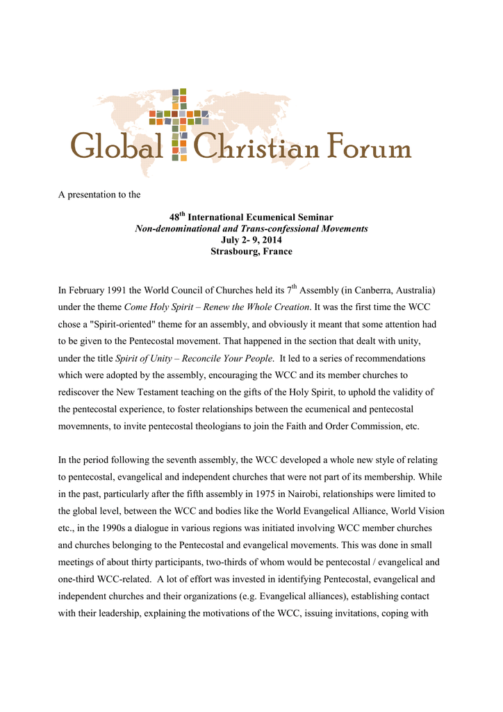 A presentation to the 48th International Ecumenical Seminar Non-denominational and Trans-confessional Movements July 2- 9, 2014 Strasbourg, France In February 1991 the World Council of Churches held its 7th Assembly (in Canberra, Australia) under the theme Come Holy Spirit – Renew the Whole Creation. It was the first time the WCC chose a "Spirit-oriented" theme for an assembly, and obviously it meant that some attention had to be given to the Pentecostal movement. That happened in the section that dealt with unity, under the title Spirit of Unity – Reconcile Your People. It led to a series of recommendations which were adopted by the assembly, encouraging the WCC and its member churches to rediscover the New Testament teaching on the gifts of the Holy Spirit, to uphold the validity of the pentecostal experience, to foster relationships between the ecumenical and pentecostal movemnents, to invite pentecostal theologians to join the Faith and Order Commission, etc. In the period following the seventh assembly, the WCC developed a whole new style of relating to pentecostal, evangelical and independent churches that were not part of its membership. While in the past, particularly after the fifth assembly in 1975 in Nairobi, relationships were limited to the global level, between the WCC and bodies like the World Evangelical Alliance, World Vision etc., in the 1990s a dialogue in various regions was initiated involving WCC member churches and churches belonging to the Pentecostal and evangelical movements. This was done in small meetings of about thirty participants, two-thirds of whom would be pentecostal / evangelical and one-third WCC-related. A lot of effort was invested in identifying Pentecostal, evangelical and independent churches and their organizations (e.g. Evangelical alliances), establishing contact with their leadership, explaining the motivations of the WCC, issuing invitations, coping with hesitations, fear and sometimes outright negative responses. The methodology used in the meetings was largely developed empirically. It was a mixture of the ecumenical way of working, with papers and discussion on issues, and testimonies and stories in the pentecostal – charismatic style. The main purpose was for participants from different faith traditions to get to know each other, to create some mutual trust between churches that had never been in conversation with one another, to address misunderstandings and prejudices and to encourage the continuation of the dialogue in local settings. This intensive exposure to the reality of the pentecostal and evangelical movements "on the ground" helped those who were involved on behalf of the WCC to begin building a network of relationships, and to become more aware of the changes in world Christianity in the twentieth century and their importance for the ecumenical movement, in particular the exponential growth of the Pentecostal movement. In the second half of the 1990s the WCC embarked on a major reflection process, together with its member churches, on the Common Understanding and Vision of the WCC (CUV). The focus of it was the deepening and widening of the concept of "fellowship of churches" as stated in the Basis of the WCC. Implied in the process was the recognition that a significant part of world Christianity was not part of the fellowship and could not be expected to join in any foreseeable future: the Roman Catholic Church, of course, but also the overwhelming majority of the Pentecostal, evangelical, independent and other newly emerging churches. Fifty years after its founding assembly (Amsterdam, 1948) and almost a century after the beginning of the modern ecumenical movement (Edinburgh, 1910), the WCC was facing an entirely new ecclesial global context. From a handful a hundred years earlier, the number of pentecostal Christians had grown to one quarter of world Christianity, equal to the number of Christians represented by the WCC itself. The vision of bringing together all the Christian churches in one community of faith, communion and witness, was much farther away from becoming true than the founders of the movement had hoped for. It was the awareness of this new reality which prompted the then General Secretary of the WCC, Rev. Dr. Konrad Raiser, to propose the idea of a Forum in which all the main Christian traditions, the old and the new, would be able to come together around the same table. Such a Forum would not replace the WCC, but would provide a new initiative towards achieving a goal that was now beyond the reach of the WCC as a membership organization. Here it is important to keep in mind that the ecumenical movement is broader than the WCC. Many national and regional conciliar bodies have churches in their membership which are not member of the WCC, including pentecostal and evangelical denominations. The Roman Catholic Church has become a major ecumenical player since the Second Vatican Council. It was therefore from the outset essential for the WCC to propose the Forum as a gathering of all the churches, all the Christian traditions, and not as a mechanism for dialogue between the WCC and the pentecostal and evangelical movements. In particular, the participation of the Roman Catholic Church was crucial. The first consultation on the Forum proposal, in 1998, was nothing else than a typical WCC meeting. It was held at the Bossey Ecumenical Institute. With the exception of one Catholic and one Pentecostal, all the forty or so participants were related to the WCC. The group did catch the Forum idea as a potential model for a more representative, more inclusive gathering of the main Christian families, based on participation, not membership. It stated the purpose in terms of unity, reconciliation and more inclusive relationships, and suggested to call together a large international meeting, "within a year or two" to launch the Forum. To this end a small Continuation Committee was set up. It did not take the Contin
