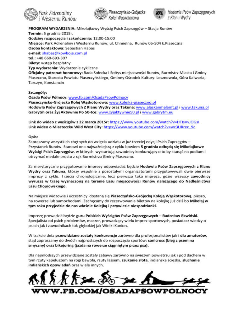 PROGRAM WYDARZENIA: Mikołajkowy Wyścig Psich Zaprzęgów – Stacja Runów Termin: 5 grudnia 2015r. Godziny rozpoczęcia i zakończenia: 12:00-15:00 Miejsce: Park Adrenaliny i Westernu Runów; ul. Chmielna, Runów 05-504 k.Piaseczna Osoba kontaktowa: Sebastian Habas e-mail: [email protected] tel.: +48 660-693-307 Bilety: wstęp bezpłatny Typ wydarzenia: Wydarzenie cykliczne Oficjalny patronat honorowy: Rada Sołecka i Sołtys miejscowości Runów, Burmistrz Miasta i Gminy Piaseczno, Starosta Powiatu Piaseczyńskiego, Gminny Ośrodek Kultury: Lesznowola, Góra Kalwaria, Tarczyn, Konstancin Szczegóły: Osada Psów Północy: www.fb.com/OsadaPsowPolnocy Piaseczyńsko-Grójecka Kolej Wąskotorowa: www.kolejka-piaseczno.pl Hodowla Psów Zaprzęgowych Z Klanu Wydry oraz Takuna: www.alaskanmalamt.pl i www.takuna.pl Gabrytm oraz Żyj Aktywnie Po 50-tce: www.zyjaktywnie50.pl i www.gabrytm.eu Link do wideo z wyścigów z 22 marca 2015r: https://www.youtube.com/watch?v=HTIsVvJOGsI Link wideo o Miasteczku Wild West City: https://www.youtube.com/watch?v=wc3URrec_9c Opis: Zapraszamy wszystkich chętnych do wzięcia udziału w już trzeciej edycji Psich Zaprzęgów – Przystanek Runów. Stanowi ona najważniejszą z cyklu bowiem 5 grudnia odbędą się Mikołajkowe Wyścigi Psich Zaprzęgów, w których wystartują zawodnicy konkurujący o to by stanąć na podium i otrzymać medale prosto z rąk Burmistrza Gminy Piaseczno. Za merytoryczne przygotowanie imprezy odpowiadać będzie Hodowla Psów Zaprzęgowych z Klanu Wydry oraz Takuna, którzy wspólnie z pozostałymi organizatorami przygotowywali dwie pierwsze imprezy z cyklu. Trzecia chronologicznie, lecz pierwsza taka impreza, gdzie wszyscy zawodnicy wyruszą w trasę wyznaczoną na terenie Lasu miejscowości Runów należącego do Nadleśnictwa Lasu Chojnowskiego. Na miejsce widzowie i uczestnicy dostaną się Piaseczyńsko-Grójecką Koleją Wąskotorową, pieszo, na rowerze lub samochodami. Zachęcamy do rezerwowania biletów na kolejkę już dziś bo Mikołaj w tym roku przyjedzie do nas właśnie Kolejką i przywiezie niespodzianki. Imprezę prowadzić będzie guru Polskich Wyścigów Psów Zaprzęgowych – Radosław Ekwiński. Specjalista od psich problemów, maszer, prowadzący wielu imprez sportowych, posiadacz wiedzy o psach jak i zawodnikach tak głębokiej jak Wielki Kanion. W trakcie dnia przewidziane zostały konkurencje zarówno dla profesjonalistów jak i dla amatorów, stąd zapraszamy do dwóch najprostszych do rozpoczęcia sportów: canicross (bieg z psem na smyczny) oraz bikejoring (jazda na rowerze ciągniętym przez psa). Dla najmłodszych przewidziane zostały zabawy zarówno na świeżym powietrzu jak i pod dachem w tym rzuty kapeluszem na rogi bawoła, rzuty lassem, szukanie złota, indiańska ścieżka, słuchanie indiańskich opowiadań oraz wiele innych. Troszkę starsi uczestnicy sprawdzą się w walce farmerów, Apaczów, rzutach podkową, piłowaniu piłą moja-twoja, wbijaniu gwoździ lewą ręką itp. Dla nich z pewnością celne oko przyda się przy strzelaniu z winchestera, z łuku, z procy. Każdy kto zechce poznać Piaseczyńsko-Grójecką Kolejkę Wąskotorową będzie mógł ją obejrzeć na stacji 200m od miejsca wyścigów lub porozmawiać o niej z obsługą pociągu na stoisku informacyjnym na rynku głównym na terenie ośrodka. Obok stoiska przewidziano ustawienie tradycyjnej drezyny ręcznej. Dla wszystkich cywilów o żyłce sportowca przewidujemy dodatkowo możliwość wzięcia udziału w „marszu z kijkami”, czyli NORDIC WALKING po okolicznym lesie Chojnowskim. Opieką fizjoterapeutyczną, urazową dla uczestników marszu zajmą się instruktorzy z Gabrytm oraz Fundacji Żyj Aktywnie Po 50-tce. Weźcie ze sobą kijki, na miejscu dostępna będzie limitowana ilość do wypożyczenia! Równolegle do prowadzonych atrakcji, przez cały dzień dostępne będę różne dodatkowo płatne atrakcje jak np. oprowadzanie na koniu, wybijanie monet metodą tradycyjną, wykonywanie pamiątkowych listów gończych, banknotów i buttonsów z własną podobizną i nie tylko. PROGRAM IMPREZY: 9:00 – Otwarcie bram ośrodka 9:00 – 10:00 Rejestracja zawodników, weryfikacja dokumentów 10:30 – Zamknięcie biura zawodów. 10:00 – 11:00 Odprawa weterynaryjna i techniczna 11:00 – Oficjalne rozpoczęcie zawodów i odprawa zawodników 11:00 – Pociąg wyrusza z Piaseczna, ze stacji głównej ul. Sienkiewicza 14 11:30 – Przyjazd pociągu do Runowa 12:00 – START PIERWSZEGO ZAPRZĘGU W WYŚCIGACH 13:00 – NORDIC WALKING z przewodnikiem po Lesie Chojnowskim CANICROSS (bieg z psem upiętym na smyczy z amortyzatorem) 14:30 – Podsumowanie wyników i wręczanie nagród dla uczestników 15:30 – Odjazd pociągu z Runowa do Piaseczna 15:45 –Przeniesienie się do Saloonu oraz zgromadzenie przy ogniskach (wieczór maszera) 17:00 – Zamknięcie bram ośrodka (lub do ostatniego gościa) OD RANA DO ZMIERZCHU: - Tematyczne gry i zabawy dla dzieci i młodzieży - Pozowanie do zdjęć z Psami Zaprzęgowymi - Nastrojowa muzyka - Strzelnica z winchesterami i łukami (dodatkowo płatna) - Przejazdy samochodami terenowymi (dodatkowo płatne) - Oprowadzanie na koniu (dodatkowo płatne) - Ciepłe i zimne przekąski (dodatkowo płatne) Więcej szczegółów na stronach: Szczegóły Kolej: http://www.kolejka-piaseczno.pl/ Szczegóły Osada Psów Północy: http://www.fb.com/OsadaPsowPolnocy Hodowla Psów Zaprzęgowych Z Klanu Wydry oraz Takuna: www.alaskanmalamt.pl i www.takuna.pl ZDJĘCIA: