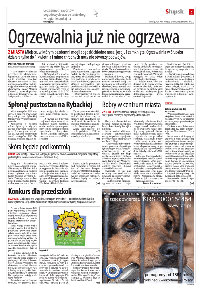 Codziennych raportów pogodowych oraz o stanie dróg w regionie szukaj na Słupsk 5 www.gp24.pl Głos Pomorza poniedziałek 8 kwietnia 2013 r. www.gp24.pl Ogrzewalnia już nie ogrzewa Z MIASTA Miejsce, w którym bezdomni mogli spędzić chłodne noce, jest już zamknięte. Ogrzewalnia w Słupsku działała tylko do 1 kwietnia i mimo chłodnych nocy nie otworzy podwojów. Dorota Aleksandrowicz [email protected] – Nie mamy w planach przedłużenia działalności ogrzewalni, gdyż nie mamy na to środków. Poza tym chcemy zadziałać na bezdomne osoby, które nadużywają alkoholu w sposób wychowawczy – mówi Mariusz Kajewski, prezes słupskiego oddziału Towarzystwa im. Świętego Brata Alberta. Jak stwierdza Kajewski, zdarzyło się tylko raz, że ogrzewalnia przedłużyła okres działalności. – Któregoś roku można było skorzystać z ogrzewalni o jeden dzień dłużej. Poza tym w okresie bardzo niskich temperatur przedłużaliśmy godziny pracy. Ogrzewalnia czynna jest zawsze tylko w nocy od godziny 20 do 7. W czasie silnych mrozów ten czas był wydłużony – oznajmia prezes słupskiego oddziału. Pomimo iż zima zaskoczyła wszystkich, Kajewski dodaje, że obecne temperatury nie są aż tak niskie. Poza tym jednym z podstawowych czynników, z powodu których ogrzewalnia nie przedłuży działalności o kilka lub kilkanaście dni, są ograniczenia finansowe. – Otrzymaliśmy 30 tysięcy na ten rok, czyli na okres Spłonął pustostan na Rybackiej Kilka zastępów PSP walczyło z ogniem trawiącym budynek przy ul. Rybackiej. Strażacy nie wykluczają podpalenia. Zgłoszenie o pożarze oficer dyżurny straży pożarnej otrzymał kwadrans przed 3 w nocy w czwartek. Na ul. Rybacką skierowano sześć zastępów PSP. Na miejscu okazało się, że po- żarem objęty był dach na całej powierzchni pustostanu. – Z uwagi że budynek znajdował się w zwartej zabudowie, nasze działania oprócz walki z ogniem polegały też na zabezpieczeniu sąsiednich budynków – mówi Grzegorz Falkowski, zastępca komendanta PSP w Słupsku. Zadecydowano również, że pustostan trzeba przeszukać. Obawiano się, że mogą w nim znajdować się bezdomni. Szczęśliwie nikogo nie znaleziono, a w zdarzeniu nikt nie ucierpiał. Akcję zakończono po trzech godzinach. PSP w Słupsku nie wyklucza, że doszło do podpalenia. (OLO) BADANIA W sobotę, 13 kwietnia, odbędą się pierwsze badania w ramach programu bezpłatnej profilaktyki w kierunku nowotworu – czerniaka skóry. wraz z ich oceną i zaleceniami dotyczącymi dalszego postępowania. Badania wykonuje doktor Józef Jasonek. – Pacjenci uczestniczący w akcji otrzymają zalecenia dotyczące dalszego postępowania – informuje Tadeusz Wardziak z kliniki Salus. zjeść ciepły posiłek. Na chwilę obecną w noclegowniach jest jeszcze ponad 40 wolnych miejsc, w tym tak zwanych dostawek. Warunek przyjęcia jest tylko jeden – trzeba być trzeźwym. – Zależy nam, aby zadziałać na te osoby wychowawczo, aby dały także coś od siebie, żeby zrobiły krok w kierunku zmiany swojego dotychczasowego życia – mówi Kajewski. Bobry w centrum miasta Skóra będzie pod kontrolą Program finansowany przez miasto Słupsk jest realizowany w klinice Salus przy ul. Zielonej. Na badania mogą zgłaszać się mieszkańcy Słupska w wieku 30– 50 lat. Zakres programu obejmuje badanie wideodermatoskopowe zmian skórnych zimy oraz listopad i grudzień, które za kilka miesięcy nadejdą. Nie stać nas na dodatkowe utrzymanie ogrzewalni – oznajmia. Bezdomni, którzy dotąd nadużywali alkoholu, będą musieli zmienić swój tryb życia. Aby się schronić przed chłodem, mogą zawsze skorzystać z bezpłatnej noclegowni, w której są o wiele lepsze warunki niż w ogrzewalni i można dodatkowo Rejestracja do programu pod numerem ogólnym 59 848 90 00 oraz bezpośrednim: 722 088 211. Liczba badań jest ograniczona – decyduje kolejność zgłoszeń. Badania będą w soboty kwietnia i maja. (NIK) ZWIERZĘTA Drzewa rosnące tuż przy rzece Słupi zostały ścięte przez zwierzęta, najprawdopodobniej bobry. Ślady ich obecności zauważyć można nieopodal budynków Szkoły Policji w Słupsku. Jak się dowiedzieliśmy od Mariana Wilczewskiego, okręgowego łowczego, jest to pierwszy tego przypadek w okolicach Słupi. – Oczywiście bobry na terenie powiatu słupskiego, lęborskiego, bytowskiego i człuchowskiego są od dawna, jednak na Słupi nigdy wcześniej ich nie było. Możliwe, że przywędrowały z rzeki Łupawy czy Wieprzy i zasiliły swoją obecnością okolicę centrum Słupska – mówi Wilczewski. Zwierzęta te są pod ochroną, państwo z kolei odpowiada za szkody spowodowane przez bobry. – Ludzie różnie mogą reagować na wieść o poja- wieniu się bobrów na Słupi. Wiadomo, przyrodnicy będą z tego powodu zadowoleni, bo pojawił się w naszej okolicy nowy gatunek. Natomiast właściciele łąk, gdzie znajduje się na przykład strumyk, na którym bobry zrobią tamę, z obecności tych zwierząt zadowoleni nie będą. Ich pola, obszary mogą zostać zalane i spowodować duże szkody – stwierdza Wilczewski. Zdaniem łowczego bobry to niejedyne rzadko spotykane zwierzęta, które przywędrowały ostatnio w okolice Słupska i leśnicy mogli je podziwiać w naszych okolicach. Jakiś czas temu pojawiały się u nas na przykład żubry. – Norki i szopy pracze z kolei są już u nas na stałe – mówi Wilczewski. DOROTA ALEKSANDROWICZ R Konkurs dla przedszkoli E K L A M Stwierdza on również, że część osób zdecydowała się, że spełni wymagania trzeźwości. – Codziennie prowadzimy z tymi ludźmi pogadanki i tłumaczymy im o skutkach nadużywania alkoholu. Przez te kilka lat mieliśmy pełny odzysk, czyli aż sto procent nawrócenia na trzeźwość – oznajmia prezes słupskiego oddziału Towarzystwa. d ZDROWIE Jelito grube zbadaj za darmo W słupskiej klinice Salus trwa akcja bezpłatnych badań kolonoskopowych w program