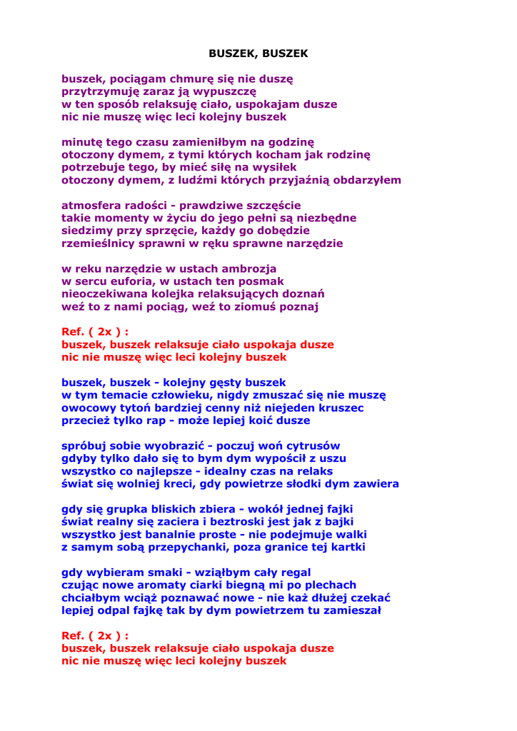 BUSZEK, BUSZEK buszek, pociągam chmurę się nie duszę przytrzymuję zaraz ją wypuszczę w ten sposób relaksuję ciało, uspokajam dusze nic nie muszę więc leci kolejny buszek minutę tego czasu zamieniłbym na godzinę otoczony dymem, z tymi których kocham jak rodzinę potrzebuje tego, by mieć siłę na wysiłek otoczony dymem, z ludźmi których przyjaźnią obdarzyłem atmosfera radości - prawdziwe szczęście takie momenty w Ŝyciu do jego pełni są niezbędne siedzimy przy sprzęcie, kaŜdy go dobędzie rzemieślnicy sprawni w ręku sprawne narzędzie w reku narzędzie w ustach ambrozja w sercu euforia, w ustach ten posmak nieoczekiwana kolejka relaksujących doznań weź to z nami pociąg, weź to ziomuś poznaj Ref. ( 2x ) : buszek, buszek relaksuje ciało uspokaja dusze nic nie muszę więc leci kolejny buszek buszek, buszek - kolejny gęsty buszek w tym temacie człowieku, nigdy zmuszać się nie muszę owocowy tytoń bardziej cenny niŜ niejeden kruszec przecieŜ tylko rap - moŜe lepiej koić dusze spróbuj sobie wyobrazić - poczuj woń cytrusów gdyby tylko dało się to bym dym wypościł z uszu wszystko co najlepsze - idealny czas na relaks świat się wolniej kreci, gdy powietrze słodki dym zawiera gdy się grupka bliskich zbiera - wokół jednej fajki świat realny się zaciera i beztroski jest jak z bajki wszystko jest banalnie proste - nie podejmuje walki z samym sobą przepychanki, poza granice tej kartki gdy wybieram smaki - wziąłbym cały regal czując nowe aromaty ciarki biegną mi po plechach chciałbym wciąŜ poznawać nowe - nie kaŜ dłuŜej czekać lepiej odpal fajkę tak by dym powietrzem tu zamieszał Ref. ( 2x ) : buszek, buszek relaksuje ciało uspokaja dusze nic nie muszę więc leci kolejny buszek