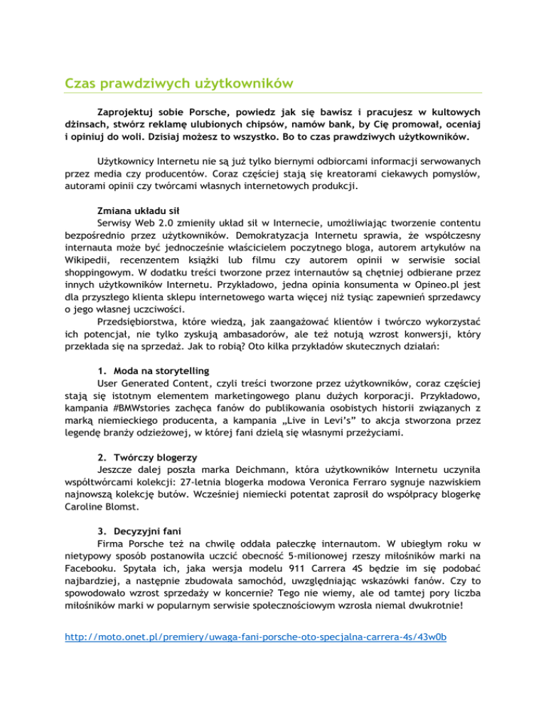 Czas prawdziwych użytkowników Zaprojektuj sobie Porsche, powiedz jak się bawisz i pracujesz w kultowych dżinsach, stwórz reklamę ulubionych chipsów, namów bank, by Cię promował, oceniaj i opiniuj do woli. Dzisiaj możesz to wszystko. Bo to czas prawdziwych użytkowników. Użytkownicy Internetu nie są już tylko biernymi odbiorcami informacji serwowanych przez media czy producentów. Coraz częściej stają się kreatorami ciekawych pomysłów, autorami opinii czy twórcami własnych internetowych produkcji. Zmiana układu sił Serwisy Web 2.0 zmieniły układ sił w Internecie, umożliwiając tworzenie contentu bezpośrednio przez użytkowników. Demokratyzacja Internetu sprawia, że współczesny internauta może być jednocześnie właścicielem poczytnego bloga, autorem artykułów na Wikipedii, recenzentem książki lub filmu czy autorem opinii w serwisie social shoppingowym. W dodatku treści tworzone przez internautów są chętniej odbierane przez innych użytkowników Internetu. Przykładowo, jedna opinia konsumenta w Opineo.pl jest dla przyszłego klienta sklepu internetowego warta więcej niż tysiąc zapewnień sprzedawcy o jego własnej uczciwości. Przedsiębiorstwa, które wiedzą, jak zaangażować klientów i twórczo wykorzystać ich potencjał, nie tylko zyskują ambasadorów, ale też notują wzrost konwersji, który przekłada się na sprzedaż. Jak to robią? Oto kilka przykładów skutecznych działań: 1. Moda na storytelling User Generated Content, czyli treści tworzone przez użytkowników, coraz częściej stają się istotnym elementem marketingowego planu dużych korporacji. Przykładowo, kampania #BMWstories zachęca fanów do publikowania osobistych historii związanych z marką niemieckiego producenta, a kampania „Live in Levi’s” to akcja stworzona przez legendę branży odzieżowej, w której fani dzielą się własnymi przeżyciami. 2. Twórczy blogerzy Jeszcze dalej poszła marka Deichmann, która użytkowników Internetu uczyniła współtwórcami kolekcji: 27-letnia blogerka modowa Veronica Ferraro sygnuje nazwiskiem najnowszą kolekcję butów. Wcześniej niemiecki potentat zaprosił do współpracy blogerkę Caroline Blomst. 3. Decyzyjni fani Firma Porsche też na chwilę oddała pałeczkę internautom. W ubiegłym roku w nietypowy sposób postanowiła uczcić obecność 5-milionowej rzeszy miłośników marki na Facebooku. Spytała ich, jaka wersja modelu 911 Carrera 4S będzie im się podobać najbardziej, a następnie zbudowała samochód, uwzględniając wskazówki fanów. Czy to spowodowało wzrost sprzedaży w koncernie? Tego nie wiemy, ale od tamtej pory liczba miłośników marki w popularnym serwisie społecznościowym wzrosła niemal dwukrotnie! http://moto.onet.pl/premiery/uwaga-fani-porsche-oto-specjalna-carrera-4s/43w0b 4. Zaangażowani konsumenci Kto z nas choć raz nie próbował szukać gotówki w promocyjnych paczkach chipsów? Uczestnik konkursu Doritos musi jednak zrobić coś więcej niż tylko kupić chipsy i zachować paragon. Musi się zaangażować — nakręcić własną wersję reklamy chipsów. Zwycięzca nie tylko zgarnie milion dolarów i emisję reklamy podczas transmisji Super Bowl, ale też zdobędzie wymarzoną pracę w Universal Pictures. Hasło: „Just make it awesome!” — w tym wypadku działa skuteczniej niż „kup pan chipsy…”. https://crashthesuperbowl.doritos.com/ 5. Marketingowy featuring made in Poland Mały mało może, ale w parze z dużym — może więcej. Dlatego duży bank — Idea Bank pomaga małym firmom — własnym klientom, wypromować ich działalność. „Zapraszając” przedsiębiorców do własnych reklam, jednocześnie pozycjonuje siebie jako bank, który „jest dumny ze swoich klientów”. Efekt: marketingowy featuring z korzyścią dla obu stron. http://www.ideabank.pl/duma-przedsiebiorcy 6. Opiniotwórczy użytkownicy Fenomen zjawiska Generacji C w Internecie nie ustaje. Według Cubestat.pl, serwis Opineo.pl dziennie odwiedza niemal 53 tysiące unikalnych użytkowników po to, żeby przeczytać lub samemu dodać opinię o sklepie internetowym. Podobnie serwis Lubimyczytać.pl, w którym użytkownicy dzielą się swoimi recenzjami na temat książek. Wymiana doświadczeń w niezależnych serwisach daje użytkownikom możliwość wyrażenia własnego zdania, a dla innych internautów stanowi cenną wskazówkę i konkretną pomoc w decyzjach zakupowych. http://www.opineo.pl/opinie/eastend-pl,neutralne Bardzo często rankingi powstałe w oparciu o recenzje użytkowników stanowią dla firm skuteczne narzędzie do budowania własnej wiarygodności i przewagi konkurencyjnej. Oceniane firmy wiedzą, że są na celowniku internautów i że opinie konsumentów mogą wynosić na szczyty lub zrzucać z piedestału. Sprytnie wykorzystują więc moment, kiedy są na szczycie. Do czego? Oczywiście do własnych działań promocyjnych i marketingowych: https://plus.google.com/+MoreleNetsklep/posts/eYwLVQh4SBP http://www.youtube.com/watch?v=s-rJFn5_s-Q Konsumenci, fani marki i autentyczni klienci są dziś bardziej opiniotwórczy niż kiedyś. Znają swoją wartość i są świadomi własnej siły oddziaływania. Inspirują więc firmy do nowych akcji marketingowych. Dzięki temu stają się nie tylko aktywnymi prosumentami, ale też mają realny wpływ na rozwój marek i działalność biznesową firm. Kontakt dla mediów: Katarzyna Maciaszczyk-Sobolewska PR & Marketing Manager Tel. 512 775 212 [email protected] www.opineo.pl Opineo.pl to największy w Polsce serwis gromadzący opinie konsumentów na temat sklepów internetowych, produktów i firm. Powstał w 2006 roku jako odpowiedź na dynamiczny rozwój rynku e–commerce, który wymusił na klientach konieczność weryfikacji jakości usług oferowanych przez tysiące polskich sprzedawców internetowych. Obok autentycznych recenzji klientów, udostępnia on również podstawowe informacje o sprzedawcach internetowych o