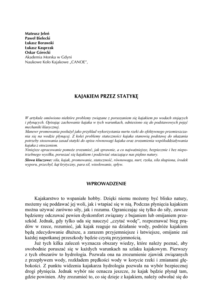 Mateusz Jeleń Paweł Bielecki Łukasz Borawski Łukasz Kasprzak Oskar Górecki Akademia Morska w Gdyni Naukowe Koło Kajakowe „CANOE”, KAJAKIEM PRZEZ STATYKĘ W artykule omówiono niektóre problemy związane z poruszaniem się kajakiem po wodach stojących i płynących. Opisując zachowanie kajaka w tych warunkach, odniesiono się do podstawowych pojęć mechaniki klasycznej. Manewr promowania posłużył jako przykład wykorzystania nurtu rzeki do efektywnego przemieszczania się na wodzie płynącej. Z kolei problemy stateczności kajaka stanowią podstawę do ukazania potrzeby stosowania zasad statyki do opisu równowagi kajaka oraz zrozumienia współoddziaływania kajaka z otoczeniem. Niniejsze opracowanie pomoże zrozumieć, jak sprawnie, a co najważniejsze, bezpiecznie i bez niepotrzebnego wysiłku, poruszać się kajakiem i podziwiać otaczające nas piękno natury. Słowa kluczowe: siła, kajak, promowanie, stateczność, równowaga, nurt, rzeka, siła skupiona, środek wyporu, przechył, kąt krytyczny, para sił, wiosłowanie, spływ. WPROWADZENIE Kajakarstwo to wspaniałe hobby. Dzięki niemu możemy być blisko natury, możemy się poddawać jej woli, jak i wtapiać się w nią. Podczas płynięcia kajakiem można używać zarówno siły, jak i rozumu. Ograniczając się tylko do siły, zawsze będziemy odczuwać pewien dyskomfort związany z bujaniem lub omijaniem przeszkód. Jednak, gdy tylko uda się nauczyć „czytać wodę”, rozpoznawać bieg prądów w rzece, rozumieć, jak kajak reaguje na działanie wody, podróże kajakiem będą zdecydowanie dłuższe, a zarazem przyjemniejsze i łatwiejsze, omijanie zaś każdej napotkanej przeszkody będzie czystą przyjemnością. Już tych kilka zaleceń wyznacza obszary wiedzy, które należy poznać, aby swobodnie poruszać się w każdych warunkach na szlaku kajakowym. Pierwszy z tych obszarów to hydrologia. Pozwala ona na zrozumienie zjawisk związanych z przepływem wody, rozkładem prędkości wody w korycie rzeki i zmianami głębokości. Z punktu widzenia kajakarza hydrologia pozwala na wybór bezpiecznej drogi płynięcia. Jednak wybór nie oznacza jeszcze, że kajak będzie płynął tam, gdzie powinien. Aby zrozumieć to, co się dzieje z kajakiem, należy odwołać się do 64 ZESZYTY NAUKOWE AKADEMII MORSKIEJ W GDYNI, nr 71, grudzień 2011 pojęć klasycznej mechaniki Newtona. Bazując na prawach Newtona, przyjmując nawet najprostsze modele ciał, można przewidywać z dużym prawdopodobieństwem zachowanie się kajaka. Jest oczywiste, że same prawa Newtona nie zrobią z nieudacznika rasowego kajakarza, lecz niewątpliwie zrozumienie zjawisk zachodzących podczas współoddziaływania wody i kajaka znacznie przyspiesza proces nauki kajakarstwa. Czyni ten proces bardziej świadomym i bezpiecznym chociażby poprzez ilościową ocenę oddziaływań wody na kajak. Podstawowym pojęciem w teorii Newtona jest siła. Pod pojęciem siły rozumieć trzeba oddziaływanie na siebie ciał. Rozpatrując ruch kajaka, należy uwzględnić: oddziaływanie wody na kadłub kajaka, oddziaływanie wody na wiosło, a także oddziaływanie powietrza i Ziemi [2]. Woda oddziałuje powierzchniowo na całe dno kajaka. Miarą tego działania jest ciśnienie hydrostatyczne. Oznacza to, że ciśnienie działające na dno jest większe w miejscach głębiej zanurzonych (rys. 1). Jednak tak prosta, liniowa zależność występuje tylko w przypadku spoczynku. Przy ruchu kajaka względem wody lub odwrotnie pojawiają się innego rodzaju oddziaływania powierzchniowe, związane ze zmianą względnej prędkości. Są to tzw. siły hydrodynamiczne. Efekt powstawania tych sił na powierzchni pióra wiosła wykorzystuje się przede wszystkim do napędzania kajaka, ale nie tylko. Podczas większości manewrów wykonywanych czy to za pomocą steru, czy też podczas stosowania specjalnych technik kajakowych, wykorzystuje się siły hydrodynamiczne. Należy tu również wspomnieć o oddziaływaniu powietrza na kajak. Jednak ze względu na to, że oddziaływanie to ma istotny wpływ na ruch kajaka tylko w określonych warunkach (duże otwarte akweny, np. jezioro, morze), w dalszych rozważaniach pominięto wpływ oddziaływania powietrza na zachowanie się kajaka. Nie można jednak pominąć oddziaływania Ziemi. Tu sytuacja jest nieco inna niż w przypadku wody. Ziemia oddziałuje na każdy element masy kajaka oraz jego zawartości [2]. Oznacza to, że siła ta nie działa na powierzchnię ciała, lecz na każdą cząstkę kajaka. W tym wypadku mowa jest o działaniu na kajak sił masowych. Rys. 1. Siły powierzchniowe i masowe Fig. 1. Surface and mass forces M. Jeleń, P. Bielecki, Ł. Borawski, Ł. Kasprzak, O. Górecki, Kajakiem przez statykę 65 Zazwyczaj podczas analizowania ruchu kajaka powierzchniowe oddziaływanie wody oraz masowe działanie Ziemi zastępuje się ekwiwalentnymi siłami skupionymi. Skutki ich działania powinny być takie same jak skutki działania sił rozłożonych po powierzchni i masie. Dotyczy to wartości, kierunku i punktu przyłożenia siły [2]. Statyczną siłę powierzchniową odziaływania wody na kajak zastępuje się jedną siłą skupioną W, zwaną wyporem (rys. 2). Zgodnie z prawem Archimedesa, wartość siły wyporu jest równa ciężarowi wypartej przez kajak cieczy. Siła ta jest przyłożona w geometrycznym środku zanurzonej części kajaka. Oznacza to, że gdy kajak kołysze się, to miejsce położenia środka wyporu może ulegać zmianie. Rys. 2. Siły skupione Fig. 2. Concentrated forces Z kolei oddziaływanie Ziemi zastępuje się siłą ciężkości P (rys. 2). Jest ona zaczepiona w środku ciężkości kajaka (wraz z zawartością) i skierowana pionowo w dół. Zgodnie z II prawem Newtona siłę tę określa zależność: P = m ⋅ g, (1) gdzie: m – masa kajaka, g – przyspieszenie ziemskie. Wreszcie siły powierzchniowe wynikające ze względnego ruchu kajaka i wody zastąpić należy sk