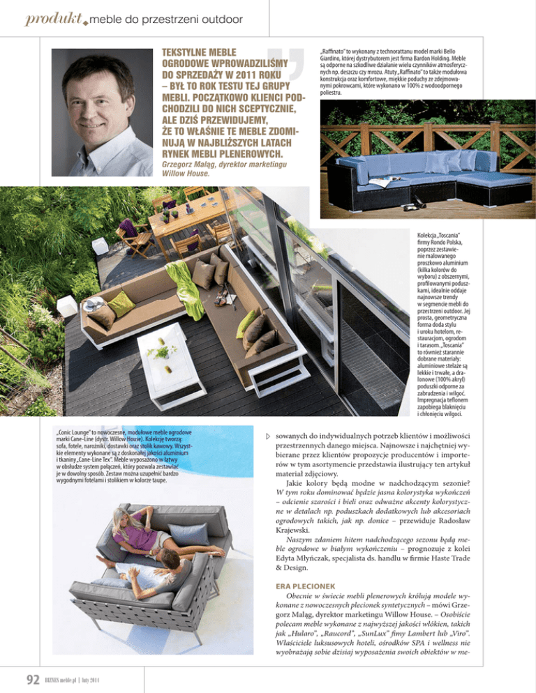 produktXmeble do przestrzeni outdoor TEKSTYLNE MEBLE OGRODOWE WPROWADZILIMY DO SPRZEDAY W2011 ROKU –BY TO ROK TESTU TEJ GRUPY MEBLI. POCZTKOWO KLIENCI PODCHODZILI DO NICH SCEPTYCZNIE, ALE DZI PRZEWIDUJEMY, E TO WANIE TE MEBLE ZDOMINUJ WNAJBLISZYCH LATACH RYNEK MEBLI PLENEROWYCH. „Raffinato” to wykonany z technorattanu model marki Bello Giardino, której dystrybutorem jest firma Bardon Holding. Meble są odporne na szkodliwe działanie wielu czynników atmosferycznych np. deszczu czy mrozu. Atuty „Raffinato” to także modułowa konstrukcja oraz komfortowe, miękkie poduchy ze zdejmowanymi pokrowcami, które wykonano w 100% z wodoodpornego poliestru. Grzegorz Malg, dyrektor marketingu Willow House. Kolekcja „Toscania” firmy Rondo Polska, poprzez zestawienie malowanego proszkowo aluminium (kilka kolorów do wyboru) z obszernymi, profilowanymi poduszkami, idealnie oddaje najnowsze trendy w segmencie mebli do przestrzeni outdoor. Jej prosta, geometryczna forma doda stylu i uroku hotelom, restauracjom, ogrodom i tarasom. „Toscania” to również starannie dobrane materiały: aluminiowe stelaże są lekkie i trwałe, a dralonowe (100% akryl) poduszki odporne za zabrudzenia i wilgoć. Impregnacja teflonem zapobiega blaknięciu i chłonięciu wilgoci. „Conic Lounge” to nowoczesne, modułowe meble ogrodowe marki Cane-Line (dystr. Willow House). Kolekcję tworzą: sofa, fotele, narożniki, dostawki oraz stolik kawowy. Wszystkie elementy wykonane są z doskonałej jakości aluminium i tkaniny „Cane-Line Tex”. Meble wyposażono w łatwy w obsłudze system połączeń, który pozwala zestawiać je w dowolny sposób. Zestaw można uzupełnić bardzo wygodnymi fotelami i stolikiem w kolorze taupe. f sowanych do indywidualnych potrzeb klientów i możliwości przestrzennych danego miejsca. Najnowsze i najchętniej wybierane przez klientów propozycje producentów i importerów w tym asortymencie przedstawia ilustrujący ten artykuł materiał zdjęciowy. Jakie kolory będą modne w nadchodzącym sezonie? W tym roku dominować będzie jasna kolorystyka wykończeń – odcienie szarości i bieli oraz odważne akcenty kolorystyczne w detalach np. poduszkach dodatkowych lub akcesoriach ogrodowych takich, jak np. donice – przewiduje Radosław Krajewski. Naszym zdaniem hitem nadchodzącego sezonu będą meble ogrodowe w białym wykończeniu – prognozuje z kolei Edyta Młyńczak, specjalista ds. handlu w firmie Haste Trade & Design. ERA PLECIONEK Obecnie w świecie mebli plenerowych królują modele wykonane z nowoczesnych plecionek syntetycznych – mówi Grzegorz Maląg, dyrektor marketingu Willow House. – Osobiście polecam meble wykonane z najwyższej jakości włókien, takich jak „Hularo”, „Raucord”, „SunLux” fimy Lambert lub „Viro”. Właściciele luksusowych hoteli, ośrodków SPA i wellness nie wyobrażają sobie dzisiaj wyposażenia swoich obiektów w me- 92 BIZNES meble.pl [ luty 2014