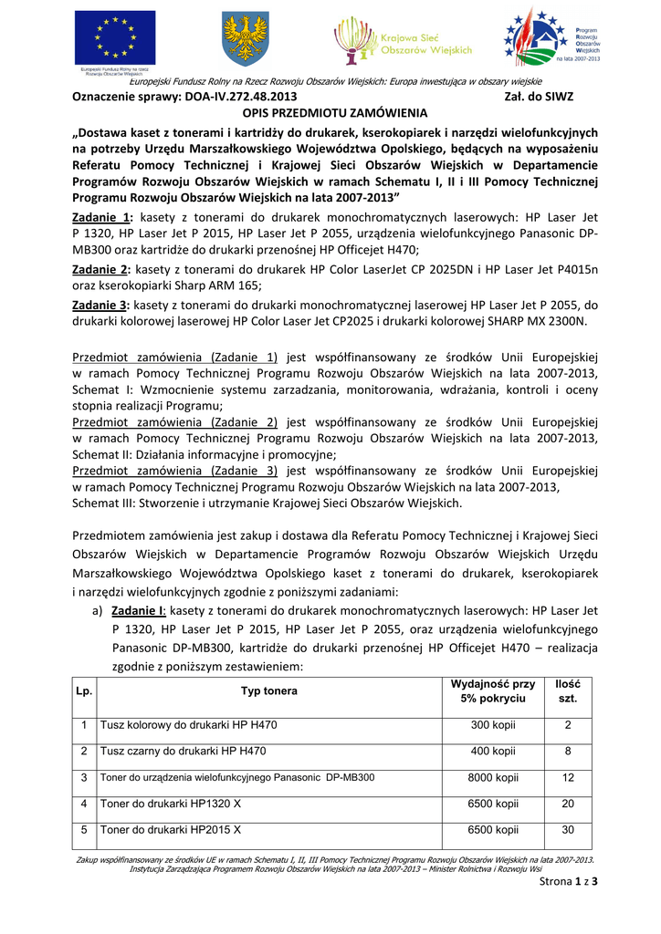 Europejski Fundusz Rolny na Rzecz Rozwoju Obszarów Wiejskich: Europa inwestująca w obszary wiejskie Oznaczenie sprawy: DOA-IV.272.48.2013 Zał. do SIWZ OPIS PRZEDMIOTU ZAMÓWIENIA „Dostawa kaset z tonerami i kartridży do drukarek, kserokopiarek i narzędzi wielofunkcyjnych na potrzeby Urzędu Marszałkowskiego Województwa Opolskiego, będących na wyposażeniu Referatu Pomocy Technicznej i Krajowej Sieci Obszarów Wiejskich w Departamencie Programów Rozwoju Obszarów Wiejskich w ramach Schematu I, II i III Pomocy Technicznej Programu Rozwoju Obszarów Wiejskich na lata 2007-2013” Zadanie 1: kasety z tonerami do drukarek monochromatycznych laserowych: HP Laser Jet P 1320, HP Laser Jet P 2015, HP Laser Jet P 2055, urządzenia wielofunkcyjnego Panasonic DPMB300 oraz kartridże do drukarki przenośnej HP Officejet H470; Zadanie 2: kasety z tonerami do drukarek HP Color LaserJet CP 2025DN i HP Laser Jet P4015n oraz kserokopiarki Sharp ARM 165; Zadanie 3: kasety z tonerami do drukarki monochromatycznej laserowej HP Laser Jet P 2055, do drukarki kolorowej laserowej HP Color Laser Jet CP2025 i drukarki kolorowej SHARP MX 2300N. Przedmiot zamówienia (Zadanie 1) jest współfinansowany ze środków Unii Europejskiej w ramach Pomocy Technicznej Programu Rozwoju Obszarów Wiejskich na lata 2007-2013, Schemat I: Wzmocnienie systemu zarzadzania, monitorowania, wdrażania, kontroli i oceny stopnia realizacji Programu; Przedmiot zamówienia (Zadanie 2) jest współfinansowany ze środków Unii Europejskiej w ramach Pomocy Technicznej Programu Rozwoju Obszarów Wiejskich na lata 2007-2013, Schemat II: Działania informacyjne i promocyjne; Przedmiot zamówienia (Zadanie 3) jest współfinansowany ze środków Unii Europejskiej w ramach Pomocy Technicznej Programu Rozwoju Obszarów Wiejskich na lata 2007-2013, Schemat III: Stworzenie i utrzymanie Krajowej Sieci Obszarów Wiejskich. Przedmiotem zamówienia jest zakup i dostawa dla Referatu Pomocy Technicznej i Krajowej Sieci Obszarów Wiejskich w Departamencie Programów Rozwoju Obszarów Wiejskich Urzędu Marszałkowskiego Województwa Opolskiego kaset z tonerami do drukarek, kserokopiarek i narzędzi wielofunkcyjnych zgodnie z poniższymi zadaniami: a) Zadanie I: kasety z tonerami do drukarek monochromatycznych laserowych: HP Laser Jet P 1320, HP Laser Jet P 2015, HP Laser Jet P 2055, oraz urządzenia wielofunkcyjnego Panasonic DP-MB300, kartridże do drukarki przenośnej HP Officejet H470 – realizacja zgodnie z poniższym zestawieniem: Lp. Typ tonera Wydajność przy 5% pokryciu Ilość szt. 1 Tusz kolorowy do drukarki HP H470 300 kopii 2 2 Tusz czarny do drukarki HP H470 400 kopii 8 3 Toner do urządzenia wielofunkcyjnego Panasonic DP-MB300 8000 kopii 12 4 Toner do drukarki HP1320 X 6500 kopii 20 5 Toner do drukarki HP2015 X 6500 kopii 30 Zakup współfinansowany ze środków UE w ramach Schematu I, II, III Pomocy Technicznej Programu Rozwoju Obszarów Wiejskich na lata 2007-2013. Instytucja Zarządzająca Programem Rozwoju Obszarów Wiejskich na lata 2007-2013 – Minister Rolnictwa i Rozwoju Wsi Strona 1 z 3 Europejski Fundusz Rolny na Rzecz Rozwoju Obszarów Wiejskich: Europa inwestująca w obszary wiejskie 6 Toner do drukarki HP2055 X 6500 kopii 30 Oznaczenia: X - powiększona kaseta z tonerem, Odpowiednie kolory: B – black, M – magenta, C – cyan, Y – yellow, b) Zadanie 2: kasety z tonerami do drukarek HP Color LaserJet CP 2025DN i HP Laser Jet P4015n oraz kserokopiarki Sharp ARM 165 – realizacja zgodnie z poniższym zestawieniem: Lp. Typ tonera Wydajność przy 5% pokryciu Ilość szt. 1 Toner do drukarki HP CP 2025 B 3500 kopii 6 2 Toner do drukarki HP CP 2025 C 2800 kopii 6 3 Toner do drukarki HP CP 2025 M 2800 kopii 6 4 Toner do drukarki HP CP 2025 Y 2800 kopii 6 5 Toner do drukarki HP P4015 B 10000 kopii 4 6 Toner do kserokopiarki Sharp ARM 165 B 16000 kopii 10 Oznaczenia: Odpowiednie kolory: B – black, M – magenta, C – cyan, Y – yellow, c) Zadanie 3: kasety z tonerami do drukarki monochromatycznej laserowej HP Laser Jet P 2055, do drukarki kolorowej laserowej HP Color Laser Jet CP2025 i drukarki kolorowej SHARP MX 2300N – realizacja zgodnie z poniższym zestawieniem: Lp. Typ tonera Wydajność przy 5% pokryciu Ilość szt. 1 Toner do drukarki SHARP MX 2300N B 18000 kopii 10 2 Toner do drukarki SHARP MX 2300N C 15000 kopii 10 3 Toner do drukarki SHARP MX 2300N M 15000 kopii 10 4 Toner do drukarki SHARP MX 2300N Y 15000 kopii 10 5 Toner do drukarki HP 2025 B 3500 kopii 10 6 Toner do drukarki HP 2025 C 2800 kopii 10 7 Toner do drukarki HP 2025 M 2800 kopii 10 8 Toner do drukarki HP 2025 Y 2800 kopii 10 Zakup współfinansowany ze środków UE w ramach Schematu I, II, III Pomocy Technicznej Programu Rozwoju Obszarów Wiejskich na lata 2007-2013. Instytucja Zarządzająca Programem Rozwoju Obszarów Wiejskich na lata 2007-2013 – Minister Rolnictwa i Rozwoju Wsi Strona 2 z 3 Europejski Fundusz Rolny na Rzecz Rozwoju Obszarów Wiejskich: Europa inwestująca w obszary wiejskie 9 Toner do drukarki HP 2055 X 6500 kopii 10 Oznaczenia: X- powiększona kaseta z tonerem . Odpowiednie kolory: B – black, M – magenta, C – cyan, Y – yellow Zamawiający wymaga oferowania produktów oryginalnych o min. parametrach podanych powyżej, tzn. wyprodukowanych przez producenta tego urządzenia, do którego dany materiał jest przeznaczony lub materiałów eksploatacyjnych równoważnych (fabrycznie nowych), pod warunkiem, że mają one min. parametry takie jak podane powyżej. Produkty równoważne muszą działać analogicznie jak produkty oryginalne producenta urządzeń i posiadać elementy elektroniczne dające komunikaty przy pracy w sieci, kasety z tonerem nie mogą powodować ograniczeń funkcji i możliwości sprzętu oraz pogorszenia jakości wydruku w warunkach technicznych opisanych przez producenta sprzętu. Zamawiający wymaga pełnej kompatybilności z oprogramowaniem drukarki (kaseta ma poprawnie zwracać informac