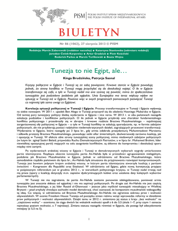Nr 86 (1062), 27 sierpnia 2013 © PISM . . . .. Redakcja: Marcin Zaborowski (redaktor naczelny) Katarzyna Staniewska (sekretarz redakcji) Jarosław Ćwiek-Karpowicz Artur Gradziuk Piotr Kościński Roderick Parkes Marcin Terlikowski Beata Wojna Tunezja to nie Egipt, ale… Kinga Brudzińska, Patrycja Sasnal Kryzysy polityczne w Egipcie i Tunezji są ze sobą powiązane. Krwawe starcia w Egipcie powodują jednak, że strony konfliktu w Tunezji mogą przychylać się do deeskalacji napięć. O ile w Egipcie transformacja się cofa, o tyle w Tunezji nadal ma ona szansę się powieść, mimo że społeczeństwo tunezyjskie jest podzielone podobnie jak egipskie. Unia Europejska ma teraz większy wpływ na sytuację w Tunezji niż w Egipcie. Powinna więc w swych programach pomocowych poświęcać Tunezji co najmniej tyle samo uwagi co Egiptowi. Korelacja sytuacji politycznej w Tunezji i Egipcie. Procesy transformacyjne w Tunezji i Egipcie wpływają na siebie nawzajem. W 2011 r. upadek Ben Alego w Tunezji przyczynił się do obalenia Hosniego Mubaraka w Egipcie. Od tamtej pory tunezyjscy politycy śledzą wydarzenia w Egipcie i vice versa. W 2013 r. w obu państwach nastąpiła eskalacja podziałów i konfliktów politycznych. O ile jednak w Egipcie przybrały one charakter fundamentalnego konfliktu politycznego i przeobraziły się w zbrojne i krwawe rozbicie Bractwa Muzułmańskiego – najsilniejszej zorganizowanej siły politycznej w Egipcie – o tyle w Tunezji konflikty te eskalują sporadycznie, np. w formie zabójstw politycznych, ale nie przybierają postaci radykalnie niedemokratycznych działań, zagrażających procesowi transformacji. Wydarzenia w Egipcie, które nastąpiły po 3 lipca br., gdy armia odebrała prezydenturę Muhammadowi Mursiemu i zdławiła protesty Bractwa Muzułmańskiego, powodując setki ofiar śmiertelnych, zbulwersowały zarówno koalicję, jak i opozycję w Tunezji. W efekcie obie strony tunezyjskiej sceny politycznej, mimo niedawnych zabójstw politycznych (w lutym br. zginął Szokri Belaid, przywódca Ruchu Demokratycznych Patriotów, a w lipcu br. Mohamed Brahmi, lider niewielkiej opozycyjnej partii) mających na celu zaognienie konfliktów, są skłonne do kompromisu i deeskalacji sporu między nimi samymi. Po wydarzeniach arabskiej wiosny w Egipcie i Tunezji w demokratycznych wyborach wygrały umiarkowane partie islamistyczne. Rządząca obecnie tunezyjska partia An-Nahda była w przeszłości ugrupowaniem nielegalnym, podobnie jak Bractwo Muzułmańskie w Egipcie. Jednak w odróżnieniu od Bractwa Muzułmańskiego, które samodzielnie rządziło państwem do lipca br., An-Nahda była zmuszona do przyjmowania rozwiązań kompromisowych. Tunezja jest bowiem jedynym krajem arabskiej wiosny, w którym partia islamistyczna stworzyła koalicję z partiami świeckimi – Kongresem dla Republiki oraz Ettakatol. W odróżnieniu od Egiptu, gdzie nową konstytucję przyjęto w pośpiesznym referendum już w grudniu 2012 r., w warunkach politycznego kryzysu, w Tunezji nadal trwają nad nią prace (spory z koalicją dotyczyły m.in. zapisów dyskryminujących kobiet oraz ustalenia daty kolejnych wyborów parlamentarnych). W Tunezji nie ma zagrożenia, że partia An-Nahda zostanie ponownie zdelegalizowana, ponieważ armia tunezyjska jest znacznie słabsza od egipskiej i nie ma aspiracji politycznych. Po drugie zaś An-Nahda nie jest częścią Bractwa Muzułmańskiego, a jej lider Raszid al-Ghannuszi – jeszcze jako myśliciel tunezyjski mieszkający w Wielkiej Brytanii – pisał artykuły chwalące zachodni model demokracji, choć zaznaczał, że komponent muzułmański wzbogaciłby tę ideę. Co więcej, w odróżnieniu od Bractwa Muzułmańskiego An-Nahda nie ogranicza zakresu praw i wolności obywatelskich. W ocenie Freedom House Tunezja od początku zmian reżimu wciąż wprowadza reformy w dziedzinie praw politycznych i wolności obywatelskich. Dzięki temu w 2012 r. zmieniono jej status z kraju „bez wolności” na „częściowo wolny” – oceniono, że ciągu dwóch lat wskaźnik wolności spadł z 6 do 3,5 (skala 1–7, przy czym 1 oznacza najwyższy poziom wolności, a 7 najniższy). Zmiana statusu nastąpiła również w Egipcie, ale postęp był zdecydowanie mniejszy (z 5,5 na 5). 1 Istnieje również małe prawdopodobieństwo, że tunezyjska armia mogłaby odegrać taką samą rolę, jaką odgrywa w swoim państwie armia egipska. W przeszłości armia tunezyjska nie angażowała się życie polityczne. W odróżnieniu od Egiptu doszło z sił bezpieczeństwa usunięto wojskowych lojalnych wobec byłego prezydenta. Znacznie ważniejszą rolę odgrywają w Tunezji związki zawodowe, a szczególnie Generalny Związek Zawodowy Tunezji (UGTT) liczący ponad 600 tys. członków, obecnie działający jako mediator między rządem a świecką opozycją. UGTT w większym stopniu niż armia wpływa na przyszły kształt polityczny państwa. Demokratyczna przyszłość Tunezji nie jest jednak jeszcze przesądzona, a rządząca umiarkowana partia islamistyczna będzie musiała przyspieszyć tempo reform politycznych i gospodarczych. Chodzi przede wszystkim o przedstawienie takiego projektu konstytucji, jaki mógłby być zaakceptowany przez opozycję. Wdrażanie reform jest utrudnione przez malejące poparcie dla rządu. Z badania opinii publicznej przeprowadzonego przez Instytut Gallupa wynika, że w porównaniu z lutym 2012 r. poparcie dla tunezyjskiego rządu spadło o 24% i w maju br. wyniosło jedynie 32%. Ponadto społeczeństwo tunezyjskie podobnie jak egipskie jest głęboko podzielone na zwolenników i przeciwników islamistów, przy czym – jak wynika z sondażu Arab Barometer z 2011 r. – większa część społeczeństwa tunezyjskiego to zwolennicy państwa świeckiego (69% Tunezyjczyków opowiedziało się za demokracją świecką, a 23% za islamską). Oznacza to, że jeśli An-Nahda utrzyma większość w koalicji, w krótkiej i średniej 