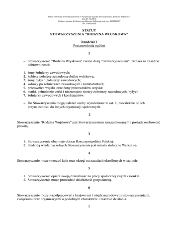 Statut zmieniony Uchwałą statutową IV Krajowego Zjazdu Stowarzyszenia „Rodzina Wojskowa” dnia 05.12.2003r. Zmiany wpisane do Krajowego Rejestru Sądowego pod poz. 0000204827 (dz.1 rubryka 4) STATUT STOWARZYSZENIA "RODZINA WOJSKOWA” Rozdział I Postanowienia ogólne 1 • Stowarzyszenie "Rodzina Wojskowa" zwane dalej "Stowarzyszeniem", zrzesza na zasadzie dobrowolności: 1. 2. 3. 4. 5. 6. 7. żony żołnierzy zawodowych; kobiety pełniące zawodową służbę wojskową; żony byłych żołnierzy zawodowych; wdowy po żołnierzach zawodowych i kombatantach; pracownice wojska oraz żony pracowników wojska; matki, pełnoletnie córki i niezamężne siostry żołnierzy zawodowych, byłych żołnierzy zawodowych i kombatantów. • Do Stowarzyszenia mogą należeć osoby wymienione w ust. 1, niezależnie od ich przynależności do innych organizacji społecznych. 2 Stowarzyszenie "Rodzina Wojskowa" jest Stowarzyszeniem zarejestrowanym i posiada osobowość prawną. 3 1. Stowarzyszenie obejmuje obszar Rzeczypospolitej Polskiej. 2. Siedzibą władz naczelnych Stowarzyszenia jest miasto stołeczne Warszawa. 4 Stowarzyszenie może tworzyć koła oraz okręgi na zasadach określonych w statucie. 5 1. Stowarzyszenie opiera swoją działalność na pracy społecznej swych członkiń. 2. Stowarzyszenie może prowadzić działalność gospodarczą. 6 Stowarzyszenie może współpracować z krajowymi i międzynarodowymi stowarzyszeniami, związkami oraz organizacjami o podobnym charakterze i zakresie działania. 7 1. Stowarzyszenie może używać odznak organizacyjnych i pieczęci, według wzorów zatwierdzonych przez Zjazd Stowarzyszenia. 2. Rada Naczelna może posiadać sztandar. Rozdział II Cele Stowarzyszenia i sposoby ich realizacji 8 Celem Stowarzyszenia jest: 1. upowszechnianie w środowisku wojskowym tradycyjnych wartości wychowania w rodzinie; 2. udzielanie pomocy oraz działanie na rzecz poprawy warunków socjalno-bytowych, zdrowotnych i społecznych życia rodzin żołnierzy zawodowych, byłych żołnierzy zawodowych, pracowników wojska i wdów po żołnierzach zawodowych; 3. upowszechnianie kultury i umacnianie w środowisku rodzin wojskowych postaw patriotycznych i obywatelskich; stymulowanie procesu aktywizacji społecznej i kulturalnej oraz integracji rodzin wojskowych ze środowiskiem cywilnym; 4. przedstawianie władzom wojskowym oraz organom administracji państwowej i samorządowej problemów środowiska rodzin wojskowych i propozycji ich rozwiązania. 5. działalność społecznie użyteczna w sferze zadań publicznych na rzecz ogółu społeczności oraz członkiń Stowarzyszenia i ich rodzin. 9 Cele swoje Stowarzyszenie realizuje poprzez: 1. propagowanie i rozwijanie działalności kulturalnej w garnizonach, organizowanie imprez kulturalnych, oświatowych, rozrywkowych i rekreacyjnych; 2. współdziałanie w pracach wojskowych ośrodków kultury i organizacji społecznych, działających w środowisku wojskowym; 3. kształtowanie postaw obywatelskich i patriotycznych kobiet, dzieci i młodzieży poprzez upowszechnianie tradycji narodowych; 4. inspirowanie, upowszechnianie i organizowanie racjonalnego wypoczynku rodzin kadry zawodowej i pracowników wojska, w szczególności dzieci i młodzieży, propagowanie uczestnictwa rodzin wojskowych w ruchu turystyczno-krajoznawczym, kulturalnym, oświatowym i sportowym; 5. współpracę z instytucjami i organizacjami funkcjonującymi w wojsku, działającymi na rzecz poprawy warunków życia środowiska rodzin wojskowych; 6. prowadzenie różnorodnych form działalności edukacyjnej, poradnictwa prawno-społecznego i doradztwa zawodowego dla rodzin ze środowiska wojskowego; 7. organizowanie i udzielanie pomocy koleżeńskiej, prowadzenie działalności charytatywnej na rzecz potrzebujących wsparcia rodzin wojskowych i cywilnych; 8. inspirowanie i popieranie inicjatyw gospodarczych kobiet środowiska wojskowego, mogących przyczynić się do realizacji celów statutowych Stowarzyszenia, na zasadach określonych w obowiązujących przepisach prawnych; 9. upowszechnianie profilaktyki zdrowotnej i ekologicznej oraz podejmowanie prób przeciwdziałania zjawiskom patologii społecznej w środowisku rodzin wojskowych, w tym popularyzowanie wydawnictw pomocnych w organizowaniu poradnictwa; 10.popularyzowanie dorobku Stowarzyszenia poprzez prowadzenie działalności publicystycznej, wydawniczej i innej; 11.stymulowanie członkiń Stowarzyszenia do uczestnictwa w pracach samorządów lokalnych; 12.inspirowanie i organizowanie przedsięwzięć służących integracji wojskowych i cywilnych środowisk lokalnych; 13.współdziałanie z innymi stowarzyszeniami, związkami, organizacjami i instytucjami w kraju i za granicą; 14.informowanie władz wojskowych i organów administracji państwowej o potrzebach, problemach i trudnościach środowiska rodzin wojskowych, wymagających zaspokojenia lub rozwiązania. 15.działania na rzecz osób niepełnosprawnych; 16.upowszechniania i ochrony praw kobiet oraz działalność na rzecz równych praw kobiet i mężczyzn; 17.nauki, edukacji, oświaty i wychowania; 18.pomocy ofiarom katastrof, klęsk żywiołowych, konfliktów zbrojnych i wojen w kraju i za granicą; 19.działań na rzecz integracji europejskiej oraz rozwijania kontaktów i współpracy między społeczeństwami; 20.upowszechniania wiedzy i umiejętności na rzecz obronności państwa; 21.przeciwdziałania bezrobociu. Rozdział III Członkowie, ich prawa i obowiązki 10 1. Członkowie Stowarzyszenia dzielą się na: • • • członkinie zwyczajne członkinie honorowe członków wspierających 1. Członkinią zwyczajną Stowarzyszenia może być każda kobieta wymieniona w 1, która akceptuje założenia programowe Stowarzyszenia, pragnie wnieść wkład swojej pracy w urzeczywistnienie jego celów, posiada pełną zdolność do czynności prawnych, nie jest pozbawiona praw publicznych. 2. Członkini zwyczajna przyjmowana jest przez ko