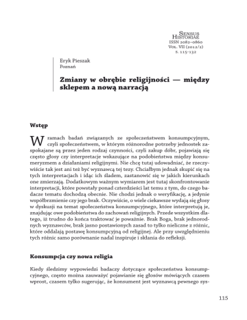 SENSUS HISTORIAE ISSN 2082–0860 Vol. VII (2012/2) s. 115-132 Eryk Pieszak Poznań Zmiany w obrębie religijności — między sklepem a nową narracją Wstęp W ramach badań związanych ze społeczeństwem konsumpcyjnym, czyli społeczeństwem, w którym różnorodne potrzeby jednostek zaspokajane są przez jeden rodzaj czynności, czyli zakup dóbr, pojawiają się często głosy czy interpretacje wskazujące na podobieństwa między konsumeryzmem a działaniami religijnymi. Nie chcę tutaj udowadniać, że rzeczywiście tak jest ani też być wyznawcą tej tezy. Chciałbym jednak skupić się na tych interpretacjach i idąc ich śladem, zastanowić się w jakich kierunkach one zmierzają. Dodatkowym ważnym wymiarem jest tutaj skonfrontowanie interpretacji, które powstały ponad czterdzieści lat temu z tym, do czego badacze tematu dochodzą obecnie. Nie chodzi jednak o weryfikację, a jedynie współbrzmienie czy jego brak. Oczywiście, o wiele ciekawsze wydają się głosy w dyskusji na temat społeczeństwa konsumpcyjnego, które interpretują je, znajdując owe podobieństwa do zachowań religijnych. Przede wszystkim dlatego, iż trudno do końca traktować je poważnie. Brak Boga, brak jednorodnych wyznawców, brak jasno postawionych zasad to tylko nieliczne z różnic, które oddalają postawę konsumpcyjną od religijnej. Ale przy uwzględnieniu tych różnic samo porównanie nadal inspiruje i skłania do refleksji. Konsumpcja czy nowa religia Kiedy śledzimy wypowiedzi badaczy dotyczące społeczeństwa konsumpcyjnego, często można zauważyć pojawianie się głosów mówiących czasem wprost, czasem tylko sugerując, że konsument jest wyznawcą pewnego sys115 Eryk Pieszak temu wierzeń czy też, że uległ kolejnemu zaczarowaniu świata. Oznacza to, iż w mniejszym lub większym stopniu konsument kieruje się wiarą w to, że konsumpcja i wolny rynek są jedynym uprawomocnionym sposobem postrzegania rzeczywistości społeczno-kulturowej. Daniel Bell zauważa, że proces ten zaczyna się o wiele szybciej i przybiera postać pewnej utopii zastępczej. Społeczeństwo nowoczesne zastąpiło religię przez utopię. Utopię, która nie jest transcendentalnym ideałem, lecz poczętym przez technikę, a powitym przez rewolucję celem, jaki realizuje historia (postęp, racjonalność, nauka).1 Myśliciel upatruje przyczyn wyparcia czy zastąpienia religii w działaniach związanych z rozwojem techniki oraz tym co, ona spowodowała. Modernistyczny ideał rozumu został wyparty przez rozwój techniczny, który jest tak naprawdę konsekwencją wiary w rozum. Sam Bell traktuje jednak modernizm w trochę inny sposób. Tradycyjny modernizm — pisze — usiłował zastąpić religię i moralność estetycznym uzasadnieniem życia. Stworzyć dzieło sztuki, być dziełem sztuki — to jedyne, co daje sens ludzkiemu wysiłkowi wykraczania poza siebie. Jednakże, co oczywiste u Nietzschego, poszukiwanie własnych korzeni kieruje modernistyczne zainteresowania od sztuki ku psychologii: od wytworu sztuki do wytwórcy, od przedmiotu ku psyche.2 Mamy więc ideał estetyczny, który kieruje nasze zainteresowania w kierunku podmiotu i jego „psyche”. Ważne jest jednak dalsze skierowanie uwagi człowieka na możliwości techniczne. Technika, czyli zrozumienie technicznych zasad rządzących światem i możliwość ich przeniesienia na działania prowadzące do opanowania tego świata, stały się olśniewającą wizją nadprzyrodzonej władzy lub wyjaśnieniem, które wskazuje, że nic nadprzyrodzonego nie istnieje. Można jeszcze dodać za Bellem: Słownictwo współczesne ma charakter czysto racjonalny, a jedynym jego układem odniesienia są wzory matematyczne. W nowożytnej kosmologii (podobnie jak w fizyce, a dziś i w innych naukach) pożegnano się z poglądowością i ze słowami: poza elegancją, która ma charakter formalny, liczą się tylko abstrakcyjne wzory matematyczne. Za wzorami tymi nie stoi już jak poprzednio wieczne, niezmienne, uniwersalne, dające się wyróżnić prawo natury, lecz nieokreśloność i brak porządku czasoprzestrzennego.3 1 D. Bell, Kulturowe sprzeczności kapitalizmu, przeł. S. Amsterdamski, Wydawnictwo Naukowe PWN, Warszawa 1998, s. 65. 116 2 Ibidem, s. 86. 3 Ibidem, s. 135. Zmiany w obrębie religijności Wiara w tę wizję świata jest więc wiarą w porządek nieuprawomocniony. Z jednej strony człowiek dostaje coś stałego, z drugiej jednak nie ma tej samej pewności, którą dawała tradycyjna religia zanim zaczęto ją podważać. Wiara wymaga silnej podstawy, tutaj jednak ta silna podstawa została wytrącona. Można wierzyć, ale postęp powoduje, że za każdym nowym odkryciem pojawia się wciąż więcej pytań i nic, do czego można byłoby się zwrócić jako do instancji ostatecznej. Na czym więc polega ten nowy sposób organizacji rzeczywistości w umysłach jednostek? Na odpowiedniej strukturze, której podstawą są nauki ścisłe oraz na odpowiednim słownictwie. Tak więc nasze słownictwo wzmacnia abstrakcyjny, a może nawet mistyczny, charakter wizji świata. Na tym też polega ostateczna rozbieżność świata codziennego doświadczenia i świat pojęć.4 Świat pojęć staje się światem mistycznym, którego podstawowym wyznacznikiem stała się możliwość przekładu wiedzy na możliwości techniczne. Według D. Bella techne poszerza władzę człowieka. Potrafimy zarazem wytworzyć coraz więcej różnych dóbr i przekształcić przyrodę. W tym układzie struktura społeczna (porządek techniczno-ekonomiczny) oparta jest na zasadzie zmiany i kumulacji. Jej wyznacznikami są: koncepcja wydajności, technicznej skuteczności i funkcjonalnej racjonalności — kierujemy się tymi zasadami w wytwarzaniu zasobów, w ramach określonego przez dane społeczeństwo systemu wartości. W tej mierze w jakiej człowiek coraz bardziej uniezależnia się od przyrody, dysponuje środkami budowy takiego społeczeństwa jakiego pragnie