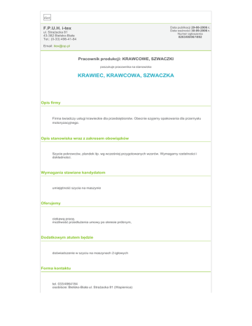 praca, oferty pracy Data publikacji 29-08-2006 r. Data ważności 30-09-2006 r. Numer ogłoszenia 8263/08/06/1892 F.P.U.H. i-tex ul. Strażacka 81 43-382 Bielsko-Biała Tel.: (0-33) 496-41-84 Email: [email protected] Pracownik produkcji: KRAWCOWE, SZWACZKI poszukuje pracownika na stanowisko KRAWIEC, KRAWCOWA, SZWACZKA Opis firmy Firma świadczy usługi krawieckie dla przedsiębiorstw. Obecnie szyjemy opakowania dla przemysłu motoryzacyjnego. Opis stanowiska wraz z zakresem obowiązków Szycie pokrowców, plandek itp. wg wcześniej przygotowanych wzorów. Wymagamy rzetelności i dokładności. Wymagania stawiane kandydatom umiejętność szycia na maszynie Oferujemy ciekawą pracę, możliwość przedłużenia umowy po okresie próbnym, Dodatkowym atutem będzie doświadczenie w szyciu na maszynach 2-igłowych Forma kontaktu tel. 033/4964184 osobiście: Bielsko-Biała ul. Strażacka 81 (Wapienica) Informacje dodatkowe Minimalne wykształcenie: dowolne Branża: Produkcja Forma zatrudnienia: umowa o pracę Wymiar pracy: pełny etat Wynagrodzenie (netto): nie podano Lokalizacja: Polska Województwo: małopolskie, śląskie, Miejsce pracy miasto(a) lub kraj(e): Bielsko-Biała Prawo jazdy: Znajomość języka obcego: Ogłoszenie pochodzi z portalu www.i-praca.pl - Internetowy Portal Pracy ilość wyświetleń: 4708