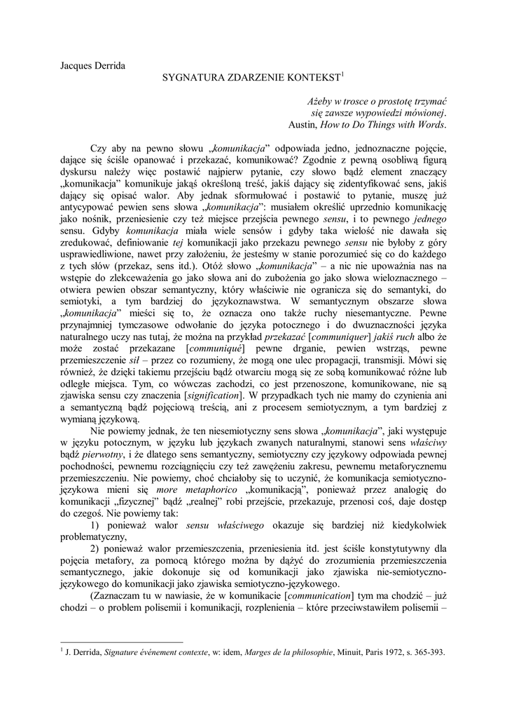 Jacques Derrida SYGNATURA ZDARZENIE KONTEKST1 Ażeby w trosce o prostotę trzymać się zawsze wypowiedzi mówionej. Austin, How to Do Things with Words. Czy aby na pewno słowu „komunikacja” odpowiada jedno, jednoznaczne pojęcie, dające się ściśle opanować i przekazać, komunikować? Zgodnie z pewną osobliwą figurą dyskursu należy więc postawić najpierw pytanie, czy słowo bądź element znaczący „komunikacja” komunikuje jakąś określoną treść, jakiś dający się zidentyfikować sens, jakiś dający się opisać walor. Aby jednak sformułować i postawić to pytanie, muszę już antycypować pewien sens słowa „komunikacja”: musiałem określić uprzednio komunikację jako nośnik, przeniesienie czy też miejsce przejścia pewnego sensu, i to pewnego jednego sensu. Gdyby komunikacja miała wiele sensów i gdyby taka wielość nie dawała się zredukować, definiowanie tej komunikacji jako przekazu pewnego sensu nie byłoby z góry usprawiedliwione, nawet przy założeniu, że jesteśmy w stanie porozumieć się co do każdego z tych słów (przekaz, sens itd.). Otóż słowo „komunikacja” – a nic nie upoważnia nas na wstępie do zlekceważenia go jako słowa ani do zubożenia go jako słowa wieloznacznego – otwiera pewien obszar semantyczny, który właściwie nie ogranicza się do semantyki, do semiotyki, a tym bardziej do językoznawstwa. W semantycznym obszarze słowa „komunikacja” mieści się to, że oznacza ono także ruchy niesemantyczne. Pewne przynajmniej tymczasowe odwołanie do języka potocznego i do dwuznaczności języka naturalnego uczy nas tutaj, że można na przykład przekazać [communiquer] jakiś ruch albo że może zostać przekazane [communiqué] pewne drganie, pewien wstrząs, pewne przemieszczenie sił – przez co rozumieny, że mogą one ulec propagacji, transmisji. Mówi się również, że dzięki takiemu przejściu bądź otwarciu mogą się ze sobą komunikować różne lub odległe miejsca. Tym, co wówczas zachodzi, co jest przenoszone, komunikowane, nie są zjawiska sensu czy znaczenia [signification]. W przypadkach tych nie mamy do czynienia ani a semantyczną bądź pojęciową treścią, ani z procesem semiotycznym, a tym bardziej z wymianą językową. Nie powiemy jednak, że ten niesemiotyczny sens słowa „komunikacja”, jaki występuje w języku potocznym, w języku lub językach zwanych naturalnymi, stanowi sens właściwy bądź pierwotny, i że dlatego sens semantyczny, semiotyczny czy językowy odpowiada pewnej pochodności, pewnemu rozciągnięciu czy też zawężeniu zakresu, pewnemu metaforycznemu przemieszczeniu. Nie powiemy, choć chciałoby się to uczynić, że komunikacja semiotycznojęzykowa mieni się more metaphorico „komunikacją”, ponieważ przez analogię do komunikacji „fizycznej” bądź „realnej” robi przejście, przekazuje, przenosi coś, daje dostęp do czegoś. Nie powiemy tak: 1) ponieważ walor sensu właściwego okazuje się bardziej niż kiedykolwiek problematyczny, 2) ponieważ walor przemieszczenia, przeniesienia itd. jest ściśle konstytutywny dla pojęcia metafory, za pomocą którego można by dążyć do zrozumienia przemieszczenia semantycznego, jakie dokonuje się od komunikacji jako zjawiska nie-semiotycznojęzykowego do komunikacji jako zjawiska semiotyczno-językowego. (Zaznaczam tu w nawiasie, że w komunikacie [communication] tym ma chodzić – już chodzi – o problem polisemii i komunikacji, rozplenienia – które przeciwstawiłem polisemii – 1 J. Derrida, Signature événement contexte, w: idem, Marges de la philosophie, Minuit, Paris 1972, s. 365-393. i komunikacji. W pewnym momencie będzie się musiało pojawić pewne pojęcie pisma, by się przekształcić i, być może, przekształcić problematykę). Wydaje się zrozumiałe samo przez się, że obszar dwuznaczności słowa „komunikacja” daje się znacznie zawęzić granicami tego, co zwiemy kontekstem (i znów zaznaczam w nawiasie, że w komunikacie tym będzie chodziło o problem kontekstu oraz o to, jak rzecz się ma z pismem w odniesieniu do kontekstu w ogóle). Na przykład podczas konferencji dotyczącej filozofii języka francuskiego pewien konwencjonalny kontekst, wytworzony przez swego rodzaju niejawny, ale strukturalnie mglisty konsensus, wymaga, jak się wydaje, byśmy przedstawili „komunikaty” o komunikacji, komunikaty w formie dyskursywnej, komunikaty konferencyjne, ustne, przeznaczone do słuchania, mające skłonić do rozpoczęcia bądź kontynuowania rozmów w horyzoncie pewnej inteligibilności i pewnej prawdy sensu, tak aby de iure mogło ostatecznie zapanować ogólne porozumienie. Komunikaty te powinny się sytuować w żywiole określonego języka „naturalnego”, zwanego francuskim, który rządzi pewnym bardzo szczególnym użyciem słowa „komunikacja”2. Zwłaszcza przedmiot tych komunikatów powinien z racji pierwszeństwa czy też uprzywilejowania zorganizować się wokół komunikacji jako dyskursu, a w każdym razie jako znaczenia [signification]. Nie mogę wydobyć wszystkich implikacji i całej struktury tego typu „zdarzenia”, które zasługuje na obszerną wstępną analizę, ale wymóg, który przypomniałem, wydaje się oczywisty; gdyby to jednak budziło wątpliwości, to dla zyskania pewności wystarczy przejrzeć program naszej konferencji. Czy jednak kiedykolwiek możliwe jest pełne określenie wymogów jakiegoś kontekstu? Takie jest w gruncie rzeczy najbardziej ogólne pytanie, jakie chciałbym opracować. Czy istnieje ścisłe i naukowe pojęcie kontekstu? Czy pojęcie kontekstu nie kryje w sobie, obok pewnego pomieszania, bardzo określonych założeń filozoficznych? Mówiąc teraz w sposób bardziej całościowy, chciałbym wykazać, dlaczego kontekst nigdy nie daje się w pełni określić albo raczej w jakim aspekcie jego określenie nigdy nie jest zagwarantowane bądź nasycone. To strukturalne nie-nasycenie miałoby dwoja