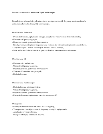 Praca na stanowisku: Animator/ DJ/ Konferansjer Poszukujemy uśmiechniętych, otwartych, kreatywnych osób do pracy na stanowiskach: animator zabaw dla dzieci/ DJ/ konferansjer. Oczekiwania Animator: - Poczucie humoru, optymizm, energia, pozytywne nastawienie do świata i ludzi, - Umiejętność pracy w grupie, - Dyspozycyjność, gotowość do wyjazdów - Kreatywność, umiejętność dopasowania ćwiczeń do wieku i umiejętności uczestników, - Znajomość gier i zabaw ruchowych (także z chustą Klanzy), - Mile widziane doświadczenie w pracy z dziećmi na stanowisku animatora. Oczekiwania DJ: - Umiejętności techniczne, - Umiejętność pracy w grupie, - Dyspozycyjność, gotowość do wyjazdów, - Znajomość trendów muzycznych, - Doświadczenie. Oczekiwania Konferansjer: - Doświadczenie minimum 2 lata, - Umiejętność pracy w grupie, - Dyspozycyjność, gotowość do wyjazdów, - Poczucie humoru, optymizm, energia, kreatywność. Oferujemy: - Profesjonalne szkolenie u Klienta oraz w Agencji, - Transport do i z miejsca trwania imprezy, noclegi i wyżywienie, - Atrakcyjne wynagrodzenie, - Pracę w młodym, ambitnym zespole. Zainteresowanych kandydatów spełniających powyższe wymagania, prosimy o przesłanie CV na adres: [email protected] wpisując w tytule aplikacji nazwę stanowiska „ANIMATOR”, ,,DJ” lub ,,KONFERANSJER”. Prosimy o dołączenie klauzuli o ochronie danych osobowych. Wszystkim kandydatom z góry dziękujemy za przesłane aplikacje, jednocześnie informujemy, iż skontaktujemy się tylko z wybranymi osobami.