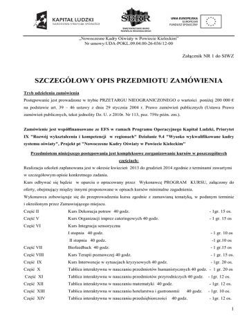 „Nowoczesne Kadry Oświaty w Powiecie Kieleckim” Nr umowy:UDA-POKL.09.04.00-26-036/12-00 Załącznik NR 1 do SIWZ SZCZEGÓŁOWY OPIS PRZEDMIOTU ZAMÓWIENIA Tryb udzielenia zamówienia Postępowanie jest prowadzone w trybie PRZETARGU NIEOGRANICZONEGO o wartości poniżej 200 000 € na podstawie art. 39 – 46 ustawy z dnia 29 stycznia 2004 r. Prawo zamówień publicznych (Ustawa Prawo zamówień publicznych, tekst jednolity Dz. U. z 2010r. Nr 113, poz. 759z późn. zm.). Zamówienie jest współfinansowane ze EFS w ramach Programu Operacyjnego Kapitał Ludzki, Priorytet IX "Rozwój wykształcenia i kompetencji w regionach" Działanie 9.4 "Wysoko wykwalifikowane kadry systemu oświaty", Projekt pt "Nowoczesne Kadry Oświaty w Powiecie Kieleckim" Przedmiotem niniejszego postępowania jest kompleksowe zorganizowanie kursów w poszczególnych częściach: Realizacja szkoleń zaplanowana jest w okresie kwiecień 2013 do grudzień 2014 zgodnie z terminami zawartymi w szczegółowym opisie konkretnego zadania. Kurs odbywać się będzie w oparciu o opracowany przez Wykonawcę PROGRAM KURSU, załączony do oferty, obejmujący między innymi proponowane w opisach kursów minimalne zagadnienia. Wykonawca zobowiązuje się do przeprowadzenia kursu zgodnie z zamawianą tematyką, w podanym terminie i określonym przez Zamawiającego miejscu. Część II Kurs Dekoracja potraw 40 godz. - 1gr. 15 os. Część V Kurs Organizacji imprez cateringowych 40 godz. - 1 gr. 15 os Część VI Kurs Integracja sensoryczna I stopnia 40 godz. - 1 gr. 10 os II stopnia 40 godz. -1 gr.10 os Część VII Biofeedback 40 godz. - 1 gr.15 os Część VIII Kurs Terapii poznawczej 40 godz. - 1 gr. 15 os. Część IX Kurs Interwencje w sytuacjach kryzysowych 40 godz. - 1gr. 20 os. Część X Tablica interaktywna w nauczaniu przedmiotów humanistycznych 40 godz. - 1 gr. 20 os Część XI Tablica interaktywna w nauczaniu przedmiotów przyrodniczych 40 godz. - 1gr. 12 os. Część XII Tablica interaktywna w nauczaniu matematyki 40 godz. - 1gr. 12 os. Część XIII Tablica interaktywna w nauczaniu hotelarstwa i gastronomii Część XIV Tablica interaktywna w nauczaniu przedsiębiorczości 40 godz. 40 godz. - 1gr. 10 os. - 1gr. 12 os. 1 „Nowoczesne Kadry Oświaty w Powiecie Kieleckim” Nr umowy:UDA-POKL.09.04.00-26-036/12-00 Część XV Animator Kultury 40 godz. - 1 gr. 20 os Część XVI Praca z wychowankiem trudnym 40 godz. - 1 gr.20 os Część XVII Komunikacja nauczyciel – uczeń – jak poruszać tematy trudne 40 godz . - 1 gr. 12 os Część XVIII Dobór metod i technik w pracy resocjalizacyjnej z młodzieżą 40 godz. - 1 gr. 20 os Część XIX Wykorzystywanie usług plastycznych w pracy z młodzieżą 40 godz. Część XX Wychowawca jako opiekun i nauczyciel wspomagający 40 godz. - 1 gr.12 os - 1 gr. 20 os Szczegółowe wymagania związane z realizacją przedmiotu zamówienia 1. Zamawiający nie przewiduje zamówień dodatkowych i uzupełniających. 2. Zamawiający nie dopuszcza składania ofert wariantowych. 3. Zamawiający dopuszcza możliwość składania ofert częściowych, a zatem każdy z Wykonawców może złożyć ofertę na kilka części. Założenia ogólne dotyczące wszystkich części : Obowiązki Wykonawcy. 1. Wykonawca w ramach realizacji swojej części zamówienia zobowiązany jest pokryć koszty organizacji kursu (trenerów zajęć praktycznych i ćwiczeniowych), koszt dowiezienia do miejsca realizacji kursu niezbędnych sprzętów specjalistycznych (dotyczy części II ) koniecznych do przeprowadzenia zaproponowanego kursu, przygotowanie i powielenie materiałów dydaktycznych, jeśli są niezbędne do przeprowadzenia zadania. 2. Wykonawca zapewni realizację kursu przez wykwalifikowaną kadrę, posiadającą uprawnienia i doświadczenie w prowadzeniu kursów z tematu objętego przedmiotową umową, posiadającą uprawnienia do zrealizowania zadania oraz legitymujących się sukcesami, min udziałami w konkursach , wystawach (dotyczy części II (np. medalami ) w swojej branży. 3. Wykonawca zapewnia i zobowiązuje się, że zgodnie z niniejszą umową korzystanie przez Zamawiającego z dostarczonych produktów nie będzie stanowić naruszenia majątkowych praw autorskich osób trzecich. 4. Wykonawca powinien posiadać: • niezbędną wiedzę teoretyczną i praktyczną • stosowne uprawnienia branżowe ( dotyczy części II, V, VI, VII, VIII, IX) • akredytację Kuratora Oświaty określoną w art. 68 b ustawy o systemie oświaty z dnia 7 września 1991 r. ( Dz.U. 2010.54.320) (dotyczy części X, XI, XII, XIII, XIV, XV, XVI, XVII. XVIII, XIX, XX) lub wpis do rejestru instytucji szkoleniowych • wykładowca/ trener: musi posiadać wykształcenie co najmniej wyższe magisterskie w rozumieniu przepisów o szkolnictwie wyższym lub równoważne, • dysponuje wykształceniem i doświadczeniem szkoleniowym, w ramach prezentowanego tematu, wynikającego z wykonywanego zawodu lub pełnionej funkcji, 2 „Nowoczesne Kadry Oświaty w Powiecie Kieleckim” Nr umowy:UDA-POKL.09.04.00-26-036/12-00 • wykonawca powinien znajdować się w sytuacji ekonomicznej i finansowej zapewniającej wykonanie zamówienia Wykonawca gwarantuje opracowanie koncepcji i zakresu merytorycznego szkolenia, zawierającego: • zakres tematyczny w podziale na dni, godziny i bloki tematyczne oraz sposób organizacji szkolenia; • szczegółowy program szkolenia • wykaz materiałów i narzędzi stosowanych przez Wykonawcę Wykonawca opracowuje i przekazuje Zleceniodawcy do akceptacji wszelkie materiały, które zostaną wykorzystane do przeprowadzenia danego szkolenia na tydzień przed jego rozpoczęciem PODSTAWOWE warunki dotyczące kadry: Wykaz osób, które będą uczestniczyć w wykonaniu zamówienia, w szczególności odpowiedzialnych za świadczenie usług wraz z informacjami na temat ich kwalifikacji zawodowych, doświadczenia i wykształcenia niezbędnych do wykonania prawidłowo zamówienia. PODSTAWOWE WYMAGANIA 