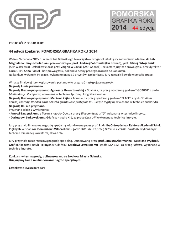 POMORSKA GRAFIKA ROKU 2014 44 edycja PROTOKÓ£ Z OBRAD JURY 44 edycji konkursu POMORSKA GRAFIKA ROKU 2014 W dniu 9 czerwca 2015 r. w siedzibie Gdañskiego Towarzystwa Przyjació³ Sztuki jury konkursu w sk³adzie: dr hab. Magdalena Hanysz-Stefañska - przewodnicz¹ca, prof. Andrzej Bobrowski (UA Poznañ), prof. B³a¿ej Ostoja Lniski (ASP Warszawa) - cz³onkowie oraz prof. Zbigniew Gorlak (ASP Gdañsk) - sekretarz jury bez prawa g³osu oraz dyrektor biura GTPS Anna Popiel - bez prawa g³osu, dokona³o oceny prac zg³oszonych do konkursu. Na konkurs wp³ynê³y 54 prace, wykonane przez 39 artystów. Do konkursu jury zakwalifikowa³o wszystkie prace. W turze fina³owej jury w g³osowaniu postanowi³o przyznaæ nastêpuj¹ce nagrody: Nagrodê I - nie przyznano. Nagrodê II ex aequo przyznano Agnieszce Gewartowskiej z Gdañska, za pracê opatrzon¹ god³em "IGO2008" z cyklu Multiplikacje. Koci pazur, wykonan¹ w technice ³¹czonej: litografia i kredka. Nagrodê II ex aequo przyznano Markowi Zajko z Torunia, za pracê opatrzon¹ god³em "BLACK" z cyklu Studium pewnej choroby. Rozk³ad pana Staszka gwa³townie postêpuje III - 3 czêœæ tryptyku, wykonan¹ w technice suchorytu. Nagrodê III - nie przyznano. Przyznano tak¿e 2 wyró¿nienia: - Janowi Baczyñskiemu z Torunia - god³o OLA, za pracê Wspomnienia z "G" wykonan¹ w technice linorytu, - Dariuszowi Syrkowskiem z Gdañska - god³o X-1, za pracê Kosz L-III wykonan¹ w technice linorytu. Jury przyzna³o finansow¹ nagrodê specjaln¹, ufundowan¹ przez prof. Ludmi³ê Ostrogórsk¹ - Rektora Akademii Sztuk Piêknych w Gdañsku, Dominikowi W³odarkowi - god³o DWL 76 - za pracê Odbicia. Helsinki. Suvilahti, wykonan¹ w technice mieszanej: akwaforta, akwatinta. Jury przyzna³o tak¿e rzeczow¹ nagrodê specjaln¹, ufundowan¹ przez prof. Janusza Akermanna - Dziekana Wydzia³u Grafiki Akademii Sztuk Piêknych w Gdañsku, Karolowi Lewalskiemu - god³o STA 112 - za pracê Po³owa, wykonan¹ w technice linorytu. Konkurs, w tym nagrody, dofinansowano ze œrodków Miasta Gdañska. Dziêkujemy tak¿e za ufundowanie nagród specjalnych. Cz³onkowie i Sekretarz Jury