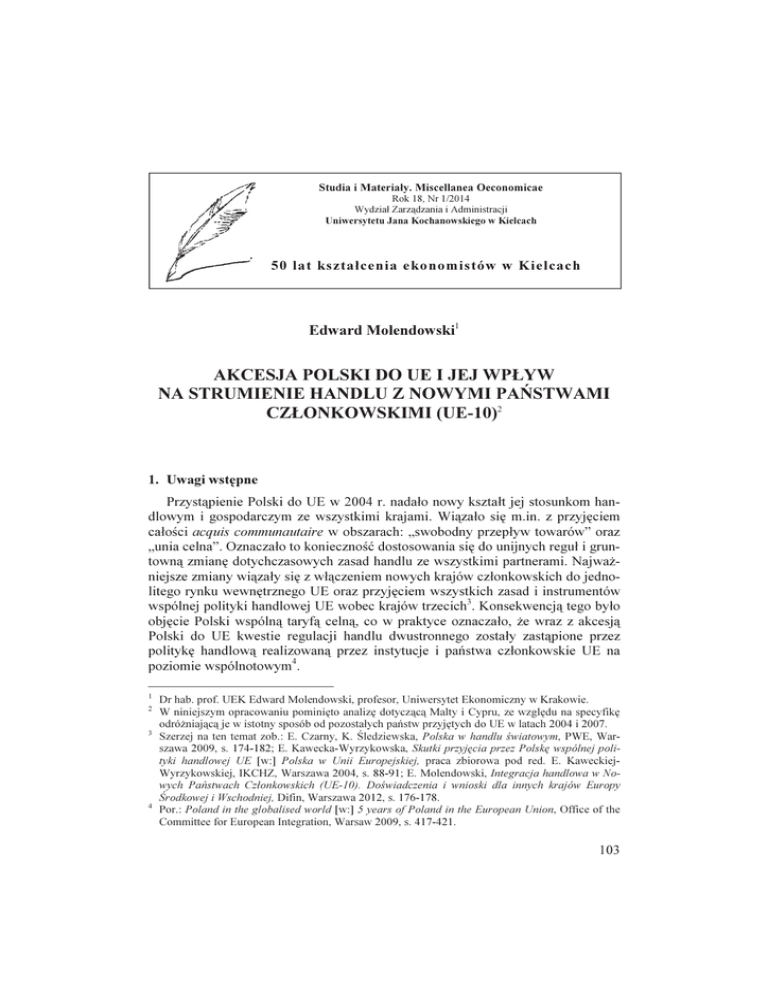 Studia i Materiały. Miscellanea Oeconomicae Rok 18, Nr 1/2014 Wydział Zarządzania i Administracji Uniwersytetu Jana Kochanowskiego w Kielcach 50 lat kształcenia ekonomistów w Kielcach Edward Molendowski1 AKCESJA POLSKI DO UE I JEJ WPŁYW NA STRUMIENIE HANDLU Z NOWYMI PAŃSTWAMI CZŁONKOWSKIMI (UE-10)2 1. Uwagi wstępne Przystąpienie Polski do UE w 2004 r. nadało nowy kształt jej stosunkom handlowym i gospodarczym ze wszystkimi krajami. Wiązało się m.in. z przyjęciem całości acquis communautaire w obszarach: „swobodny przepływ towarów” oraz „unia celna”. Oznaczało to konieczność dostosowania się do unijnych reguł i gruntowną zmianę dotychczasowych zasad handlu ze wszystkimi partnerami. Najważniejsze zmiany wiązały się z włączeniem nowych krajów członkowskich do jednolitego rynku wewnętrznego UE oraz przyjęciem wszystkich zasad i instrumentów wspólnej polityki handlowej UE wobec krajów trzecich3. Konsekwencją tego było objęcie Polski wspólną taryfą celną, co w praktyce oznaczało, że wraz z akcesją Polski do UE kwestie regulacji handlu dwustronnego zostały zastąpione przez politykę handlową realizowaną przez instytucje i państwa członkowskie UE na poziomie wspólnotowym4. 1 2 3 4 Dr hab. prof. UEK Edward Molendowski, profesor, Uniwersytet Ekonomiczny w Krakowie. W niniejszym opracowaniu pominięto analizę dotyczącą Malty i Cypru, ze względu na specyfikę odróżniającą je w istotny sposób od pozostałych państw przyjętych do UE w latach 2004 i 2007. Szerzej na ten temat zob.: E. Czarny, K. Śledziewska, Polska w handlu światowym, PWE, Warszawa 2009, s. 174-182; E. Kawecka-Wyrzykowska, Skutki przyjęcia przez Polskę wspólnej polityki handlowej UE [w:] Polska w Unii Europejskiej, praca zbiorowa pod red. E. KaweckiejWyrzykowskiej, IKCHZ, Warszawa 2004, s. 88-91; E. Molendowski, Integracja handlowa w Nowych Państwach Członkowskich (UE-10). Doświadczenia i wnioski dla innych krajów Europy Środkowej i Wschodniej, Difin, Warszawa 2012, s. 176-178. Por.: Poland in the globalised world [w:] 5 years of Poland in the European Union, Office of the Committee for European Integration, Warsaw 2009, s. 417-421. 103 Zasady polityki handlowej Polski (i krajów nowo przystępujących) z zagranicą zostały zharmonizowane w istotnym zakresie z zasadami wspólnej polityki handlowej UE jeszcze przed akcesją. Na mocy Układów Europejskich wymiana towarami przemysłowymi między tymi krajami i państwami UE-15 została niemal całkowicie zliberalizowana już od 1 stycznia 1999. Z kolei podpisane na początku pierwszej dekady XXI w. porozumienia umożliwiły istotne zmniejszenie barier w handlu artykułami rolnymi5. Akcesja do UE oznaczała więc przede wszystkim całkowitą liberalizację handlu artykułami rolno-spożywczymi oraz wyeliminowanie kontroli granicznych w przepływie towarów (bariery fizyczne) oraz występujących jeszcze barier technicznych i fiskalnych w dostępie do jednolitego rynku. Jak wiadomo, jednym z głównych założeń teorii strefy wolnego handlu i unii celnej jest to, iż likwidacja barier w handlu oraz w przepływie czynników produkcji umożliwia krajom tworzącym obszar preferencyjny uzyskiwanie wielu korzyści, w tym zwłaszcza zwiększanie udziału w handlu wzajemnym. W literaturze przedmiotu są one określane (w ślad za J. Vinerem, uznawanym za pioniera teorii strefy wolnego handlu i unii celnej) jako efekt kreacji oraz efekt przesunięcia handlu6. Niniejsze opracowanie jest prezentacją wyników analizy zmierzającej do weryfikacji hipotezy, iż nowe warunki handlu, wynikające z akcesji do UE, miały istotny wpływ na dynamikę i strukturę obrotów towarowych Polski, nie tylko w relacji z krajami UE-15, ale zwłaszcza w handlu z nowymi państwami członkowskimi (UE-10). W pracy podjęto próbę odpowiedzi na pytania: 1. Czy akcesja do Unii Europejskiej spowodowała pozytywne przekształcenia w handlu zagranicznym Polski? 2. Jakie zmiany nastąpiły w relacji z nowo przyjętymi krajami? Analizę przeprowadzono na podstawie danych statystycznych Eurostat dotyczących obrotów handlowych Polski i krajów UE (ceny bieżące na bazie euro) za lata 2000-2003 oraz 2004-2007 i 2004-20127. W opracowaniu wykorzystano najważniejsze badania prowadzone w tym zakresie. Całość prezentowanej analizy zamykają wnioski i uwagi końcowe. 2. Nowe warunki handlu wynikające z akcesji do UE Jednym z podstawowych filarów jednolitego rynku wewnętrznego państw członkowskich Unii Europejskiej jest swobodny przepływ towarów przemysłowych i rolnych. W toku negocjacji dotyczących obszaru „Swobodny przepływ towarów” krajów UE-10 zobowiązały się do przyjęcia w całości dorobku prawnego Wspólnot w tej dziedzinie (z wyjątkiem procedury rejestracji leków oraz do5 6 7 Szerzej zob. E. Kawecka-Wyrzykowska, Skutki przyjęcia …, op.cit., s. 88-91. Szerzej na ten temat zob.: J. Viner, The Customs Union Issue, Carnegie Endowment for International Peace, New York, 1950, s. 4-6. W polskiej literaturze zagadnienia te są szeroko opisywane m. in. w pracach: P. Bożyk, J. Misala, Integracja ekonomiczna, PWE, Warszawa 2003, s. 23-26; A. Budnikowski, E. Kawecka-Wyrzykowska (red.), Międzynarodowe stosunki gospodarcze, PWE, Warszawa 1998, s. 76-81. W celu zapewnienia porównywalności danych grupa nowych państw członkowskich (wraz z Bułgarią i Rumunią) została potraktowana łącznie w całym analizowanym okresie 2000-2012. 104 puszczenia do rynku UE części producentów wyrobów mięsnych i produktów mlecznych, gdzie uzyskały okresy przejściowe)8. Przyjęcie wspólnotowych reguł swobodnego przepływu towarów oznaczało9: − zniesienie ceł oraz wszelkich opłat równoważnych cłom w obrotach z krajami UE-25, a następnie UE-27 (w relacji z krajami UE-15 zostały one zniesione już wcześniej na mocy Układów Stowarzyszeniowych), − eliminację wszelkiego rodzaju ograniczeń ilościowych (kontyngenty, 