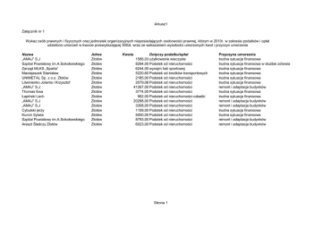 Arkusz1 Załącznik nr 1 Wykaz osób prawnych i fizycznych oraz jednostek organizacyjnych nieposiadających osobowości prawnej, którym w 2010r. w zakresie podatków i opłat udzielono umorzeń w kwocie przewyższającej 500zł, wraz ze wskazaniem wysokości umorzonych kwot i przyczyn umorzenia Nazwa „AMAJ” S.J Szpital Powiatowy im.A.Sokołowskiego Zarząd MLKS „Sparta” Maciejaszek Stanisław UNIMETAL Sp. z o.o. Złotów Litwinienko Jolanta i Krzysztof „AMAJ” S.J Thomas Ewa Łapiński Lech „AMAJ” S.J „AMAJ” S.J Cybulski jerzy Kurcin Sylwia Szpital Powiatowy im.A.Sokołowskiego Areszt Śledczy Złotów Adres Złotów Złotów Złotów Złotów Złotów Złotów Złotów Złotów Złotów Złotów Złotów Złotów Złotów Złotów Złotów Kwota Dotyczy podatku/opłat 1566,03 użytkowanie wieczyste 8294,00 Podatek od nieruchomości 6244,00 wynajm hali sportowej 5220,60 Podatek od środków transportowych 2185,00 Podatek od nieruchomości 2079,08 Podatek od nieruchomości 41267,00 Podatek od nieruchomości 3774,00 Podatek od nieruchomości 982,00 Podatek od nieruchomości-odsetki 20288,00 Podatek od nieruchomości 3308,00 Podatek od nieruchomości 1159,00 Podatek od nieruchomości 5000,00 Podatek od nieruchomości 8793,00 Podatek od nieruchomości 6023,00 Podatek od nieruchomości Strona 1 Przyczyna umorzenia trudna sytuacja finansowa trudna sytuacja finansowa w służbie zdrowia trudna sytuacja finansowa trudna sytuacja finansowa trudna sytuacja finansowa trudna sytuacja finansowa remont i adaptacja budynków trudna sytuacja finansowa trudna sytuacja finansowa remont i adaptacja budynków remont i adaptacja budynków trudna sytuacja finansowa trudna sytuacja finansowa remont i adaptacja budynków remont i adaptacja budynków Arkusz2 Załącznik nr 2 Wykaz osób prawnych i fizycznych oraz jednostek organizacyjnych nieposiadających osobowości prawnej, którym 2010r. W zakresie podatków lub opłat udzielono ulg, odroczeń lub rozłożono spłatę na raty w kwocie przewyższającej 500zł Nazwa Sulima Adam Stefen Maria Brzezińska Jadwiga Kuleta Bogdan i Anna OSM Złotów PPH „SILMET-BEDEX” S.A. Kurcin Sylwia Konicer Ryszard Restauracja-Hotelik „Dom Polski” UNIMETAL Sp. Z o.o. Złotów Kurcin Sylwia Pająk Elżbieta Konicer Ryszard Adres Blękwit Blękwit Złotów Złotów Złotów Złotów Złotów Złotów Złotów Złotów Złotów Złotów Złotów Forma ulgi odroczenie terminu płatności odroczenie terminu płatności odroczenie terminu płatności odroczenie terminu płatności rozłożenie na raty rozłożenie na raty rozłożenie na raty odroczenie terminu płatności odroczenie terminu płatności rozłożenie na raty rozłożenie na raty rozłożenie na raty odroczenie terminu płatności Strona 2 Dotyczy podatku/opłat dzierżawa dzierżawa sprzedaż mienia sprzedaż mienia użytkowanie wieczyste użytkowanie wieczyste użytkowanie wieczyste podatek od środków transportowych podatek od nieruchomości podatek od nieruchomości podatek od nieruchomości podatek od nieruchomości podatek od nieruchomości Arkusz3 Załącznik nr 3 Wykaz podmiotów, którym udzielono pomocy publicznej w 2010r. Nazwa Okręgowa Spółdzielnia Mleczarska Złotów AMAJ Spółka Jawna „SILMET-BEDEX” S.J. Restauracja-Hotelik „Dom Polski” Strona 3