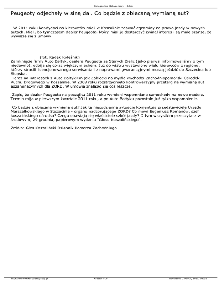 Białogardzka Szkoła Jazdy - Oskar Peugeoty odjechały w siną dal. Co będzie z obiecaną wymianą aut? W 2011 roku kandydaci na kierowców mieli w Koszalinie zdawać egzaminy na prawo jazdy w nowych autach. Mieli, bo tymczasem dealer Peugeota, który miał je dostarczyć zwinął interes i są małe szanse, że wywiąże się z umowy. (fot. Radek Koleśnik) Zamknięcie firmy Auto Bałtyk, dealera Peugeota ze Starych Bielic (jako pierwsi informowaliśmy o tym niedawno), odbija się coraz większym echem. Już do wiatru wystawiono wielu kierowców z regionu, którzy stracili licencjonowanego serwisanta i z naprawami gwarancyjnymi muszą jeździć do Szczecina lub Słupska. Teraz na interesach z Auto Bałtykiem jak Zabłocki na mydle wychodzi Zachodniopomorski Ośrodek Ruchu Drogowego w Koszalinie. W 2008 roku rozstrzygnięto kontrowersyjny przetarg na wymianę aut egzaminacyjnych dla ZORD. W umowie znalazło się coś jeszcze. Zapis, że dealer Peugeota na początku 2011 roku wymieni wspomniane samochody na nowe modele. Termin mija w pierwszym kwartale 2011 roku, a po Auto Bałtyku pozostało już tylko wspomnienie. Co będzie z obiecaną wymianą aut? Jak tą niecodzienną sytuację komentują przedstawiciele Urzędu Marszałkowskiego w Szczecinie - organu nadzorującego ZORD? Co mówi Eugeniusz Romanów, szef koszalińskiego ośrodka? Czego obawiają się właściciele szkół jazdy? O tym wszystkim przeczytasz w środowym, 29 grudnia, papierowym wydaniu "Głosu Koszalińskiego". Źródło: Głos Koszaliński Dziennik Pomorza Zachodniego http://www.oskar-prawojazdy.pl Kreator PDF Utworzono 2 March, 2017, 03:55