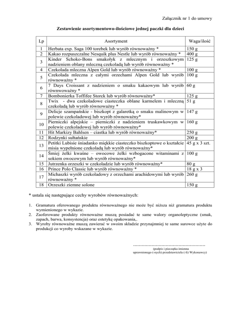 Załącznik nr 1 do umowy Zestawienie asortymentowo-ilościowe jednej paczki dla dzieci Waga/ilość Lp Asortyment 1 2 Herbata exp. Saga 100 torebek lub wyrób równoważny * Kakao rozpuszczalne Nesquik plus Nestle lub wyrób równoważny * Kinder Schoko-Bons smakołyk z mlecznym i orzeszkowym nadzieniem oblany mleczną czekoladą lub wyrób równoważny * Czekolada mleczna Alpen Gold lub wyrób równoważny * Czekolada mleczna z całymi orzechami Alpen Gold lub wyrób równoważny * 7 Days Croissant z nadzieniem o smaku kakaowym lub wyrób równwoważny * Bombonierka Toffifee Storck lub wyrób równoważny* Twix - dwa czekoladowe ciasteczka oblane karmelem i mleczną czekoladą lub wyrób równoważny * Delicje szampańskie - biszkopt z galaretką o smaku malinowym w polewie czekoladowej lub wyrób równoważny* Pierniczki alpejskie – pierniczki z nadzieniem truskawkowym w polewie czekoladowej lub wyrób równoważny* Hit Markizy Bahlsen – ciastka lub wyrób równoważny* Rodzynki sułtańskie Petitki Lubisie śniadanko miękkie ciasteczko biszkoptowe o kształcie misia wypełnione czekoladą lub wyrób równoważny* Śmiej żelki kwaśne – owocowe żelki wzbogacone witaminami z sokiem owocowym lub wyrób równoważny* Jutrzenka orzeszki w czekoladzie lub wyrób równoważny* Prince Polo Classic lub wyrób równoważny * Michaszki wyrób czekoladowy z orzechami arachidowymi lub wyrób równoważny * Orzeszki ziemne solone 3 4 5 6 7 8 9 10 11 12 13 14 15 16 17 18 150 g 400 g 125 g 100 g 100 g 60 g 125 g 51 g 147 g 160 g 250 g 200 g 45 g x 3 szt. 100 g 80 g 18 g x 3 260 g 150 g * ustala się następujące cechy wyrobów równoważnych: 1. Gramatura oferowanego produktu równoważnego nie może być niższa niż gramatura produktu wymienionego w wykazie. 2. Zaoferowane produkty równoważne muszą posiadać te same walory organoleptyczne (smak, zapach, barwa, konsystencja) oraz estetykę opakowania,. 3. Wyroby równoważne muszą zawierać w swoim składzie przynajmniej te same surowce użyte do produkcji co wyroby wskazane w wykazie. ................................................... (podpis i pieczątka imienna uprawnionego (-nych) przedstawiciela (-li) Wykonawcy)