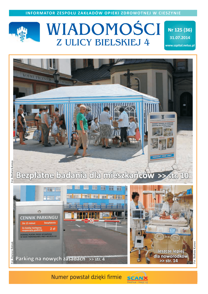 I N FO R M ATO R Z ES P O Ł U ZA K Ł A D ÓW O P I E K I Z D ROWOT N E J W C I ES ZY N I E WIADOMOSCI 31.07.2014 www.szpital.netus.pl Bezpłatne badania dla mieszkańców >> str. 10 Parking na nowych zasadach >> str. 4 Numer powstał dzięki firmie Jeszcze lepiej dla noworodków >> str. 14 Fot. Barbara Karnas Fot. Dariusz Babiak Fot. Barbara Karnas Z ULICY BIELSKIEJ 4 Nr 125 (36) Pulsoksymetria również cieszyła się zainteresowaniem Fot. Barbara Karnas Fot. Barbara Karnas Do badania nowym spirometrem zakupionym przez FZŚC stale ustawiała się kolejka Fot. Barbara Karnas Fot. Barbara Karnas Szpital i Fundacja na Święcie Trzech Braci Można było zmierzyć sobie poziom cukru.... ....oraz ciśnienie krwi Fot. Barbara Karnas Wózki dla Pracowni endoskopii Fot. Barbara Karnas FZ SC Część sprzętu zakupionego w ostatnim czasie przez Fundację Zdrowia Śląska Cieszyńskiego Aparat do próżniowego leczenia ran dla Oddziału chirurgii ogólnej Fot. Barbara Karnas Dwa spirometry; jeden dla Oddziału gruźlicy i chorób płuc, drugi trafił do poradni Fot. Beata Sikora-Małyjurek Fot. Barbara Karnas Wagi na neonatologię Ciśnieniomierz dla Oddziału urologicznego więcej o darach FZŚC na str. 10 WIADOMOŚCI Z ULICY BIELSKIEJ 4, NR 125 (36), 31 VII 2014 Fot. Barbara Karnas Minął prawie rok od kiedy powierzono mi kierowanie Zespołem Zakładów Opieki Zdrowotnej w Cieszynie. Najpierw, jako pełniącego obowiązki, a od lutego br. jako dyrektora jednostki. Zarządzanie jednym z największych zakładów w powiecie cieszyńskim, którego sprawne działanie wiąże się z zapewnieniem bezpieczeństwa zdrowotnego mieszkańców, to duże wyzwanie i ogroCzesław Płygawko, Dyrektor ZZOZ mna odpowiedzialność. w Cieszynie Po objęciu stanowiska bardzo szybko udało mi się wygasić emocje związane z odwołaniem poprzedniego dyrektora, które wyczuwane były nie tylko w samym zakładzie, ale również w mediach oraz wśród zaniepokojonych zaistniałą sytuacją pacjentów. Wówczas wiele ważnych zadań było rozpoczętych i wymagały skutecznego doprowadzenia do końca, gdyż jakiekolwiek zaniedbania wiązałyby się dla Szpitala z dużymi konsekwencjami finansowymi. W 2013 r. zakończona została termomodernizacja Pawilonów I, III, VII oraz budynku dyrekcji. Projekty, o wartości około 7 mln zł, były sfinansowane ze środków Narodowego oraz Wojewódzkiego Funduszu Ochrony Środowiska i Gospodarki Wodnej. Ocieplenie pawilonów przynosi nie tylko oszczędności finansowe, ale również dzięki położeniu nowych elewacji Szpital zyskał bardziej atrakcyjny wygląd. Kolejną bardzo ważną inwestycją, którą przyszło mi kontynuować jest dofinansowana ze środków unijnych informatyzacja Szpitala. Projekt o wartości ponad 4,5 mln zł spowoduje prawdziwą rewolucję informatyczną, w wyniku której w ustawowym terminie wdrożona zostanie elektroniczna dokumentacja medyczna, Szpital zostanie doposażony w nowoczesny sprzęt, wdrożonych będzie szereg aplikacji usprawniających działanie poszczególnych pionów i komórek organizacyjnych. Korzystne zmiany czekają również pacjentów, którzy zyskają między innymi możliwość elektronicznej rejestracji do poradni i pracowni. Realizacja projektu możliwa jest dzięki dobrej współpracy z Radą i Zarządem Starostwa Powiatowego w Cieszynie, które zabezpieczyło wkład własny, stanowiący 15% jego wartości. W ostatnim roku poprawie uległa również sytuacja finansowa, Szpital po raz pierwszy od 2008 roku osiągnął dodatni wynik finansowy. Jestem przekonany, że zmiany, które udało mi się wprowadzić wraz ze współpracownikami, przyniosą dobre efekty w kolejnych latach i nie będziemy stawać przed koniecznością przekształcenia Szpitala w spółkę. Najbardziej cieszy mnie fakt, że zmiany na lepsze dostrzegają również nasi pacjenci, co sygnalizują w licznych listach do mnie kierowanych. W jednym z otrzymanych ostatnio, mieszkaniec Cieszyna, który po wypadku trafił do Szpitala Śląskiego pisze, że był pełen obaw o swój los po informacjach i komentarzach, które wcześniej czytał w mediach. Jednak po zabiegu był pod wrażeniem opieki i profesjonalizmu, jaki zastał w Szpitalu. Potwierdzeniem dobrej jakości usług w szpitalu jest znakomita ocena wystawiona przez Zespół Wizytatorów Ośrodka Akredy- www.szpital.netus.pl 3 Mijające miesiące przyniosły dalszy rozwój Szpitala Śląskiego w Cieszynie. Po pracach termomodernizacyjnych, które zmieniły wygląd kolejnych budynków szpitalnych, przyszedł czas na usprawnienie wewnętrznego funkcjonowania Zespołu Zakładów Opieki Zdrowotnej w Cieszynie. Będzie to możliwe dzięki informatyzacji Szpitala. Projekt, na który wkład własny zabezpieczył Powiat Cieszyński, znacznie poprawi pracę całej placówki. Oprócz tych zmian cieszy również Jerzy Nogowczyk, Starosta Powiatu dobry wynik finansowy Szpi- Cieszyńskiego tala, który po raz pierwszy od kilku lat jest dodatni. Priorytetem dla nas jest jednak jakość usług świadczonych w Szpitalu Śląskim. O ich wysokim poziomie świadczy najlepiej bardzo dobra ocena, jaką placówce wystawił Zespół Wizytatorów Ośrodka Akredytacyjnego Centrum Monitorowania Jakości w Ochronie Zdrowia. Zgodność spełnienia standardów na poziomie aż 91% to zasługa bardzo wielu osób, które z wielkim oddaniem pracują na rzecz ciągłego rozwoju placówki. Dziękuję Dyrekcji oraz wszystkim pracownikom za dbałość o to, aby zapewnić pacjentom jak najlepsze warunki leczenia. Wysoka ocena to nagroda za Państwa trud, ale to także zobowiązanie do ciągłej troski o zachowanie jak najwyższych standardów leczenia, do czego nieustannie będziemy dążyć. Zapewnienie jak najlepszej opieki medycznej mieszkańcom powiatu cieszyńskiego oraz wypoczywającym na naszym terenie gościom jest naszym wspólnym celem. Jerzy Nogowczyk Starosta Powiatu Cieszyńskiego tacyjnego Centrum Monitorowania Jakości w Ochronie Z