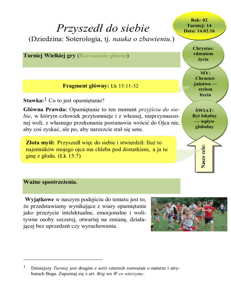 Przyszedł do siebie Rok: 02 Turniej: 14 Data: 14.02.16 (Dziedzina: Soterologia, tj. nauka o zbawieniu.) Fragment główny: Łk 15:11-32 Stawka:1 Co to jest opamiętanie? Główna Prawda: Opamiętanie to ten moment przyjścia do siebie, w którym człowiek przytomnieje i z własnej, nieprzymuszonej woli, z własnego przekonania postanawia wrócić do Ojca nie, aby coś zyskać, ale po, aby nareszcie stał się sens. Złota myśl: Przyszedł więc do siebie i stwierdził: Iluż to najemników mojego ojca ma chleba pod dostatkiem, a ja tu ginę z głodu. (Łk 15:7) Ważne spostrzeżenia. Wyjątkowe w naszym podejściu do tematu jest to, że przedstawiamy wynikające z wiary opamiętanie jako przeżycie intelektualne, emocjonalne i wolitywne osoby szczerej, otwartej na zmianę, działającej bez uprzedzeń czy wyrachowania. 1 Dzisiejszy Turniej jest drugim z serii czterech rozważań o naturze i atrybutach Boga. Zapoznaj się z art. Bóg we W co wierzymy. MY: Chrześcijaństwo — stylem bycia ŚWIAT: Byt lokalny — wpływ globalny Nasze cele: Turniej Wielkiej gry (Rozważanie główne) Chrystus: rdzeniem życia str. 2 Nauka o zbawieniu. Ważne zagrania (spostrzeżenia - odniesienia) Przypowieści o marnotrawnym synu 11aMt 21:28 12aPwt 21:16 13aPrz 29:3; Łk 15:30; 16:1 16aŁk 16:21 18aKpł 26:40; 1Krl 8:47-48; Jr 31:18-19; Oz 14:1-3; bPs 51:6; Jr 3:13 19aEzd 9:6; Ps 44:16; Łk 18:13 20aEf 2:13; bRdz 33:4; 45:14; 46:29 też: Pewien człowiek miał dwóch synów. a nich zwrócił się do ojca: Ojcze, daj mi część majątku, która na mnie przypada. On więc podzielił między nich dorobek swego życia.a2 13A po niewielu dniach młodszy syn zebrał wszystko, odjechał w dalekie strony i tam roztrwonił swój majątek, żyjąc rozwiąźle.a3 15 11Powiedział 12Młodszy z Ww. 11-13: Wartości są ____________________________________ ________________________________________________________ ________________________________________________________ Więc: ________________________________________________________ ________________________________________________________ 14A gdy wydał wszystko, nastał w tym kraju wielki głód i jemu też zaczęło brakować. 15Poszedł więc i przyłączył się do jednego z obywateli tego kraju, a [ten] wysłał go do swoich gospodarstw rolnych4 paść świnie. 16I pragnął nasycić się strąkami,a5 które jadły świnie, lecz nikt mu nie dawał. Ww. 14-16: Dochodzenie do wartości _________________________ ________________________________________________________ ________________________________________________________ Więc: ________________________________________________________ ________________________________________________________ 2 dorobek życia, βίος, lub: życie, majątek, środki na utrzymanie. 3 Lub: wyżywając się bez opamiętania (ζῶν ἀσώτως). 4 gospodarstw rolnych, gr. εἰς τοὺς ἀγροὺς, może odnosić się też do majątków ziemskich. 5 Być może szarańczyn strąkowy, Ceratonia siliqua, długości 10-23 cm. Przyszedł do siebie. str. 3 ________________________________________________________ ________________________________________________________ 17Przyszedł więc do siebie i stwierdził: Iluż to najemników mojego ojca ma chleba pod dostatkiem, a ja tu ginę z głodu. 18Wstanę i pójdę do mojego ojcaa i powiem mu: Ojcze, zgrzeszyłemb przeciw niebu oraz względem ciebie, 19nie jestem już godny być nazwany twoim synem; uczyń mnie jak jednego z twoich najemników.a 20Wstał więc i poszedł do swojego ojca. Gdy był jeszcze daleko,a jego ojciec zobaczył go, zlitował się, wybiegł, rzucił mu się na szyję i ucałował go.b Ww. 17-20: Chwila zwrotu: ________________________________________________________ ________________________________________________________ ________________________________________________________ Więc: ________________________________________________________ ________________________________________________________ ________________________________________________________ W. 20: Miejsce spotkania: ________________________________________________________ ________________________________________________________ ________________________________________________________ Więc: ________________________________________________________ ________________________________________________________ ________________________________________________________ str. 4 Nauka o zbawieniu. 21Syn 21aMt 8:8; 22:8; 1Kor 15:9 22aRdz 41:42; Ps 132:16; Iz 61:10; Za 3:4; Mt 22:11 23a1Sm 28:24 24aRz 6:23; 8:6; 1Tm 5:6; b Rz 6:13; 11:15; Ef 2:1; 5:14; Kol 2:13; 3:1 30aPrz 29:3; Łk 15:12, 13 31aJ 17:10 32aMl 3:17; Łk 15:24 zaś powiedział do niego: Ojcze, zgrzeszyłem przeciw niebu oraz względem ciebie, już nie jestem godnya być nazywany twoim synem.6 22Ojciec zaś powiedział do swoich sług: Przynieście szybko najlepszą szatę i ubierzcie go;a włóżcie pierścień na jego rękę i sandały na nogi. 23Przyprowadźcie też tuczne cielę, złóżcie je w ofierze,a7 zjedzmy i pocieszmy się, 24dlatego, że ten mój syn był martwy,a ale ożył,b był zgubiony, lecz odnalazł się. I zaczęli się weselić. Ww. 21-24: Doświadczenie łaski: ________________________________________________________ ________________________________________________________ ________________________________________________________ ________________________________________________________ Więc: ________________________________________________________ ________________________________________________________ 6 Syn nie zdołał powiedzieć tylko pierwsze zdanie. 7 złóżcie je w ofierze, gr. θύσατε, lub: zabijcie je, zob. ww. 27, 30. Przyszedł do siebie. str. 5 ________________________________________________________ ________________________________________________________ 25Jego starszy syn był tymczasem w polu. Gdy wracał i zbliżył się do domu, usłyszał muzykę i tańce. 26Przywołał więc jednego z pachołków i za