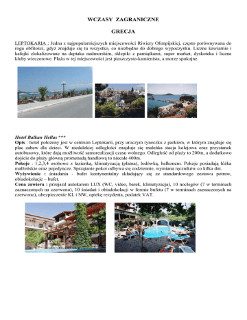 WCZASY ZAGRANICZNE GRECJA LEPTOKARIA : Jedna z najpopularniejszych miejscowości Riwiery Olimpijskiej, często porównywana do rogu obfitości, gdyż znajduje się tu wszystko, co niezbędne do dobrego wypoczynku. Liczne kawiarnie i kafejki zlokalizowane na deptaku nadmorskim, sklepiki z pamiątkami, super market, dyskoteka i liczne kluby wieczorowe. Plaża w tej miejscowości jest piaszczysto-kamienista, a morze spokojne. Hotel Balkan Hellas *** Opis : hotel położony jest w centrum Leptokarii, przy uroczym ryneczku z parkiem, w którym znajduje się plac zabaw dla dzieci. W niedalekiej odległości znajduje się maleńka stacja kolejowa oraz przystanek autobusowy, które dają możliwość samorealizacji czasu wolnego. Odległość od plaży to 200m, a dodatkowo dojście do plaży główną promenadą handlową to niecałe 400m. Pokoje : 1,2,3,4 osobowe z łazienką, klimatyzacją (płatna), lodówką, balkonem. Pokoje posiadają łóżka małżeńskie oraz pojedyncze. Sprzątanie pokoi odbywa się codziennie, wymiana ręczników co kilka dni. Wyżywienie : śniadania - bufet kontynentalny składający się ze standardowego zestawu potraw, obiadokolacje – bufet. Cena zawiera : przejazd autokarem LUX (WC, video, barek, klimatyzacja), 10 noclegów (7 w terminach zaznaczonych na czerwono), 10 śniadań i obiadokolacji w formie bufetu (7 w terminach zaznaczonych na czerwono), ubezpieczenie KL i NW, opiekę rezydenta, podatek VAT. Wyjazd 03.06 07.06 10.06 17.06 20.06 27.06 30.06 07.07 10.07 17.07 20.07 27.07 30.07 Pobyt 04.06-11.06 08.06-18.06 11.06-21.06 18.06-28.06 21.06-01.07 28.06-08.07 01.07-11.07 08.07-18.07 11.07-21.07 18.07-28.07 21.07-31.07 28.07-07.08 31.07-10.08 Powrót 13.06 20.06 23.06 30.06 03.07 10.07 13.07 20.07 23.07 30.07 02.08 09.08 12.08 Cena 899zł 999zł 999zł 1039zł 1059zł 1149zł 1169zł 1299zł 1299zł 1299zł 1299zł 1299zł 1299zł Wyjazd 06.08 09.08 16.08 19.08 26.08 29.08 05.09 08.09 15.09 18.09 25.09 28.09 05.10 Pobyt 07.08-17.08 10.08-20.08 17.08-27.08 20.08-30.08 27.08-06.09 30.08-09.09 06.09-16.09 09.09-19.09 16.09-26.09 19.09-29.09 26.09-06.10 29.09-06.10 06.10-13.10 Powrót 19.08 22.08 29.08 01.09 08.09 11.09 18.09 21.09 28.09 01.10 08.10 08.10 15.10 Cena 1299zł 1299zł 1299zł 1299zł 1239zł 1239zł 1199zł 1199zł 1099zł 1099zł 999zł 899zł 799zł Zniżki :dzieci do lat 12 minus 200zł od ceny podstawowej (pobyt z dwoma osobami pełnopłatnymi), dzieci do lat 4 płacą 400zł za przejazd (cena ta nie obejmuje świadczeń noclegowych i żywieniowych. Apartamenty typu Dafne **+ Opis : apartamenty typu Dafne to wiele budynków apartamentowych objętych jedna nazwą i reprazentujących podobny standard. Budynki znajdują się w niedalekiej odległości od centrum, a odległość od plaży to jedynie 300 do 400m. Pokoje : apartament jednopokojowy dla 2,3 osób, posiada aneks kuchenny wyposażony w podstawowe naczynia kuchenne, łazienkę, balkon lub taras. Wyżywienie : bez wyzywienia, możliwość skorzystania z obiadokolacji serwowanych w Hotelu Balkan Hellas w cenie 50 m (turnus 10 dni) lub 35 euro (turnus 7 dni) płatne w Grecji lub cena z tabelki (DafneOB.) płatne w Polsce. Cena zawiera : przejazd autokarem LUX (WC, video, barek, klimatyzacja), 10 noclegów (7 w terminach zaznaczonych na czerwono), 10 śniadań i obiadokolacji w formie bufetu (7 w terminach zaznaczonych na czerwono), ubezpieczenie KL i NW, opiekę rezydenta, podatek VAT. Dafne – OB. Cena z obiadokolacją. Ararthotel Plaza *** Opis : aparthotel Plaza to nowy budynek, położony 70m od plaży, nieco z dala od centrum tętniącego wakacyjnym życiem. Pokoje : apartament jednopokojowy dla 2, 3 osób, posiada aneks kuchenny wyposażony w podstawowe naczynia kuchenne, łazienkę, balkon lub taras. Wyżywienie : bez wyzywienia, możliwość skorzystania z obiadokolacji serwowanych w Hotelu Balkan Hellas w cenie 50 m (turnus 10 dni) lub 35 euro (turnus 7 dni) płatne w Grecji lub cena z tabelki (PlazaOB.) płatne w Polsce. Cena zawiera : przejazd autokarem LUX (WC, video, barek, klimatyzacja), 10 noclegów (7 w terminach zaznaczonych na czerwono), 10 śniadań i obiadokolacji w formie bufetu (7 w terminach zaznaczonych na czerwono), ubezpieczenie KL i NW, opiekę rezydenta, podatek VAT. Plaza – OB. Cena z obiadokolacją. Wyjazd Pobyt Powrót Plaza Plaza-OB. Dafne Dafne-OB 03.06 04.06-11.06 13.06 539zł 689zł 499zł 649zł 07.06 08.06-18.06 20.06 599zł 829zł 549zł 779zł 10.06 11.06-21.06 23.06 599zł 829zł 569zł 799zł 17.06 18.06-28.06 30.06 639zł 869zł 569zł 799zł 20.06 21.06-01.07 03.07 639zł 869zł 599zł 829zł 27.06 28.06-08.07 10.07 749zł 979zł 699zł 929zł 30.06 01.07-11.07 13.07 769zł 999zł 729zł 959zł 07.07 08.07-18.07 20.07 829zł 1059zł 749zł 979zł 10.07 11.07-21.07 23.07 829zł 1059zł 749zł 979zł 17.07 18.07-28.07 30.07 829zł 1059zł 749zł 979zł 20.07 21.07-31.07 02.08 829zł 1059zł 749zł 979zł 27.07 28.07-07.08 09.08 829zł 1059zł 749zł 979zł 30.07 31.07-10.08 12.08 829zł 1059zł 749zł 979zł 06.08 07.08-17.08 19.08 829zł 1059zł 749zł 979zł 09.08 10.08-20.08 22.08 829zł 1059zł 749zł 979zł 16.08 17.08-27.08 29.08 829zł 1059zł 749zł 979zł 19.08 20.08-30.08 01.09 829zł 1059zł 729zł 959zł 26.08 27.08-06.09 08.09 799zł 1029zł 729zł 959zł 29.08 30.08-09.09 11.09 779zł 999zł 719zł 949zł 05.09 06.09-16.09 18.09 779zł 999zł 699zł 929zł 08.09 09.09-19.09 21.09 759zł 989zł 699zł 929zł 15.09 16.09-26.09 28.09 699zł 929zł 629zł 859zł 18.09 19.09-29.09 01.10 679zł 899zł 599zł 829zł 25.09 26.09-06.10 08.10 659zł 889zł 599zł 829zł 28.09 29.09-06.10 08.10 539zł 689zł 499zł 649zł 05.10 06.10-13.10 15.10 499zł 649zł 449zł 599zł Zniżki :dzieci do lat 12 minus 200zł od ceny podstawowej (pobyt z dwoma osobami pełnopłatnymi), dzieci do lat 4 płacą 400zł za przejazd (cena ta nie obejmuje świadczeń noclegowych i żywieniowych. PARALIA : zdecydowanie najbardziej znana miejscowość Riwiery Olimpij