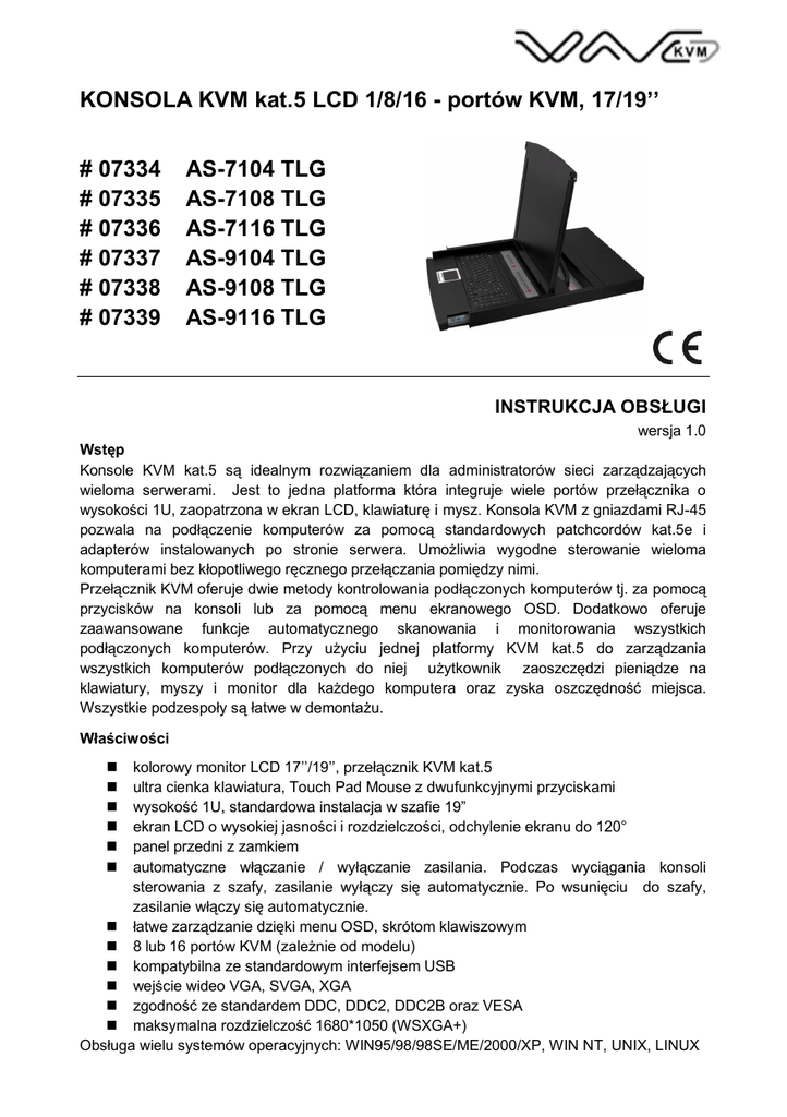 KONSOLA KVM kat.5 LCD 1/8/16 - portów KVM, 17/19’’