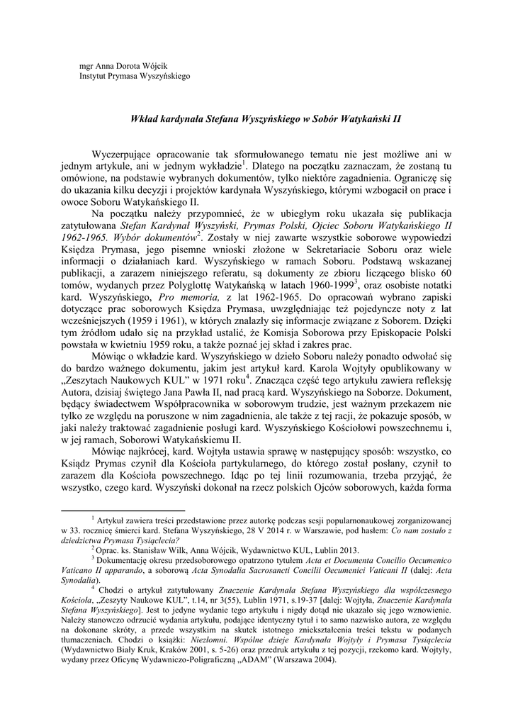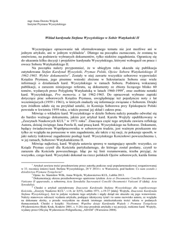mgr Anna Dorota Wójcik Instytut Prymasa Wyszyńskiego Wkład kardynała Stefana Wyszyńskiego w Sobór Watykański II Wyczerpujące opracowanie tak sformułowanego tematu nie jest możliwe ani w jednym artykule, ani w jednym wykładzie1. Dlatego na początku zaznaczam, że zostaną tu omówione, na podstawie wybranych dokumentów, tylko niektóre zagadnienia. Ograniczę się do ukazania kilku decyzji i projektów kardynała Wyszyńskiego, którymi wzbogacił on prace i owoce Soboru Watykańskiego II. Na początku należy przypomnieć, że w ubiegłym roku ukazała się publikacja zatytułowana Stefan Kardynał Wyszyński, Prymas Polski, Ojciec Soboru Watykańskiego II 1962-1965. Wybór dokumentów2. Zostały w niej zawarte wszystkie soborowe wypowiedzi Księdza Prymasa, jego pisemne wnioski złożone w Sekretariacie Soboru oraz wiele informacji o działaniach kard. Wyszyńskiego w ramach Soboru. Podstawą wskazanej publikacji, a zarazem niniejszego referatu, są dokumenty ze zbioru liczącego blisko 60 tomów, wydanych przez Polyglottę Watykańską w latach 1960-19993, oraz osobiste notatki kard. Wyszyńskiego, Pro memoria, z lat 1962-1965. Do opracowań wybrano zapiski dotyczące prac soborowych Księdza Prymasa, uwzględniając też pojedyncze noty z lat wcześniejszych (1959 i 1961), w których znalazły się informacje związane z Soborem. Dzięki tym źródłom udało się na przykład ustalić, że Komisja Soborowa przy Episkopacie Polski powstała w kwietniu 1959 roku, a także poznać jej skład i zakres prac. Mówiąc o wkładzie kard. Wyszyńskiego w dzieło Soboru należy ponadto odwołać się do bardzo ważnego dokumentu, jakim jest artykuł kard. Karola Wojtyły opublikowany w „Zeszytach Naukowych KUL” w 1971 roku4. Znacząca część tego artykułu zawiera refleksję Autora, dzisiaj świętego Jana Pawła II, nad pracą kard. Wyszyńskiego na Soborze. Dokument, będący świadectwem Współpracownika w soborowym trudzie, jest ważnym przekazem nie tylko ze względu na poruszone w nim zagadnienia, ale także z tej racji, że pokazuje sposób, w jaki należy traktować zagadnienie posługi kard. Wyszyńskiego Kościołowi powszechnemu i, w jej ramach, Soborowi Watykańskiemu II. Mówiąc najkrócej, kard. Wojtyła ustawia sprawę w następujący sposób: wszystko, co Ksiądz Prymas czynił dla Kościoła partykularnego, do którego został posłany, czynił to zarazem dla Kościoła powszechnego. Idąc po tej linii rozumowania, trzeba przyjąć, że wszystko, czego kard. Wyszyński dokonał na rzecz polskich Ojców soborowych, każda forma 1 Artykuł zawiera treści przedstawione przez autorkę podczas sesji popularnonaukowej zorganizowanej w 33. rocznicę śmierci kard. Stefana Wyszyńskiego, 28 V 2014 r. w Warszawie, pod hasłem: Co nam zostało z dziedzictwa Prymasa Tysiąclecia? 2 Oprac. ks. Stanisław Wilk, Anna Wójcik, Wydawnictwo KUL, Lublin 2013. 3 Dokumentację okresu przedsoborowego opatrzono tytułem Acta et Documenta Concilio Oecumenico Vaticano II apparando, a soborową Acta Synodalia Sacrosancti Concilii Oecumenici Vaticani II (dalej: Acta Synodalia). 4 Chodzi o artykuł zatytułowany Znaczenie Kardynała Stefana Wyszyńskiego dla współczesnego Kościoła, „Zeszyty Naukowe KUL”, t.14, nr 3(55), Lublin 1971, s.19-37 [dalej: Wojtyła, Znaczenie Kardynała Stefana Wyszyńskiego]. Jest to jedyne wydanie tego artykułu i nigdy dotąd nie ukazało się jego wznowienie. Należy stanowczo odrzucić wydania artykułu, podające identyczny tytuł i to samo nazwisko autora, ze względu na dokonane skróty, a przede wszystkim na skutek istotnego zniekształcenia treści tekstu w podanych tłumaczeniach. Chodzi o książki: Niezłomni. Wspólne dzieje Kardynała Wojtyły i Prymasa Tysiąclecia (Wydawnictwo Biały Kruk, Kraków 2001, s. 5-26) oraz przedruk artykułu z tej pozycji, rzekomo kard. Wojtyły, wydany przez Oficynę Wydawniczo-Poligraficzną „ADAM” (Warszawa 2004). współpracy, pomocy poszczególnym biskupom lub zespołowi Episkopatu Polski w sprawach soborowych, służyło całemu Soborowi. A wiadomo, że kard. Wyszyński podjął wiele różnorodnych działań dla polskich Ojców soborowych i wspólnie z nimi. Jednocześnie formułował i przekazywał projekty służące bezpośrednio całości Soboru. Czas pokazywał, jak bardzo wzbogacały one owoc pracy wszystkich zebranych w Auli. Spośród wielu form i kierunków aktywności kard. Wyszyńskiego na Soborze proponuję teraz wybrać te, które pokazują relacje między nim i biskupem, a od końca 1962 roku arcybiskupem, Karolem Wojtyłą oraz starania dotyczące powołania katolików świeckich na Sobór. Tłem tego skromnego przekazu niech będą słowa kard. Wojtyły ze wspomnianego artykułu: „Prymas Polski wniósł od początku w zgromadzenie soborowe pełny profil swej osobowości oraz całą wymowę znaczenia, które ukształtowało się wśród Episkopatu Kościoła powszechnego przede wszystkim świadectwem lat 1953-1956, a także całej jego działalności”5. * Po uroczystym otwarciu Soboru, równolegle do prac podejmowanych codziennie w Auli, z inicjatywy Księdza Prymasa i pod jego przewodnictwem odbywały się raz w tygodniu spotkania biskupów polskich. Miejscem tych spotkań był Instytut Polski przy via Pietro Cavallini. Przypomnijmy, że w tym czasie Ksiądz Prymas był już włączony w zadania soborowego Sekretariatu extra ordinem (do spraw nadzwyczajnych; od 17 X 1962). W spotkaniach na Pietro Cavallini aktywnie uczestniczył bp Wojtyła, co Ksiądz Prymas notuje w swoich krótkich zapiskach6. Podczas drugiej sesji jesiennej coraz częściej powtarzają się notatki kard. Wyszyńskiego o bp. Wojtyle podejmującym coraz to nowe zadania w zespole polskich Ojców soborowych. W tym okresie można zauważyć, że Prymas Polski i biskup Wojtyła spotykali się na osobnych rozmowach. Ksiądz Prymas, od drugiej sesji członek Prezydium Soboru, i Wikariusz kapitulny krakowski mus