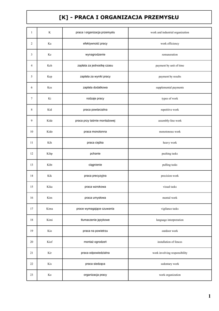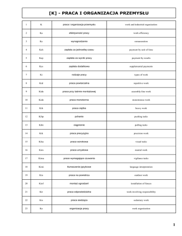 [K] - PRACA I ORGANIZACJA PRZEMYSŁU 1 K praca i organizacja przemysłu work and industrial organization 2 Ka efektywność pracy work efficiency 3 Ke wynagrodzenie remuneration 4 Keh zapłata za jednostkę czasu payment by unit of time 5 Kep zapłata za wyniki pracy payment by results 6 Kes zapłata dodatkowa supplemental payments 7 Ki rodzaje pracy types of work 8 Kid praca powtarzalna repetitive work 9 Kide praca przy taśmie montażowej assembly-line work 10 Kido praca monotonna monotonous work 11 Kih praca ciężka heavy work 12 Kihp pchanie pushing tasks 13 Kiht ciągnienie pulling tasks 14 Kik praca precyzyjna precision work 15 Kika praca wzrokowa visual tasks 16 Kim praca umysłowa mental work 17 Kima prace wymagające czuwania vigilance tasks 18 Kimi tłumaczenie językowe language interpretation 19 Kio praca na powietrzu outdoor work 20 Kiof montaż ogrodzeń installation of fences 21 Kir praca odpowiedzialna work involving responsibility 22 Kis praca siedząca sedentary work 23 Ko organizacja pracy work organization 1 24 Kob warunki pracy conditions of work 25 Koc czas pracy hours of work 26 Koca rozkład czasu pracy work time schedules 27 Kocaf ruchomy czas pracy flexible working time 28 Kod przerwa w pracy workbreaks 29 Koda rozkład czasu odpoczynku work-rest schedules 30 Koe urlop holidays 31 Koec urlop wyrównawczy compensatory leave 32 Koem urlop macierzyński maternity leave 33 Koem1 urlop wychowawczy 34 Kof praca ciągła continuous work 35 Kog praca przerywana intermittent work 36 Koh tempo pracy speed of work 37 Koi intensywność pracy intensity of work 38 Kok dokumentowanie pracy recording of work activities 39 Kol praca zmianowa shift work 40 Koln praca nocna night work 41 Kom mechanizacja mechanization 42 Koo dojazdy do pracy commuting 43 Koq automatyzacja automation 44 Kor praca chałupnicza home work 45 Kora telepraca telecommuting 46 Kos niepełne zatrudnienie part-time employment 47 Kot praca tymczasowa temporary employment 48 Kotd praca dzienna day labour 2 49 Kou praca sezonowa seasonal work 50 Kox praca dodatkowa extra work 51 Koxa praca podczas urlopu holiday employment 52 Ku organizacja przemysłu industrial organization 53 Kud przedsiębiorstwo rzemieślnicze handicrafts 54 Kul małe przedsiębiorstwo small enterprises 55 Kulb mikroprzedsiębiorstwo microenterprise 56 Kum średnie przedsiębiorstwo medium-sized enterprise 57 Kup duże przedsiębiorstwo large enterprises 58 Kus firma międzynarodowa multinational enterprises 59 Ky relacje między pracodawcą i pracownikiem labour-management relations 60 Kz etyka biznesu business ethics 61 Kza społeczna odpowiedzialność biznesu corporate social responsibility 3