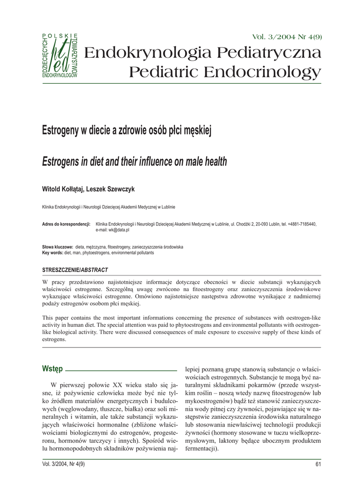 Vol. 3/2004 Nr 4(9) Endokrynologia Pediatryczna Pediatric Endocrinology Estrogeny w diecie a zdrowie osób płci męskiej Estrogens in diet and their influence on male health Witold Kołłątaj, Leszek Szewczyk Klinika Endokrynologii i Neurologii Dziecięcej Akademii Medycznej w Lublinie Adres do korespondencji: Klinika Endokrynologii i Neurologii Dziecięcej Akademii Medycznej w Lublinie, ul. Chodźki 2, 20-093 Lublin, tel. +4881-7185440, e-mail: [email protected] Słowa kluczowe: dieta, mężczyzna, fitoestrogeny, zanieczyszczenia środowiska Key words: diet, man, phytoestrogens, environmental pollutants STRESZCZENIE/ STRESZCZENIE/ABSTRACT W pracy przedstawiono najistotniejsze informacje dotyczące obecności w diecie substancji wykazujących właściwości estrogenne. Szczególną uwagę zwrócono na fitoestrogeny oraz zanieczyszczenia środowiskowe wykazujące właściwości estrogenne. Omówiono najistotniejsze następstwa zdrowotne wynikające z nadmiernej podaży estrogenów osobom płci męskiej. This paper contains the most important informations concerning the presence of substances with oestrogen-like activity in human diet. The special attention was paid to phytoestrogens and environmental pollutants with oestrogenlike biological activity. There were discussed consequences of male exposure to excessive supply of these kinds of estrogens. Wstęp W pierwszej połowie XX wieku stało się jasne, iż pożywienie człowieka może być nie tylko źródłem materiałów energetycznych i budulcowych (węglowodany, tłuszcze, białka) oraz soli mineralnych i witamin, ale także substancji wykazujących właściwości hormonalne (zbliżone właściwościami biologicznymi do estrogenów, progesteronu, hormonów tarczycy i innych). Spośród wielu hormonopodobnych składników pożywienia najVol. 3/2004, Nr 4(9) lepiej poznaną grupę stanowią substancje o właściwościach estrogennych. Substancje te mogą być naturalnymi składnikami pokarmów (przede wszystkim roślin – noszą wtedy nazwę fitoestrogenów lub mykoestrogenów) bądź też stanowić zanieczyszczenia wody pitnej czy żywności, pojawiające się w następstwie zanieczyszczenia środowiska naturalnego lub stosowania niewłaściwej technologii produkcji żywności (hormony stosowane w tuczu wielkoprzemysłowym, laktony będące ubocznym produktem fermentacji). 61 Praca przeglądowa Fitoestrogeny to stosunkowo liczna (prawie 400 substancji) grupa związków chemicznych stanowiących metabolity wtórne roślin wyższych, uczestniczących w fotosyntezie (absorpcja promieniowania UV) oraz w procesach odpornościowych [1]. Z punktu widzenia struktury chemicznej nie są sterydami, lecz pochodnymi polifenoli. Pierwsze dane na temat fitoestrogenów pojawiły się stosunkowo niedawno – w latach trzydziestych ubiegłego wieku. Początkowo zainteresowanie wspomnianymi związkami wynikało przede wszystkim z ich roli w patogenezie szczególnych przypadków niepłodności zwierząt hodowlanych. W latach czterdziestych XX wieku opisano przykład niepłodności owiec karmionych pewnymi odmianami koniczyny Trifolium subteraneum. Szczegółowa analiza składu chemicznego karmy owiec wykazała w niej obecność związków chemicznych nieposiadających budowy sterydowej, a jednak wykazujących w organizmach zwierzęcych właściwości estrogenne. Związki te (izoflawony: genisteina, daidzeina, formononetina i glicyteina) [1], spożywane w większych ilościach, powodowały zaburzenia rui i okresową niepłodność. Bliższe zainteresowanie grupą flawonoidów pozwoliło na udowodnienie ich estrogenopodobnego wpływu na organizmy ludzkie. Pochodzenie roślinne oraz właściwości estrogenne wspomnianych substancji wyjaśniają nadaną im nazwę: fitoestrogeny. Dalsze badania dały postawę do rozszerzenia listy znanych fitoestrogenów o lignany i kumaryny oraz sterydy posiadające strukturę steranu – z identyczną lub prawie identyczną budową jak naturalne estrogeny (związki te noszą nazwę estrogenów pochodzenia roślinnego). Kolejne lata rozszerzyły listę substancji estrogennych pochodzenia pokarmowego o mykoestrogeny (produkowane przez drożdże i grzyby). Wykazano też właściwości estrogenne wielu związków chemicznych obecnych w żywności, ale stanowiących efekt zanieczyszczenia środowiska naturalnego, a w konsekwencji także i żywności lub błędów technologicznych towarzyszących przetwórstwu spożywczemu. Substancje obecne w diecie, wykazujące aktywność estrogenną W diecie człowieka spotkać można 5 grup substancji wykazujących właściwości estrogenne. Są to: 1) fitoestrogeny (obecne w roślinach wyższych); 2) estrogeny produkowane przez niektóre mikro62 Endokrynol. Ped., 3/2004;4(9):61-67 organizmy uczestniczące w procesach fermentacji (produkowane przez bakterie i grzyby); 3) substancje o budowie steranu identyczne lub zbliżone strukturą do naturalnych estrogenów; 4) estrogeny lub laktony pojawiające się w żywności w wyniku zastosowania wadliwych technologii produkcji lub przechowywania żywności; 5) niektóre związki syntetyczne stanowiące zanieczyszczenie pokarmów: 8-tetrachlorodibenzo-p-diexin (TCDD), benzo(a)pyren, bisfenol A, dibenzofurany, dioksyny, niektóre pestycydy wykazujące aktywność estrogenną (DDT, Kepone), polichlorowane bifenyle, związki fenolowe [2]. Niewłaściwy dobór diety, nietypowe i szczególne preferencje żywieniowe lub niewłaściwe procedury kontroli technologii produkcji bądź przechowywania żywności mogę być powodem istotnego zwiększenia podaży substancji estrogenopodobnych w diecie mężczyzny. Fitoestrogeny Fitoestrogeny to grupa związków będących metabolitami roślin wyższych wykazująca w organizmach ludzkich aktywności biologiczną zbliżoną do aktywności naturalnych estrogenów. Mianem fitoestrogenów określamy substancje polifenolowe z grupy flawonoidów (izoflawony, flawony, koumestany, chalkony), lignanów, pochodnych indol