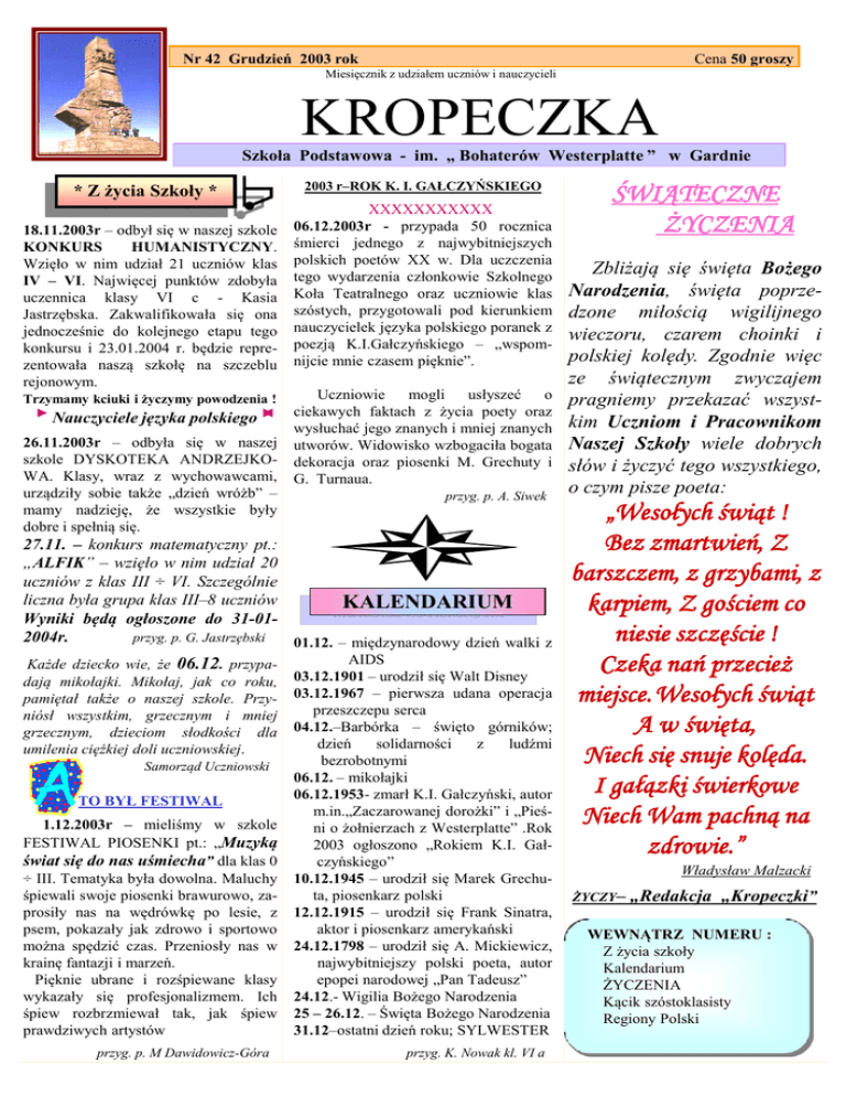 Nr 42 Grudzień 2003 rok Cena 50 groszy Miesięcznik z udziałem uczniów i nauczycieli KROPECZKA Szkoła Podstawowa - im. „ Bohaterów Westerplatte ” w Gardnie * Z życia Szkoły * 18.11.2003r – odbył się w naszej szkole KONKURS HUMANISTYCZNY. Wzięło w nim udział 21 uczniów klas IV – VI. Najwięcej punktów zdobyła uczennica klasy VI c - Kasia Jastrzębska. Zakwalifikowała się ona jednocześnie do kolejnego etapu tego konkursu i 23.01.2004 r. będzie reprezentowała naszą szkołę na szczeblu rejonowym. Trzymamy kciuki i życzymy powodzenia ! Nauczyciele języka polskiego 26.11.2003r – odbyła się w naszej szkole DYSKOTEKA ANDRZEJKOWA. Klasy, wraz z wychowawcami, urządziły sobie także „dzień wróżb” – mamy nadzieję, że wszystkie były dobre i spełnią się. 2003 r–ROK K. I. GAŁCZYŃSKIEGO XXXXXXXXXXX 06.12.2003r - przypada 50 rocznica śmierci jednego z najwybitniejszych polskich poetów XX w. Dla uczczenia tego wydarzenia członkowie Szkolnego Koła Teatralnego oraz uczniowie klas szóstych, przygotowali pod kierunkiem nauczycielek języka polskiego poranek z poezją K.I.Gałczyńskiego – „wspomnijcie mnie czasem pięknie”. Uczniowie mogli usłyszeć o ciekawych faktach z życia poety oraz wysłuchać jego znanych i mniej znanych utworów. Widowisko wzbogaciła bogata dekoracja oraz piosenki M. Grechuty i G. Turnaua. przyg. p. A. Siwek 27.11. – konkurs matematyczny pt.: „ALFIK” – wzięło w nim udział 20 uczniów z klas III ÷ VI. Szczególnie liczna była grupa klas III–8 uczniów KALENDARIUM Wyniki będą ogłoszone do 31-012004r. przyg. p. G. Jastrzębski 01.12. – międzynarodowy dzień walki z Każde dziecko wie, że 06.12. przypadają mikołajki. Mikołaj, jak co roku, pamiętał także o naszej szkole. Przyniósł wszystkim, grzecznym i mniej grzecznym, dzieciom słodkości dla umilenia ciężkiej doli uczniowskiej. Samorząd Uczniowski TO BYŁ FESTIWAL 1.12.2003r – mieliśmy w szkole FESTIWAL PIOSENKI pt.: „Muzyką świat się do nas uśmiecha” dla klas 0 ÷ III. Tematyka była dowolna. Maluchy śpiewali swoje piosenki brawurowo, zaprosiły nas na wędrówkę po lesie, z psem, pokazały jak zdrowo i sportowo można spędzić czas. Przeniosły nas w krainę fantazji i marzeń. Pięknie ubrane i rozśpiewane klasy wykazały się profesjonalizmem. Ich śpiew rozbrzmiewał tak, jak śpiew prawdziwych artystów przyg. p. M Dawidowicz-Góra AIDS 03.12.1901 – urodził się Walt Disney 03.12.1967 – pierwsza udana operacja przeszczepu serca 04.12.–Barbórka – święto górników; dzień solidarności z ludźmi bezrobotnymi 06.12. – mikołajki 06.12.1953- zmarł K.I. Gałczyński, autor m.in.„Zaczarowanej dorożki” i „Pieśni o żołnierzach z Westerplatte” .Rok 2003 ogłoszono „Rokiem K.I. Gałczyńskiego” 10.12.1945 – urodził się Marek Grechuta, piosenkarz polski 12.12.1915 – urodził się Frank Sinatra, aktor i piosenkarz amerykański 24.12.1798 – urodził się A. Mickiewicz, najwybitniejszy polski poeta, autor epopei narodowej „Pan Tadeusz” 24.12.- Wigilia Bożego Narodzenia 25 – 26.12. – Święta Bożego Narodzenia 31.12–ostatni dzień roku; SYLWESTER przyg. K. Nowak kl. VI a ŚWIĄTECZNE ŻYCZENIA Zbliżają się święta Bożego Narodzenia, święta poprzedzone miłością wigilijnego wieczoru, czarem choinki i polskiej kolędy. Zgodnie więc ze świątecznym zwyczajem pragniemy przekazać wszystkim Uczniom i Pracownikom Naszej Szkoły wiele dobrych słów i życzyć tego wszystkiego, o czym pisze poeta: „Wesołych świąt ! Bez zmartwień, Z barszczem, z grzybami, z karpiem, Z gościem co niesie szczęście ! Czeka nań przecież miejsce. Wesołych świąt A w święta, Niech się snuje kolęda. I gałązki świerkowe Niech Wam pachną na zdrowie.” Władysław Malzacki ŻYCZY– „Redakcja „Kropeczki” WEWNĄTRZ NUMERU : Z życia szkoły Kalendarium ŻYCZENIA Kącik szóstoklasisty Regiony Polski ŚWIĄTECZNY HUMOR - Policjant mówi do psa: daj głos! A, co to , Wigilia ? - Na lekcji wychowawczej nauczyciel pyta dzieci, kim chciałyby zostać, gdy dorosną. Jaś zaskoczył wszystkich. Chce zostać Świętym Mikołajem. Dlatego, że Święty Mikołaj rozdaje prezenty ? – pyta nauczycielka. Nie , dlatego, że pracuje tylko jeden dzień w roku ! - Rozmawiają dwa przedszkolaki: - Masz już choinkę ? - Mam, ale sztuczną. - A Święty Mikołaj był już u ciebie? - Był, ale też sztuczny. Jasio pisze list do Świętego Mikołaja: „Chciałbym narty, łyżwy, sanki i grypę na zakończenie ferii świątecznych”. przyg. Daniel Miesiak POZNAJ swój KRAJ - Gmina Karpacz jest typową gminą górską, leży bowiem w Karkonoszach w dolinie Łomnicy i jej dopływów u podnóża Śnieżki. Teren ten obejmuje najatrakcyjniejszą wschodnią część pasma górskiego. Miasto Karpacz położone jest w niezbyt szerokiej i stromej dolinie Łomnicy, na wysokości od 480m do 885m npm. Osią aglomeracji jest biegnąca serpentynami 7 km długości ulica, kończąca się na przełęczy Bierutowickiej na wysokości 820 m npm. Historię poznania Karkonoszy prezentuje otwarte w 1974 roku Muzeum Sportu i Turystyki Regionu Karkonoszy leżące w centrum miasta. Muzealna wystawa zaznajamia m.in. z miejscami pogańskiego kultu, poszukiwaniami karkonoskich skarbów przez walońskich górników i działalnością ludowych zielarzy-laborantów. Zbiory lalek i zabawek nieżyjącego już twórcy wrocławskiej pantomimy H.Tomaszewskiego wystawia Miejskie Muzeum Lalek w Karpaczu Górnym. Doskonałe warunki terenowe i pogodowe (w Karpaczu pokrywa śnieżna zalega przez 95 dni w roku) powodują, że Karpacz jest ośrodkiem sportów zimowych, stacją klimatyczną i punktem wyjściowym licznych szlaków turystycznych. Karpacz odległy o 110 km od stolicy Dolnego Śląska–Wrocławia - pełni również funkcję miejscowości wypoczynkowej. Z bogatą bazą wypoczynkowo – noclegową - ponad 11.000 miejsc no