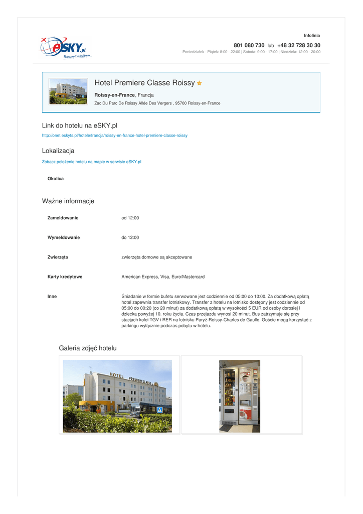 Infolinia 801 080 730 lub +48 32 728 30 30 Poniedziałek - Piątek: 8:00 - 22:00 | Sobota: 9:00 - 17:00 | Niedziela: 12:00 - 20:00 Hotel Premiere Classe Roissy Roissy-en-France, Francja Zac Du Parc De Roissy Allée Des Vergers , 95700 Roissy-en-France Link do hotelu na eSKY.pl http://onet.eskyts.pl/hotele/francja/roissy-en-france-hotel-premiere-classe-roissy Lokalizacja Zobacz położenie hotelu na mapie w serwisie eSKY.pl Okolica Ważne informacje Zameldowanie od 12:00 Wymeldowanie do 12:00 Zwierzęta zwierzęta domowe są akceptowane Karty kredytowe American Express, Visa, Euro/Mastercard Inne Śniadanie w formie bufetu serwowane jest codziennie od 05:00 do 10:00. Za dodatkową opłatą hotel zapewnia transfer lotniskowy. Transfer z hotelu na lotnisko dostępny jest codziennie od 05:00 do 00:20 (co 20 minut) za dodatkową opłatą w wysokości 5 EUR od osoby dorosłej i dziecka powyżej 10. roku życia. Czas przejazdu wynosi 20 minut. Bus zatrzymuje się przy stacjach kolei TGV i RER na lotnisku Paryż-Roissy-Charles de Gaulle. Goście mogą korzystać z parkingu wyłącznie podczas pobytu w hotelu. Galeria zdjęć hotelu Hotele – Bilety lotnicze – Tanie linie lotnicze – Ubezpieczenia Podróżne