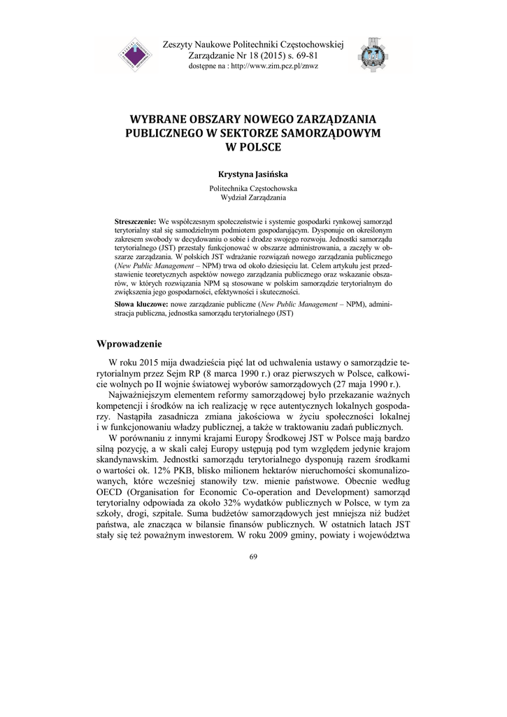 Zeszyty Naukowe Politechniki Wybrane obszary nowego zarządzania publicznego w Częstochowskiej sektorze samorządowym w Polsce Zarządzanie Nr 18 (2015) s. 69-81 dostępne na : http://www.zim.pcz.pl/znwz WYBRANE OBSZARY NOWEGO ZARZĄDZANIA PUBLICZNEGO W SEKTORZE SAMORZĄDOWYM W POLSCE Krystyna Jasińska Politechnika Częstochowska Wydział Zarządzania Streszczenie: We współczesnym społeczeństwie i systemie gospodarki rynkowej samorząd terytorialny stał się samodzielnym podmiotem gospodarującym. Dysponuje on określonym zakresem swobody w decydowaniu o sobie i drodze swojego rozwoju. Jednostki samorządu terytorialnego (JST) przestały funkcjonować w obszarze administrowania, a zaczęły w obszarze zarządzania. W polskich JST wdrażanie rozwiązań nowego zarządzania publicznego (New Public Management – NPM) trwa od około dziesięciu lat. Celem artykułu jest przedstawienie teoretycznych aspektów nowego zarządzania publicznego oraz wskazanie obszarów, w których rozwiązania NPM są stosowane w polskim samorządzie terytorialnym do zwiększenia jego gospodarności, efektywności i skuteczności. Słowa kluczowe: nowe zarządzanie publiczne (New Public Management – NPM), administracja publiczna, jednostka samorządu terytorialnego (JST) Wprowadzenie W roku 2015 mija dwadzieścia pięć lat od uchwalenia ustawy o samorządzie terytorialnym przez Sejm RP (8 marca 1990 r.) oraz pierwszych w Polsce, całkowicie wolnych po II wojnie światowej wyborów samorządowych (27 maja 1990 r.). Najważniejszym elementem reformy samorządowej było przekazanie ważnych kompetencji i środków na ich realizację w ręce autentycznych lokalnych gospodarzy. Nastąpiła zasadnicza zmiana jakościowa w życiu społeczności lokalnej i w funkcjonowaniu władzy publicznej, a także w traktowaniu zadań publicznych. W porównaniu z innymi krajami Europy Środkowej JST w Polsce mają bardzo silną pozycję, a w skali całej Europy ustępują pod tym względem jedynie krajom skandynawskim. Jednostki samorządu terytorialnego dysponują razem środkami o wartości ok. 12% PKB, blisko milionem hektarów nieruchomości skomunalizowanych, które wcześniej stanowiły tzw. mienie państwowe. Obecnie według OECD (Organisation for Economic Co-operation and Development) samorząd terytorialny odpowiada za około 32% wydatków publicznych w Polsce, w tym za szkoły, drogi, szpitale. Suma budżetów samorządowych jest mniejsza niż budżet państwa, ale znacząca w bilansie finansów publicznych. W ostatnich latach JST stały się też poważnym inwestorem. W roku 2009 gminy, powiaty i województwa 69 Krystyna Jasińska zainwestowały 42 mld zł (ok. 4 mld euro), m.in. na budowę dróg, wodociągów, kanalizacji, podczas gdy instytucje rządowe zagospodarowały jedynie 14 mld, co pokazuje, że w praktyce to JST odpowiadają w przeważającej części za rozwój infrastruktury cywilizacyjnej w kraju. Aby przyśpieszyć postęp cywilizacyjny kraju, realizują również liczne projekty współfinansowane ze środków UE 1. Biorąc pod uwagę znaczenie samorządów lokalnych w życiu każdego człowieka, poszukiwanie nowych metod zarządzania JST nabiera coraz większego znaczenia. Celem profesjonalnego zarządzania gminą/powiatem przez władze lokalne jest gospodarność, efektywność i skuteczność organizacji sektora publicznego, poprawa jakości świadczonych usług oraz lepsze ich dopasowanie do zmieniających się potrzeb społecznych i złożonych uwarunkowań zewnętrznych2. Efektywność w odniesieniu do realizacji zadań publicznych i samorządowych jest rozumiana jako zbiór relacji ekonomicznych w postaci przepływów pieniężnych pomiędzy uczestnikami działalności służącej realizacji zadań wyznaczonych prawem i zależy w znacznej mierze od trafności doboru oraz prawidłowości skonstruowania instrumentów pieniężnych, dzięki którym realizowane są procesy podziału i wymiany wytworzonych dóbr i usług3. Zasada gospodarności oznacza, że zasoby wykorzystywane przez instytucję w celu wykonywania jej działalności zostają udostępnione w wymaganym czasie, we właściwej ilości i jakości oraz po najlepszej cenie. Skuteczność działania JST ma zapewnić uzupełnienie „kultury przestrzegania przepisów” o „kulturę osiągania rezultatów” 4, czyli stopniowe przechodzenie od administrowania i przestrzegania procedur do osiągania zamierzonych celów, którymi są rozwój gminy, miasta, regionu i zaspokajanie potrzeb mieszkańców. Celem artykułu jest przedstawienie teoretycznych aspektów nowego zarządzania publicznego oraz wskazanie obszarów, w których rozwiązania NPM są stosowane w polskim samorządzie terytorialnym do zwiększenia jego gospodarności, efektywności i skuteczności. Pojecie i geneza koncepcji nowego zarządzania publicznego Początek lat osiemdziesiątych to okres nasilającej się krytyki tradycyjnego, opartego na zasadzie legalizmu, modelu funkcjonowania biurokracji. Nowe warunki społeczne i postępujące zmiany gospodarcze pod koniec lat siedemdziesiątych XX wieku wskazały na wiele słabości administracji publicznej, której ideowe załoWspółpraca polskich i norweskich samorządów w ramach projektu. Budowanie potencjału instytucjonalnego jednostek samorządu do lepszego dostarczania usług publicznych, praca zbiorowa Biura ZMP i KS, Poznań 2012, s. 11. 2 Nowe zarządzanie w polskim samorządzie terytorialnym, red. A. Zalewski, Oficyna Wydawnicza SGH, Warszawa 2005. 3 H. Sochacka-Krysiak, Niektóre problemy efektywności w gospodarce finansowej samorządu terytorialnego, [w:] W poszukiwaniu efektywności finansów publicznych, Księga jubileuszowa dedykowana Profesor Krystynie Piotrowskiej-Marczak, red. M. Wypych, S. Wieteska, Wydawnictwo Uniwersytetu Łódzkiego, Łódź 2000, s. 192. 4 Kontrola zarządcza w sektorze finansów publicznych. Istota, unormowania prawne i otoczenie. Kompendium wiedzy, Ministerstwo Finansów, Warszawa,