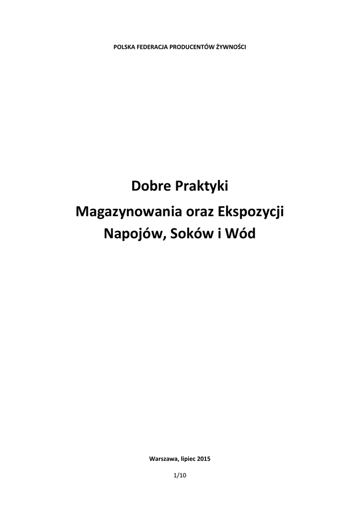 POLSKA FEDERACJA PRODUCENTÓW ŻYWNOŚCI Dobre Praktyki Magazynowania oraz Ekspozycji Napojów, Soków i Wód Warszawa, lipiec 2015 1/10 Wstęp. Z punktu widzenia jakości napojów, soków i wód oraz bezpieczeństwa konsumenta proces składowania i magazynowania jest tak samo ważny, jak proces produkcyjny, a dobro konsumenta jest nadrzędną wartością zarówno producentów, jak i instytucji odpowiedzialnych za bezpieczeństwo żywności. W niniejszym przewodniku prezentujemy Państwu podstawowe warunki składowania w magazynach, na zapleczach sklepów oraz w salach sprzedaży napojów, soków i wód, gwarantujące utrzymanie ich właściwej jakości. Wymagania te odnoszą się zarówno do dużych jednostek handlu detalicznego, hurtowni jak i małych punktów sprzedaży takie jak osiedlowe sklepy, bary, restauracje czy inne punkty, które prowadzą sprzedaż napojów, soków i wód. Poradnik, zawierający 10 podstawowych zasad dobrego magazynowania, powstał z inicjatywy Polskiej Federacji Producentów Żywności, zrzeszającej największych producentów artykułów spożywczych i napojów bezalkoholowych w Polsce. Poradnik jest jednym z elementów ogólnopolskiej kampanii edukacyjnej prowadzonej pod honorowym patronatem Głównego Inspektora Sanitarnego. Informacje zawarte w przewodniku zgodne są z wymaganiami Ustawy z dnia 25 sierpnia 2006 roku o bezpieczeństwie żywności i żywienia (Dz. U. Nr 171 poz. 1225 z późn. zm.) oraz Rozporządzeniem (WE) Nr 852/2004 Parlamentu Europejskiego i Rady z dnia 29 kwietnia w sprawie higieny środków spożywczych (Dz. Urz. UE L 139 z 30.04.2004, str. 1, z późn. zm.; Dz. Urz. UE Polskie wydanie specjalne, rozdz. 13, t. 34, str. 319) . 2/10 1. Sprawdzaj dostawę. Zawsze sprawdzaj jakość produktów i opakowań podczas dostawy towaru. Środki transportu mogą wpłynąć na jakość środków spożywczych, dlatego też tak istotne jest, aby były utrzymywane w dobrym stanie technicznym i higienicznym, zabezpieczającym przed zanieczyszczeniem i umożliwiającym zachowanie właściwej jakości zdrowotnej przewożonych produktów. Muszą posiadać powierzchnię ładunkową dostosowaną do rodzaju przewożonych środków spożywczych, a także konstrukcję umożliwiającą łatwe utrzymanie czystości i porządku oraz dezynfekcję. Osoba odbierająca produkt każdorazowo powinna sprawdzić stan przyjmowanego towaru oraz odmówić jego przyjęcia w przypadku, gdy towar nie spełnia odpowiednich standardów. Przed przyjęciem środków spożywczych do sprzedaży lub magazynu, odbiorca powinien sprawdzić: warunki transportu, w tym czystość środka transportu i opakowań, czas transportu i inne warunki mające wpływ na jakość zdrowotną przewożonych środków spożywczych oraz sposób załadowania zapobiegający ich zanieczyszczeniu, dokumentację dotyczącą środków spożywczych, w tym pochodzenia i identyfikowalności, producenta, daty produkcji, ilości i numeru partii, opakowania zbiorcze i jednostkowe, w szczególności czy nie występują obce zapachy, uszkodzenia, zawilgocenie, bombaż opakowań, nieobecność szkodników itp., oznakowanie środków spożywczych, a zwłaszcza termin przydatności do spożycia lub datę minimalnej trwałości, czytelność i trwałość oznakowania. 2. Chłodno i sucho. Przechowuj napoje, soki i wody w czystym, chłodnym i suchym miejscu. Nie dopuszczaj do przegrzania lub przemrożenia, ani składowania produktów bezpośrednio przy źródłach ciepła ( np. grzejnikach). Przechowywanie w zbyt wysokich jak i zbyt niskich temperaturach może mieć wpływ na pogorszenie jakości produktów, powodując utratę dwutlenku węgla w produktach gazowanych w butelkach PET, zmianę smaku napojów, soków i wód, wytrącenie osadu lub spowodować uszkodzenie opakowań. Zalecana temperatura składowania napojów, soków i wód wynosi 5-25oC. Jeżeli jednak specyfikacja wyrobu gotowego stanowi inaczej, zalecenia producenta są nadrzędnymi wytycznymi dotyczącymi składowania i przechowywania produktu. Należy zabezpieczyć produkt przed zamarznięciem. Produkt, który przemarzł, nie może być skierowany do sprzedaży. Istotne jest zapewnienie odpowiedniej cyrkulacji powietrza, która zapobiegnie powstawaniu w magazynie nadmiernych temperatur, wilgotności i zapylenia oraz usunie zanieczyszczone powietrze i ewentualne zapachy pochodzące z niektórych wyrobów gotowych. Otwory wentylacyjne muszą być osłonięte siatkami lub innego rodzaju osłonami zabezpieczającymi przed insektami. Magazyny należy wyposażyć w urządzenia do monitorowania i rejestracji temperatury i wilgotności powietrza. Zaleca się, by urządzenie monitorujące było umieszczone w okolicy przechowywania produktów najbardziej wrażliwych na te czynniki. Urządzenia monitorujące powinny być umieszczone w taki sposób, aby mogły monitorować warunki składowania produktów w zależności od wysokości składowania (w przypadku regałów wysokiego składowania, warunki panujące przy gruncie mogą się 3/10 różnić od tych przy stropie). Urządzenia te powinny być regularnie kalibrowane, a odczyty udokumentowane. Jeśli w magazynie odbywa się ładowanie akumulatorów do wózków widłowych, musi ono przebiegać z dala od miejsca składowania, w miejscu do tego wskazanym, spełniającym wszelkie wymagania BHP. 3. Unikaj promieni słonecznych. Przechowuj napoje, soki i wody w miejscach nie narażonych na bezpośrednie oddziaływanie promieni słonecznych. Produktu gotowego nie można przechowywać w miejscach narażonych na bezpośrednie oddziaływanie promieni słonecznych. Jeżeli w dachu lub w ścianach magazynu znajdują się okna bezpośrednio nad lub obok składowanych napojów, soków i wód, powinny być one zabezpieczone przed przepuszczaniem promieni słonecznych, np. poprzez zastosowanie folii z filtrem UV. Działanie promieni słonecznych na środki spożywcze, w tym na napoje, soki i wody, może prowadzić do niekorzystny
