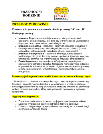 PRZEMOC W RODZINIE PRZEMOC W RODZINIE Przemoc – to proces wytworzenia układu przewagi ”A” nad „B” Rodzaje przemocy: przemoc fizyczna – ma miejsce wtedy, kiedy dziecko jest uderzane, dostaje klapsy, jest bite czy w inny sposób uszkadzane fizycznie. Jest stosowana przez długi czas. przemoc seksualna – zachodzi , kiedy dziecko jest wciągane w sytuacje seksualną przez dorosłego lub starsze dziecko (kontakt seksualny, nakłanianie do oglądania aktów, pornografii). przemoc emocjonalna – obejmuje sytuacje, kiedy dziecku systematycznie grozi, krzyczy na nie, upokarza, ignoruje, wyzywa, wyśmiewa, obwinia lub w inny sposób krzywdzi emocjonalnie. Zaniedbywanie – to sytuacja, w której nie są zaspokajane podstawowe potrzeby dziecka. Należą do nich: pożywne jedzenie, odpowiednie schronienie, ubranie, higiena, wsparcie emocjonalne, miłość i przywiązanie, wykształcenie, bezpieczeństwo, opieka medyczna Przemocy jednego rodzaju zwykle towarzyszy przemoc innego typu. W rodzinach o niskim statusie społecznym częściej są stosowane kary fizyczne i zaniedbywanie dziecka, a w rodzinach o wyższym statusie bardziej powszechne są kary psychiczne. Bardziej skłonny do przemocy wobec dziecka jest rodzic, który zdecydowanie dominuje w systemie rodzinnym. Sygnały ostrzegawcze: Zmiana w zachowaniu dziecka czy jego sprawowaniu w szkole Dziecko wygląda na czujne i ostrożne, łatwo je spłoszyć Dziecko ociąga się przy wychodzeniu ze szkoły lub z domu kolegi, niechętnie wraca do domu Dziecko poddawane przemocy fizycznej może: Mieć siniaki niewiadomego pochodzenia lub inne obrażenia Unikać kontaktów społecznych Zachowywać się agresywnie, niszczyć albo rzucać rzeczy Wyglądać na zaspane lub przemęczone Wyglądać na przestraszone w obecności rodziców lub innych osób dorosłych Wyglądać na przygnębione, smutne, często płakać Kłamać, kraść, kiwać się, ssać kciuk Starsze dziecko lub nastolatek może nadużywać, substancji psychoaktywnych, wykazywać ryzykowne zachowania seksualne, mieć zaburzenia jedzenia, inne zachowania o wysokim stopniu ryzyka np. uprawiać sporty ekstremalne. Dziecko wykorzystywane seksualnie może: Bać się określonej osoby albo określonych miejsc Reagować w sposób niezwykły na pytanie czy było przez kogoś dotykane Okazywać nieuzasadnione lęki przed badaniem lekarskim Rysować obrazki, które przedstawiają akty seksualne Uciekać Moczyć się Wyglądać na niezwykle skoncentrowane na genitaliach oraz seksualnych czynnościach i słowach Dziecko, które jest ofiarą przemocy emocjonalnej, może: Mieć trudności z zaprzyjaźnianiem się Unikać robienia rzeczy wspólnie z innymi dziećmi Wyglądać na bardzo przestraszone lub przygnębione Ciągle się czegoś domagać lub być bardzo posłuszne Zachowywać się jak osoba dorosła np. matkować innym dzieciom Zachowywać się tak jakby było młodsze niż jest np. ssać kciuk, kiwać się Moczyć się, wykazywać opóźnienie w rozwoju fizycznym i emocjonalnym Dokonywać prób samobójczych Dziecko zaniedbane, może: Mieć nie leczone dolegliwości lub brak opieki dentystycznej Spadek wagi lub nieadekwatne przybieranie na wadze Brak nadzoru osób dorosłych Częste nieobecności w szkole Jest brudne i nieuczesane Używa alkoholu lub innych środków psychoaktywnych W porównaniu z dziećmi, które nie doznały przemocy, te pokrzywdzone z większym prawdopodobieństwem mogą: Stać się ofiarami ofiarami przemocy w przyszłości Stać się sprawcami przemocy Uwikłać się w przyszłości w przestępczość kryminalną z udziałem przemocy. W dorosłym życiu mieć problemy zdrowotne: chroniczne bóle, astmę, otyłość, zaburzenia snu i czynności seksualnych, stany depresyjne itp.