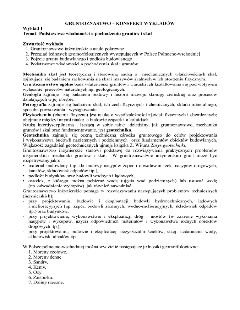 GRUNTOZNASTWO – KONSPEKT WYKŁADÓW Wykład I Temat: Podstawowe wiadomości o pochodzeniu gruntów i skał Zawartość wykładu 1. Gruntoznawstwo inżynierskie a nauki pokrewne 2. Przegląd jednostek geomorfologicznych występujących w Polsce Północno-wschodniej 3. Pojęcie gruntu budowlanego i podłoża budowlanego 4. Podstawowe wiadomości o pochodzeniu skał i gruntów Mechanika skał jest teoretyczną i stosowaną nauką o mechanicznych właściwościach skał, zajmującą się badaniem zachowania się skał i masywów skalnych w ich otoczeniu fizycznym. Gruntoznawstwo ogólne bada właściwości gruntów i warunki ich kształtowania się pod wpływem wyłącznie procesów naturalnych np. geologicznych. Geologia zajmuje się badaniem budowy i historii rozwoju skorupy ziemskiej oraz procesów działających w jej obrębie. Petrografia zajmuje się badaniem skał, ich cech fizycznych i chemicznych, składu mineralnego, sposobu powstawania i występowania. Fizykochemia (chemia fizyczna) jest nauką o współzależności zjawisk fizycznych i chemicznych; obejmuje między innymi naukę o budowie cząstek i o koloidach. Nauką interdyscyplinarną , łączącą w sobie takie dziedziny, jak gruntoznawstwo, mechanika gruntów i skał oraz fundamentowanie, jest geotechnika. Geotechnika zajmuje się oceną techniczną ośrodka gruntowego do celów projektowania i wykonawstwa budowli naziemnych i podziemnych oraz fundamentów obiektów budowlanych. Większość zagadnień geotechnicznych ujmuje książka Z. Wiłuna Zarys geotechniki. Gruntoznawstwo inżynierskie stanowi podstawę do rozwiązywania praktycznych problemów inżynierskich mechaniki gruntów i skał. W gruntoznawstwie inżynierskim grunt może być rozpatrywany jako: • materiał budowlany (np. do budowy nasypów zapór i obwałowań rzek, nasypów drogowych, kanałów, składowisk odpadów itp.), • podłoże budynków oraz budowli wodnych i lądowych, • ośrodek, z którego można pobierać wodę (ujęcia wód podziemnych) lub usuwać wodę (np. odwodnienie wykopów), jak również nawadniać. Gruntoznawstwo inżynierskie pomaga w rozwiązywaniu następujących problemów technicznych (inżynierskich): - przy projektowaniu, budowie i eksploatacji budowli hydrotechnicznych, lądowych i melioracyjnych (np. zapór, budowli ziemnych, wodno-melioracyjnych, składowisk odpadów itp.) oraz budynków, - przy projektowaniu, wykonawstwie i eksploatacji dróg i mostów (w zakresie wykonania nasypów i wykopów, użycia odpowiednich materiałów i wykonawstwa różnych obiektów drogowych itp.), - przy projektowaniu, budowie i eksploatacji oczyszczalni ścieków, stacji uzdatniania wody, składowisk odpadów itp. W Polsce północno-wschodniej można wydzielić następujące jednostki geomorfologiczne: 1. Moreny czołowe, 2. Moreny denne, 3. Sandry, 4. Kemy, 5. Ozy, 6. Zastoiska, 7. Doliny rzeczne, 8. Wydmy, 9. Pokrywy deluwialne, 10. Jeziora i bagna. Grunty budowlane są przedmiotem badań mechaniki gruntów i skał oraz gruntoznawstwa inżynierskiego. Grunt jako ośrodek skalny rozdrobniony składa się z oddzielnych ziarn i cząstek, pomiędzy którymi działają niewielkie siły przyciągania, znacznie mniejsze od wytrzymałości wewnętrznej samych ziarn i cząstek. Na potrzeby budownictwa przyjęto podział na dwie grupy o wyraźnie odmiennych właściwościach: - grunty niespoiste – sypkie, - Grunty spoiste mające spójność. Procesy geologiczne - wszystkie zjawiska, w wyniku których zachodzą zmiany na powierzchni skorupy ziemskiej lub w jej wnętrzu. Źródłem energii tych procesów są czynniki geologiczne wewnętrzne (endogeniczne) i zewnętrzne (egzogeniczne). Czynniki wewnętrzne to przede wszystkim bardzo wysokie ciśnienie górotworu i wysoka temperatura, panująca w głębszych strefach skorupy ziemskiej. Objawami tych czynników są zjawiska wulkaniczne, trzęsienie ziemi, przesuwanie się wielkich mas skorupy ziemskiej i ruchy tektoniczne. Wyróżnia się dwa główne rodzaje ruchów tektonicznych, które w przeszłości Ziemi (czasami również współcześnie) kształtowały właściwości skał Są to ruchy górotwórcze (orogeniczne), powodujące szybkie wypiętrzanie mas skalnych, często z ich rozrywaniem oraz ruchy powolnego, długotrwałego podnoszenia lub obniżania się lądów albo dna oceanów, zwane ruchami lądotwórczymi (epeirogenicznymi). Pionowe ruchy skorupy ziemskiej, zachodzące po okresie górotwórczości alpejskiej, tj. od schyłku trzeciorzędu po czasy współczesne, określa jako ruchy neotektoniczne Czynniki zewnętrzne to wpływ atmosfery (powietrza, wilgoci, deszczu, wiatru, promieni słonecznych) hydrosfery (wód płynących po powierzchni lub w skałach, mórz, lodowców) oraz życia organicznego. Pod wpływem działania tych czynników zachodzą następujące procesy geologiczne: Wietrzenie (fizyczne, chemiczne), Erozja (rzeczna, lodowcowa, powietrzna), Denudacja, polegająca na obniżeniu się powierzchni skał poprzez stałe usuwanie produktów wietrzenia i przenoszenia ich z wyższych miejsc terenu do niższych i stopniowym obniżaniu poziomu skały macierzystej, Transport materiałów zwietrzelinowych przez wiatr, wody i lodowce (nieraz na znaczne odległości), Akumulacja (osadzanie się produktów wietrzenia na lądzie lub środowisku wodnym). Skały ze względu na genezę (sposób powstania) dzieli się na trzy grupy: • Magmowe, • Osadowe, • Przeobrażone (metamorficzne). Skałami osadowymi nazywa się skały , które powstają w wyniku gromadzenia się ( akumulacji ) ziarn cząstek mineralnych lub organicznych w środowisku lądowym lub wodnym. Mogą to być produkty niszczenia starszych skał, wytrącania z roztworów wodnych lub działalności organizmów zwierzęcych lub roślinnych. Skały osadowe, ze względu na zróżnicowaną genezę dzieli się na trzy grupy: • skały okruchowe (klastyczne), • skały chemiczne, • skały organiczne. Skałami okruchowy