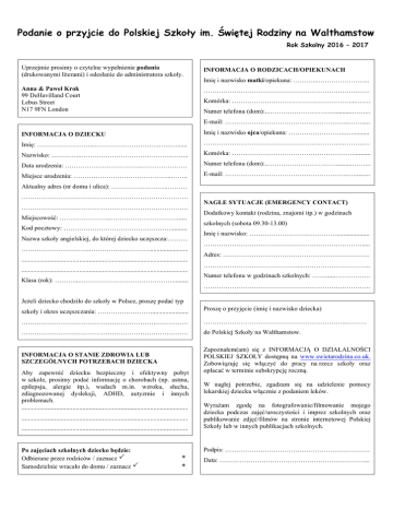 Podanie o przyjcie do Polskiej Szkoły im. Świętej Rodziny na Walthamstow Rok Szkolny 2016 – 2017 Uprzejmie prosimy o czytelne wypełnienie podania (drukowanymi literami) i odesłanie do administratora szkoły. INFORMACJA O RODZICACH/OPIEKUNACH Anna & Pawel Krok 99 DeHavilland Court Lebus Street N17 9FN London …………………………………………………………….…… Imię i nazwisko matki/opiekuna: ………...…………………... Komórka: ………………………………………………...……. Numer telefonu (dom):..…………………………...........……... E-mail: ………………………………………………...……..... INFORMACJA O DZIECKU Imię i nazwisko ojca/opiekuna: ……………………...….......... Imię: ……………………...………….………….….…..…....... ……………………………………………………………….… Nazwisko: …………..………………………….……….……... Komórka: …….……………………………….………….......... Data urodzenia: ……………………………..………………… Numer telefonu (dom):..…………………………...........……... Miejsce urodzenia: ……………………………………...…….. E-mail: ………………………………………………...…......... Aktualny adres (nr domu i ulica): ……………………..……… …………………………………………………………………. ……………………………………………………………….… Miejscowość: …………………...…………………………...... Kod pocztowy: …………………………………….…….......... Nazwa szkoły angielskiej, do której dziecko uczęszcza:……… ………………………….………………………........................ ..................................................................................................... ..................................................................................................... Klasa (rok): ………...…………………………………….......... NAGŁE SYTUACJE (EMERGENCY CONTACT) Dodatkowy kontakt (rodzina, znajomi itp.) w godzinach szkolnych (sobota 09.30-13.00) Imię i nazwisko: ……………….………………….................... ………………………………………………………………..... Adres: …………………………………………………………. ……………………………………...………………………….. Numer telefonu w godzinach szkolnych: ……......……………. …………………………………………………………………. Jeżeli dziecko chodziło do szkoły w Polsce, proszę podać typ szkoły i okres uczęszczania: ……………………....................... Proszę o przyjęcie (imię i nazwisko dziecka) …………………………………………………….…………… ………………………………………………………...……… ………………………………………………………….……… do Polskiej Szkoły na Walthamstow. INFORMACJA O STANIE ZDROWIA LUB SZCZEGÓLNYCH POTRZEBACH DZIECKA Zapoznałem(am) się z INFORMACJĄ O DZIAŁALNOŚCI POLSKIEJ SZKOŁY dostępną na www.swietarodzina.co.uk. Zobowiązuję się włączyć do pracy na rzecz szkoły oraz opłacać w terminie subskrypcję roczną. Aby zapewnić dziecku bezpieczny i efektywny pobyt w szkole, prosimy podać informację o chorobach (np. astma, epilepsja, alergie itp.), wadach m.in. wzroku, słuchu, zdiagnozowanej dysleksji, ADHD, autyzmie i innych problemach. ..................................................................................................... ..................................................................................................... ..................................................................................................... Po zajęciach szkolnych dziecko będzie: Odbierane przez rodziców / zaznacz P Samodzielnie wracało do domu / zaznacz P W nagłej potrzebie, zgadzam się na udzielenie pomocy lekarskiej dziecku włącznie z podaniem leków. Wyrażam zgodę na fotografowanie/filmowanie mojego dziecka podczas zajęć/uroczystości i imprez szkolnych oraz publikowanie zdjęć/filmów na stronie internetowej Polskiej Szkoły lub w innych publikacjach szkolnych. Podpis: ………………………………………………………… * * Data: …………………………………………………………... Przyjęcia do Polskiej Szkoły na rok 2016 – 2017 Szanowni Państwo, PSS Walthamstow prowadzi obecnie zapisy na nowy rok szkolny 2016-2017. Podobnie jak w latach ubiegłych, dzieci obecnie uczęszczające do naszej szkoły mają pierwszeństwo miejsc na listach uczniów. Aby zagwarantować to miejsce należy potwierdzić chęć kontynuacji nauki u dyrekcji szkoły, poprzez dostarczenie wypełnionego podania na rok 2016-2017 oraz dokonanie wpłaty depozytu w wysokości £50 na poczet nowego roku szkolnego do dnia 19 marca 2016. Niestety, jeśli nie otrzymamy podania oraz depozytu do 19 marca 2016 nie będziemy w stanie zagwarantować miejsca w naszej szkole w kolejnym roku szkolnym. W związku z powyższym zachęcam wszystkich rodziców, którzy chcieliby, aby ich dzieci kontynuowały naukę w Polskiej Szkole im. Świętej Rodziny o kontakt z nami. Z poważaniem, Pawel Krok PSS Walthamstow