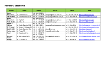 Hostele w Szczecinie Nazwa Nowa Sztukateria City HOSTEL Nowa Sztukateria Firlik Hostel Hostel u Adriana Gryf Hostel CUMA SSM Hostel Arbet Koral Migrand Hostel Szwejk Adres Telefon +48 664 080 233 +48 91 817 19 21 +48 91 422 58 88 +48 664 080 233 ul. Śląska 4 +48 91 817 19 21 ul. Firlika 43 +48 91 428 23 24 +48 91 488 70 05 ul. Monte Cassino 34/2 +48 602 315 814 ul. Wojska Polskiego 49 +48 91 48 08 400 ul. Monte Cassino 19 A +48 91 422 74 61 ul. Piesza 11 +48 91 462 31 37 ul. Boguchwały 8A +48 91 423 66 14 +48 91 442 09 60 ul. Robotnicza 28/29 +48 722 393 138 +48 91 889 26 06 ul. Ku Słońcu 33 +48 515 175 539 ul. Kuśnierska 13 ul. Jana Kazimierza 14 E-mail cena www [email protected] [email protected] od 140 zł do 190 zł od 40 zł do 180 zł http://sztuka.teria.eu/pl/ http://www.cityhostel.com.pl/ [email protected] [email protected] od 135zł do 205zł od 30 zł do 160 zł http://sztuka.teria.eu/pl/ http://www.firlik.com.pl/ [email protected] od 25 zł do 30 zł od 109 zł do 220 zł [email protected] od 20 zł do 120 zł [email protected] od 30 zł do 114 zł od 65 zł do 120 zł [email protected] http://pokojegoscinne.szczecin.pl/ http://www.noclegszczecin.com/ http://ptsm.home.pl/ http://www.hostelarbet.pl http://www.noclegi-szczecin.com/ od 69 zł do 100 zł http://www.migrand.pl/index.html od 23 zł do 81 zł http://szwejk-szczecin.pl/