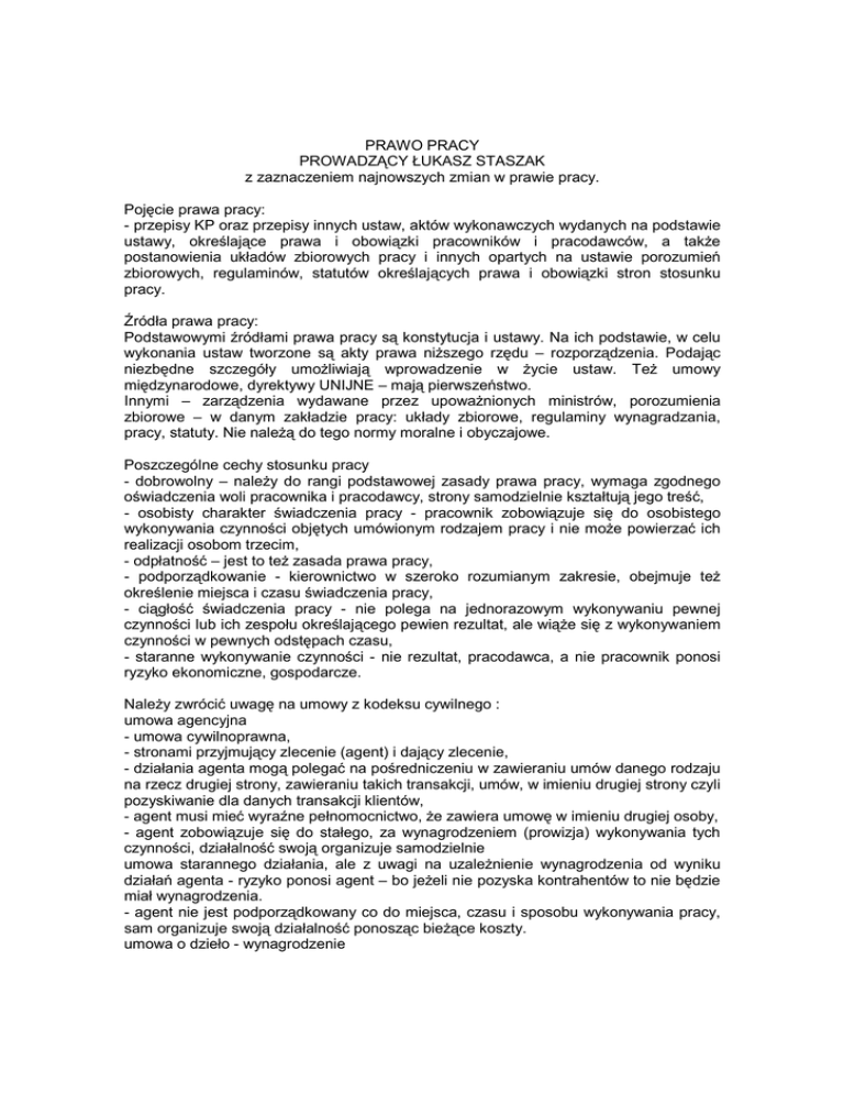 PRAWO PRACY PROWADZĄCY ŁUKASZ STASZAK z zaznaczeniem najnowszych zmian w prawie pracy. Pojęcie prawa pracy: - przepisy KP oraz przepisy innych ustaw, aktów wykonawczych wydanych na podstawie ustawy, określające prawa i obowiązki pracowników i pracodawców, a takŜe postanowienia układów zbiorowych pracy i innych opartych na ustawie porozumień zbiorowych, regulaminów, statutów określających prawa i obowiązki stron stosunku pracy. Źródła prawa pracy: Podstawowymi źródłami prawa pracy są konstytucja i ustawy. Na ich podstawie, w celu wykonania ustaw tworzone są akty prawa niŜszego rzędu – rozporządzenia. Podając niezbędne szczegóły umoŜliwiają wprowadzenie w Ŝycie ustaw. TeŜ umowy międzynarodowe, dyrektywy UNIJNE – mają pierwszeństwo. Innymi – zarządzenia wydawane przez upowaŜnionych ministrów, porozumienia zbiorowe – w danym zakładzie pracy: układy zbiorowe, regulaminy wynagradzania, pracy, statuty. Nie naleŜą do tego normy moralne i obyczajowe. Poszczególne cechy stosunku pracy - dobrowolny – naleŜy do rangi podstawowej zasady prawa pracy, wymaga zgodnego oświadczenia woli pracownika i pracodawcy, strony samodzielnie kształtują jego treść, - osobisty charakter świadczenia pracy - pracownik zobowiązuje się do osobistego wykonywania czynności objętych umówionym rodzajem pracy i nie moŜe powierzać ich realizacji osobom trzecim, - odpłatność – jest to teŜ zasada prawa pracy, - podporządkowanie - kierownictwo w szeroko rozumianym zakresie, obejmuje teŜ określenie miejsca i czasu świadczenia pracy, - ciągłość świadczenia pracy - nie polega na jednorazowym wykonywaniu pewnej czynności lub ich zespołu określającego pewien rezultat, ale wiąŜe się z wykonywaniem czynności w pewnych odstępach czasu, - staranne wykonywanie czynności - nie rezultat, pracodawca, a nie pracownik ponosi ryzyko ekonomiczne, gospodarcze. NaleŜy zwrócić uwagę na umowy z kodeksu cywilnego : umowa agencyjna - umowa cywilnoprawna, - stronami przyjmujący zlecenie (agent) i dający zlecenie, - działania agenta mogą polegać na pośredniczeniu w zawieraniu umów danego rodzaju na rzecz drugiej strony, zawieraniu takich transakcji, umów, w imieniu drugiej strony czyli pozyskiwanie dla danych transakcji klientów, - agent musi mieć wyraźne pełnomocnictwo, Ŝe zawiera umowę w imieniu drugiej osoby, - agent zobowiązuje się do stałego, za wynagrodzeniem (prowizja) wykonywania tych czynności, działalność swoją organizuje samodzielnie umowa starannego działania, ale z uwagi na uzaleŜnienie wynagrodzenia od wyniku działań agenta - ryzyko ponosi agent – bo jeŜeli nie pozyska kontrahentów to nie będzie miał wynagrodzenia. - agent nie jest podporządkowany co do miejsca, czasu i sposobu wykonywania pracy, sam organizuje swoją działalność ponosząc bieŜące koszty. umowa o dzieło - wynagrodzenie nie musi mieć charakteru okresowego, tak jak to w przypadku umowy o pracę, ale jednorazowe, niekoniecznie pienięŜne – ryczałtowe, kosztorysowe. JeŜeli są wątpliwości – wola stron jest waŜna, nie liczy się formalna nazwa umowy, ale jej rzeczywisty charakter. umowa zlecenia opiekunka dziecka, która zajmuje się ich dzieckiem w domu pięć dni w tygodniu w określonych godzinach, nie podlega bieŜącym poleceniem tzn. nie mówią jak się bawić z dzieckiem. Zamiast niej gdy jest chora kto inny moŜe sprawować opiekę. Kodeks pracy nie podaje definicji umowy o pracę, lecz stwierdza w art. 22. § 1. Przez nawiązanie stosunku pracy pracownik zobowiązuje się do wykonywania pracy określonego rodzaju na rzecz pracodawcy i pod jego kierownictwem oraz w miejscu i czasie wyznaczonym przez pracodawcę, a pracodawca - do zatrudniania pracownika za wynagrodzeniem. § 11. Zatrudnienie w warunkach określonych w § 1 jest zatrudnieniem na podstawie stosunku pracy, bez względu na nazwę zawartej przez strony umowy. § 12. zakaz zastępowania umów o pracę umowami cywilnoprawnymi Nie jest dopuszczalne zastąpienie umowy o pracę umową cywilnoprawną przy zachowaniu warunków wykonywania pracy, określonych w § 1. Nie oznacza to jednak, ze pracodawca nie moŜe zatrudnić na umowę zlecenia lub o dzieło. Art. 221. § 1. Pracodawca ma prawo Ŝądać od osoby ubiegającej się o zatrudnienie podania danych osobowych obejmujących: 1) imię (imiona) i nazwisko, 2) imiona rodziców, 3) datę urodzenia, 4) miejsce zamieszkania (adres do korespondencji), 5) wykształcenie, 6) przebieg dotychczasowego zatrudnienia. § 2. Pracodawca ma prawo Ŝądać od pracownika podania, niezaleŜnie od danych osobowych, o których mowa w § 1, takŜe: 1) innych danych osobowych pracownika, a takŜe imion i nazwisk oraz dat urodzenia dzieci pracownika, jeŜeli podanie takich danych jest konieczne ze względu na korzystanie przez pracownika ze szczególnych uprawnień przewidzianych w prawie pracy, 2) numeru PESEL pracownika nadanego przez Rządowe Centrum Informatyczne Powszechnego Elektronicznego Systemu Ewidencji Ludności (RCI PESEL). § 3. Udostępnienie pracodawcy danych osobowych następuje w formie oświadczenia osoby, której one dotyczą. Pracodawca ma prawo Ŝądać udokumentowania danych osobowych osób, o których mowa w § 1 i 2. § 4. Pracodawca moŜe Ŝądać podania innych danych osobowych niŜ określone w § 1 i 2, jeŜeli obowiązek ich podania wynika z odrębnych przepisów. § 5. W zakresie nieuregulowanym w § 1-4 do danych osobowych, o których mowa w tych przepisach, stosuje się przepisy o ochronie danych osobowych. Termin nawiązania stosunku pracy art. 26 kp Art. 26. Stosunek pracy nawiązuje się w terminie określonym w umowie jako dzień rozpoczęcia pracy, a jeŜeli terminu tego nie określono - w dniu zawarcia umowy obowiązek sprecyzowania w umowie terminu rozpoczęcia pracy dotyczy więc tylko przypadków gdy podjęcie pracy ma nastąpić w terminie późniejszym niŜ dzień zawarcia umowy. Podmioty stos