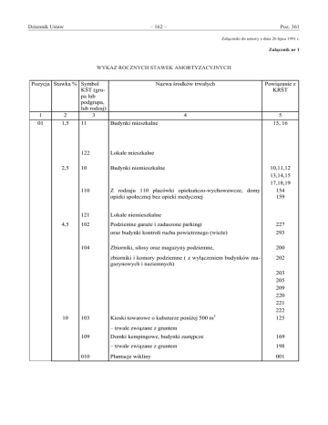 169 Dziennik Ustaw – 162 – Załącznik nr 1 Poz. 361 Załączniki do ustawy z dnia 26 lipca 1991 r. Załącznik nr 1 WYKAZ ROCZNYCH STAWEK AMORTYZACYJNYCH WYKAZ ROCZNYCH STAWEK AMORTYZACYJNYCH Pozycja Stawka % Symbol KŚT (grupa lub podgrupa, lub rodzaj) 1 2 3 01 1,5 2,5 4,5 Powiązanie z KRŚT 4 5 11 Budynki mieszkalne 122 Lokale mieszkalne 10 Budynki niemieszkalne 110 Z rodzaju 110 placówki opiekuńczo-wychowawcze, domy opieki społecznej bez opieki medycznej 121 Lokale niemieszkalne 102 Podziemne garaże i zadaszone parkingi 227 oraz budynki kontroli ruchu powietrznego (wieże) 293 Zbiorniki, silosy oraz magazyny podziemne, 200 zbiorniki i komory podziemne ( z wyłączeniem budynków magazynowych i naziemnych) 202 104 10 Nazwa środków trwałych 103 Kioski towarowe o kubaturze poniżej 500 m3 15, 16 10,11,12 13,14,15 17,18,19 154 159 203 205 209 220 221 222 125 – trwale związane z gruntem 109 010 Domki kempingowe, budynki zastępcze 169 – trwale związane z gruntem 198 Plantacje wikliny 001 170 – 163 – Dziennik Ustaw 02 2,5 224 21 Poz. 361 Budowle wodne, z wyjątkiem melioracji, doków stałych zalądowionych, wałów i grobli 250 251 Budowle sklasyfikowane jako budowle do 253 254 255 259 293 297 256 uzdatniania wód, z wyjątkiem studni wierconych 03 290 Budowle sportowe i rekreacyjne, z wyłączeniem ogrodów i parków publicznych, skwerów, ogrodów botanicznych i zoologicznych 28 4,5 291 225 226 2 Wieże przeciwpożarowe Melioracje podstawowe Melioracje szczegółowe Obiekty inżynierii lądowej i wodnej, z wyłączeniem ogrodów i parków publicznych, skwerów, ogrodów botanicznych i zoologicznych 291 01 01 2 10 211 651 14 20 221 202 200 Przewody sieci technologicznych wewnątrzzakładowych Urządzenia zabezpieczające ruch pociągów Z rodzaju 202 wieże ekstrakcyjne Z rodzaju 200 wieże wiertnicze, wieżo maszty 3 323 324 325 326 343 Kotły i maszyny energetyczne Silniki spalinowe na paliwo lekkie Silniki spalinowe na paliwo ciężkie Silniki spalinowe na paliwo gazowe Silniki powietrzne Z rodzaju 343 zespoły elektroenergetyczne przenośne z silnikami spalinowymi na paliwo lekkie 3 323 324 325 326 343 344 Zespoły elektroenergetyczne z silnikami spalinowymi na paliwo ciężkie Reaktory jądrowe 344 431 - 0 filtry (prasy) błotniarki 431 - 4 cedzidła mechaniczne 431 7 14 349 04 7 431 680 507 510 349 171 – 164 – Dziennik Ustaw 450 Piece do przerobu surowców (z wyjątkiem 450 - 50 piece do przerobu surowca wielokomorowe) 450 451 Piece do przetwarzania paliw ( z wyjątkiem 451 - 0 piece koksownicze) 451 454 475 477 Piece do wypalania tunelowe Aparaty bębnowe Suszarki komorowe: 477-0 do 4 oraz 477-6 do 8 Maszyny, urządzenia i aparaty ogólnego zastosowania 454 475 477 10 4 14 41 44 46 18 Poz. 361 Obrabiarki do metali Maszyny i urządzenia do przetłaczania i sprężania cieczy i gazów Aparaty do wymiany ciepła (z wyjątkiem rodzaju 465 i 469-0) 4 40,41 44 46 47 Maszyny, urządzenia i aparaty do operacji i procesów materiałowych (z wyjątkiem rodzaju 474, 475, 4770 do 4 i 6-8 oraz 479-0) 47 449 Z rodzaju 449-90 urządzenia dystrybucyjne do benzyny i olejów elektryczne i przepływomierze składowe 449 465 469 474 479 481 482 484 do cieczy i paliw płynnych Z rodzaju 465 wymienniki płynów obiegowych przy produkcji sody 469-0 chłodnice odmulin i prób kołowych rozkładni gazu Kolumny nitracyjne i denitracyjne 479-0 odbieralnice hydrauliczne rozkładni gazu Aparaty i urządzenia do powierzchniowej obróbki metali sposobem chemicznym i elektrogalwanicznym Aparaty i urządzenia do powierzchniowej obróbki metali sposobem cieplnym 484-0 urządzenia do spawania i napawania łukowego w ochronie gazów oraz do spawania i napawania plazmowego Z rodzaju 484-1 wytwornice acetylenowe przenośne wysokiego ciśnienia, 484-3 zgrzewarki oporowe i tarcicowe Z rodzaju 484-6 urządzenia do metalizacji natryskowej i do natryskiwania tworzywami sztucznymi 465 469 474 479 481 482 484 172 – 165 – Dziennik Ustaw 490 Maszyny i urządzenia do przygotowywania maszynowych nośników danych oraz maszyny analityczne 490 492 Samodzielne urządzenia do automatycznej regulacji i sterowania procesami 492 493 434 Z rodzaju 493 roboty przemysłowe 434-01 maszyny do zamykania słoi Z rodzaju 434-02 maszyny do zamykania puszek 493 434 465 Wymienniki przeponowe rurowe sklasyfikowane jako chłodnice kwasu siarkowego 465 30 491 Zespoły komputerowe 491 7 506 506-1 i 506-2 aparaty do rektyfikacji powietrza 506 507 507-2 i 507-3 krystalizatory 507-4 komory potne 548-0 maszyny, urządzenia i aparaty do produkcji materiału zecerskiego 507 583-0 koparki i zwałowarki w kopalniach odkrywkowych węgla 583 20 05 Poz. 361 548 583 548 583-1 koparki w piaskowniach przemysłu węglowego 10 512 Maszyny i urządzenia do eksploatacji otworów wiertniczych 512 513 Maszyny i urządzenia do przeróbki mechanicznej rud i węgla 513 514 514-0 maszyny i urządzenia aglomerowni 514 514-1 maszyny i urządzenia wielkopiecowe 514-2 maszyny i urządzenia hutnicze stalowni Z rodzaju 514-3 do 6 nożyce hutnicze do cięcia na gorąco, tabor hutniczy, walcowniczy 514-9 inne maszyny, urządzenia i aparaty hutnicze 520 Z rodzaju 520 maszyny i urządzenia przemysłu kamieniarskiego: 520-0 i 520-1 traki ramowe i tarczowe 520 173 – 166 – Dziennik Ustaw Poz. 361 520-2 cyrkulaki 520-3 szlifierki 520-4 tokarki i wiertarki do kamienia 520-5 kombajny do robót przygotowawczych 523 Maszyny i urządzenia przemysłu cementowego 523 525 529 525-31 autoklawy Z rodzaju 529 maszyny i urządzenia do produkcji materiałów budowlanych: 525 529 56 14 18 529-81 do produkcji elementów z lastryko 529-82 do produkcji sztucznego kamienia Maszyny, urządzenia i aparaty przemysłów rolnych 56 582 Z rodzaju 582-1 pojemniki do bitumu stalowe powyżej 20.000 l pojemności oraz z rodzaju 582-2 odśnieżarki o mocy silników powyżej 120 KM 582 50 Maszyny, urządzenia i aparaty przemysłu chemicznego 50 517 52 Maszyny i urządzenia torfiarski