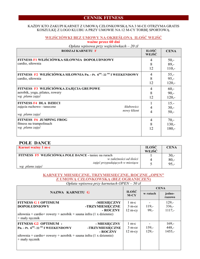 CENNIK FITNESS KAŻDY KTO ZAKUPI KARNET Z UMOWĄ CZŁONKOWSKĄ NA 3 M-CE OTRZYMA GRATIS KOSZULKĘ Z LOGO KLUBU A PRZY UMOWIE NA 12 M-CY TORBĘ SPORTOWĄ. WEJŚCIÓWKI BEZ UMOWY NA OKREŚLONĄ ILOŚĆ WEJŚĆ ważne przez 60 dni Opłata wpisowa przy wejściówkach – 20 zł ILOŚĆ WEJŚĆ CENA FITNESS F1 WEJŚCIÓWKA SIŁOWNIA DOPOŁUDNIOWY cardio, siłownia 4 8 12 50,89,110,- FITNESS F2 WEJŚCIÓWKA SIŁOWNIA Pn. - Pt. 6ºº- 22 ºº I WEEKENDOWY cardio, siłownia 4 8 12 55,95,120,- FITNESS F3 WEJŚCIÓWKA ZAJĘCIA GRUPOWE aerobik, yoga, pilates, rowery wg planu zajęć 4 8 12 60,90,120,- 1 4 4 15.30,50,- 4 8 12 70,130,180,- ILOŚĆ WEJŚĆ CENA 1 4 5 30,80,95,- RODZAJ KARNETU F FITNESS F4 DLA DZIECI zajęcia ruchowo - taneczne ( wg planu zajęć klubowicz nowy klient FITNESS F6 JUMPING FROG fitness na trampolinach wg planu zajęć POLE DANCE Karnet ważny 1 m-c FITNESS F5 WEJŚCIÓWKA POLE DANCE - taniec na rurach w zależności od ilości z zajęć przypadających w miesiącu wg planu zajęć KARNETY MIESIĘCZNE, TRZYMIESIĘCZNE, ROCZNE „OPEN” Z UMOWĄ CZŁONKOWSKĄ (BEZ OGRANICZEŃ) Opłata wpisowa przy karnetach OPEN – 50 zł CENA NAZWA KARNETU G ILOŚĆ M-CY w ratach jednorazowo FITNESS G 1 OPTIMUM -MIESIĘCZNY DOPOŁUDNIOWY -TRZYMIESIĘCZNE - ROCZNY siłownia + cardio+ rowery + aerobik + sauna infra (1 x dziennie) + mały ręcznik 1 m-c 3 m-ce 12 m-cy 119,99,- 129,336,1117,- - MIESIĘCZNY Pn. - Pt. 6ºº- 22 ºº I WEEKENDOWY -TRZYMIESIĘCZNE - ROCZNY siłownia + cardio+ rowery + aerobik + sauna infra (1 x dziennie) + mały ręcznik 1 m-c 3 m-ce 12 m-cy 159,129,- 169,448,1455,- FITNESS G2 OPTIMUM : FITNESS G3 SILVER DOPOŁUDNIOWY: - MIESIĘCZNY -TRZYMIESIĘCZNE - ROCZNY siłownia + cardio + rowery + aerobik + sauna infra (1 x dziennie) + 2 x basen 70 min + ręcznik kąp. + szlafrok 1 m-c 3 m-ce 12 m-cy 149,129,- 159,420,1455,- FITNESS G 4 SILVER - MIESIĘCZNY Pn. - Pt. 6ºº- 22 ºº I WEEKENDOWY -TRZYMIESIĘCZNE - ROCZNY siłownia + cardio + rowery + aerobik + sauna infra (1 x dziennie) + 2 x basen 70 min + ręcznik kąp.+ szlafrok 1 m-c 3 m-ce 12 m-cy 189,154,- 199,533,1737,- FITNESS G5 ULGOWY 1-12 m-cy 6ºº-18ºº SENIOR 60 +, STUDENT do 25 lat, MŁODZIEŻ 5-18 lat siłownia + cardio+ rowery + aerobik + sauna infra (1 x dziennie) FITNESS G6 KOBIETA W CIĄŻY (zaświadczenie lekarskie) siłownia + cardio+ rowery + aerobik + sauna infra (1 x dziennie) FITNESS G7 WEEKENDOWY 1m. - 89,2 m.- 178,3 m.- 251,89,-x ilość .................. m-cy .............itp. 12m.-1004,- „x” m-cy 79,- x ilość 1m. - 79,m-cy 2m.- 158,3m.- 223,..................... .............itp. 9m.- 668,„x” m-cy 89,- x ilość m-cy siłownia + cardio+ rowery + aerobic + sauna infra (1 x dziennie) - MIESIĘCZNY - TRZYMIESIĘCZNE - ROCZNY siłownia + cardio + rowery + aerobic + sauna infra - bez ograniczeń + basen (100 min): atrakcje , jacuzzi , Świat Saun, solarium + ręcznik kąp. + szlafrok FITNESS G8 PRESTIGE FIT (fitness + basen) FITNESS G9 SIŁOWNIA OPEN bez ograniczenia ilości wejść i czasu siłownia, rowery, sauna infra (1 x dziennie) FITNESS GX10 ROWERY OPEN rowery, sauna infra (1 x dziennie) obniżona opłata wpisowa - 30 zł FITNESS GX11 PRESTIGE GOLD (fitness + basen) - MIESIĘCZNY - TRZYMIESIĘCZNE - ROCZNY siłownia + cardio + rowery + aerobic + sauna infra + basen : atrakcje , jacuzzi , Świat Saun, solarium ( bez ograniczeń czasowych) + ręcznik kąp. + szlafrok 1 m-c 3 m-ce 12 m-cy 360,280,- 1-12 m-cy 129,- x ilość m-cy „x” m-cy 1 m-c 3 m-ce 12 m-cy 1m. - 89,2 m.- 178,3 m.- 251,12m.-1004,- 1 m. - 129,2 m.- 240,(upust 3 m.- 360,6-10% przy 4 m.- 480,płatności 5 m.- 600,z góry) 6 m.- 700,89,- x 1 m. - 89,ilość m-cy 3 m.- 251,12m.-1004,479,399,- Objaśnienia: - „ DOPOŁUDNIOWY”- „ POPOŁUDNIOWY”- „ CAŁODNIOWY” - „ WEEKENDOWY”- „ ULGOWY”- 395,1015,3158,- od Pn – Pt w godz. 6 °° - 14 ³° od Pn – Pt w godz. 14 ³° - 22 °° od Pn – Pt w godz. 6 °° - 22 °°, Sob 8 °° - 20 °°, Ndz 8 °° - 18 °° od Pt godz. 18 ºº do Ndz godz. 18 ºº dla dzieci od 3 do 14 lat dla młodzieży od 15–18 lat, młodzieży uczącej się i studentów do 25 lat studiów dziennych za okazaniem legitymacji dla rencistów, seniorów 60 + za okazaniem dow. tożsam. i leg. Rencisty 499,1350,4500,- FITNESS H2 JEDNORAZOWE WEJŚCIE OPEN siłownia, aerobik, yoga, rowery, jumping , bez ograniczenia czasu FITNESS ZZ FIT JEDNORAZOWE WEJŚCIE OPEN „ FREE-PASS ” siłownia, aerobik, rowery, yoga, bez ograniczenia czasu FITNESS H1 JEDNORAZOWE WEJŚCIE NA 1 ZAJĘCIA GRUPOWE LUB SIŁOWNIE (do wyboru) 35,pierwsze wejście gratis*- FREE-PAS w towarzystwie konsultanta i trenera 25,- OPŁATY DODATKOWE: Opłata wpisowa dla Członków Klubu – 50 zł Opłata wpisowa dla karnetów bez umowy – 20 zł Opłata transferowa (przeniesienie praw członkowskich na osobę trzecią) - 70 zł DIETETYK : Pierwsza wizyta u dietetyka- J1 – badanie Analizy składu ciała + indywidualne ułożony plan żywieniowy (60 min) -120 zł Kolejna wizyta u dietetyka J2 – wizyty kontrolne + nowy plan żywieniowy (60 min) – 100 zł Kolejna wizyta bez nowej diety J7– wizyta kontrolna bez rozpisania planu żywieniowego + badanie Analizy Składu Ciała (60 min) - 50 zł Konsultacja dietetyczna– sesja psychodietetyczna (diet coachingowa) bez rozpisania planu żywieniowego ( 60 min) – 80 zł Badanie Analizy Składu Ciała J5 i omówienie wyników (15 min) – 30 zł Badanie Analizy Składu Ciała J6 i omówienie wyników dla osób z kartą klubową (15 min)-25 zł Dietetyk przyjmuje w poniedziałki i czwartki od 17.00-19.00 po wcześniejszym umówieniu na recepcji. TRENING PERSONALNY Trening T1 personalny pierwszy z konsultacją dietetyka (inf. w recepcji) w tym: • badanie Analizy Składu Ciała i omówienie wyników • określenie celu treningowego • rozpisanie treningu w czasie wg założonego planu • porada dietetyka z rozpisaniem diety Trening personalny pojedyńczy lub w pakiecie 