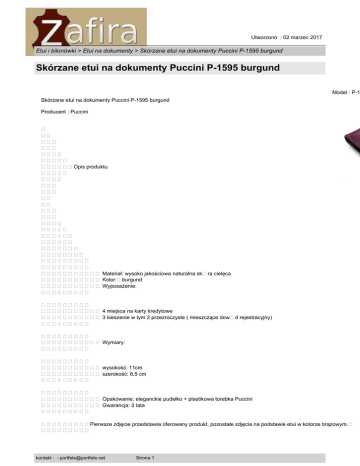 Utworzono : 02 marzec 2017 Etui i bilonówki > Etui na dokumenty > Skórzane etui na dokumenty Puccini P-1595 burgund Skórzane etui na dokumenty Puccini P-1595 burgund Model : P-1 Skórzane etui na dokumenty Puccini P-1595 burgund Producent : Puccini Opis produktu � Materiał: wysoko jakościowa naturalna sk�ra cielęca � Kolor:�burgund � Wyposażenie: � 4 miejsca na karty kredytowe � 3 kieszenie w tym 2 przezroczyste ( mieszczące dow�d rejestracyjny) � Wymiary: � wysokość: 11cm � szerokość: 8,5 cm � Opakowanie: eleganckie pudełko + plastikowa torebka Puccini � Gwarancja: 2 lata Pierwsze zdjęcie przedstawia oferowany produkt, pozostałe zdjęcia na podstawie etui w kolorze brązowym.� kontakt : - [email protected] Strona 1 Utworzono : 02 marzec 2017 Etui i bilonówki > Etui na dokumenty > Skórzane etui na dokumenty Puccini P-1595 burgund Skórzane etui na dokumenty Puccini P-1595 burgund Cena : 62,00 zł Brutto ( 62,00 zł Netto) Dostępność: Produkt dostępny w naszym sklepie od 25 luty 2016 kontakt : - [email protected] Strona 2