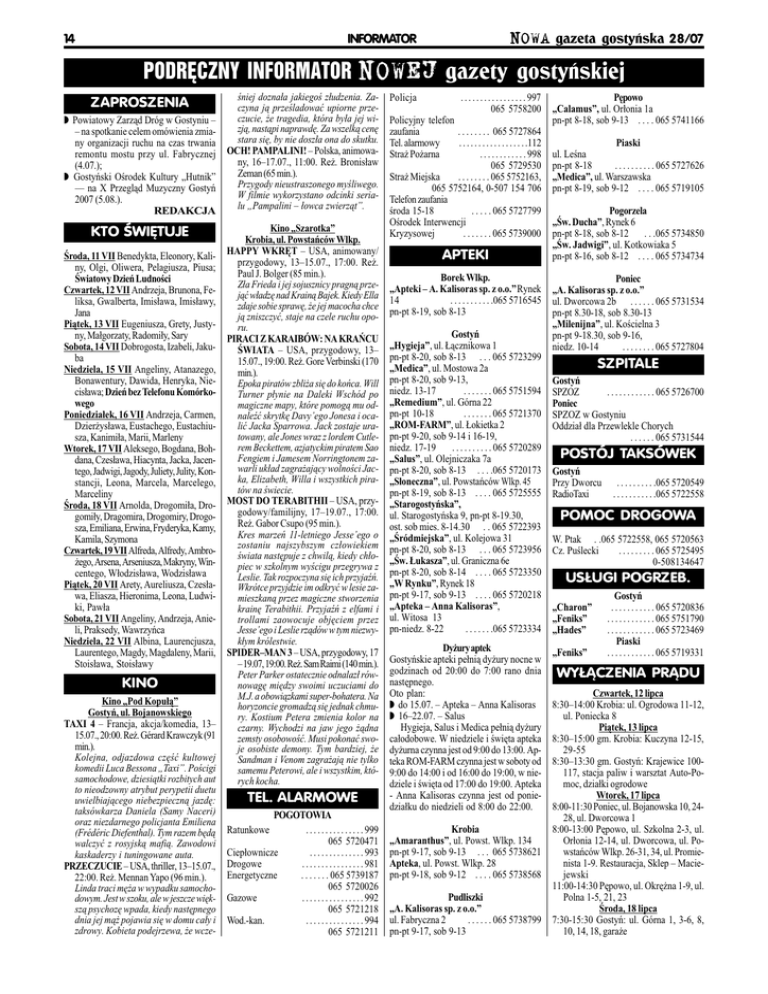 14 INFORMATOR NOWA gazeta gostyñska 28/07 PODRÊCZNY INFORMATOR NOWEJ gazety gostyñskiej ZAPROSZENIA w Powiatowy Zarz¹d Dróg w Gostyniu na spotkanie celem omówienia zmiany organizacji ruchu na czas trwania remontu mostu przy ul. Fabrycznej (4.07.); w Gostyñski Orodek Kultury Hutnik na X Przegl¹d Muzyczny Gostyñ 2007 (5.08.). REDAKCJA KTO WIÊTUJE roda, 11 VII Benedykta, Eleonory, Kaliny, Olgi, Oliwera, Pelagiusza, Piusa; wiatowy Dzieñ Ludnoci Czwartek, 12 VII Andrzeja, Brunona, Feliksa, Gwalberta, Imis³awa, Imis³awy, Jana Pi¹tek, 13 VII Eugeniusza, Grety, Justyny, Ma³gorzaty, Radomi³y, Sary Sobota, 14 VII Dobrogosta, Izabeli, Jakuba Niedziela, 15 VII Angeliny, Atanazego, Bonawentury, Dawida, Henryka, Niecis³awa; Dzieñ bez Telefonu Komórkowego Poniedzia³ek, 16 VII Andrzeja, Carmen, Dzier¿ys³awa, Eustachego, Eustachiusza, Kanimi³a, Marii, Marleny Wtorek, 17 VII Aleksego, Bogdana, Bohdana, Czes³awa, Hiacynta, Jacka, Jacentego, Jadwigi, Jagody, Juliety, Julity, Konstancji, Leona, Marcela, Marcelego, Marceliny roda, 18 VII Arnolda, Drogomi³a, Drogomi³y, Dragomira, Drogomiry, Drogosza, Emiliana, Erwina, Fryderyka, Kamy, Kamila, Szymona Czwartek, 19 VII Alfreda, Alfredy, Ambro¿ego, Arsena, Arseniusza, Makryny, Wincentego, W³odzis³awa, Wodzis³awa Pi¹tek, 20 VII Arety, Aureliusza, Czes³awa, Eliasza, Hieronima, Leona, Ludwiki, Paw³a Sobota, 21 VII Angeliny, Andrzeja, Anieli, Praksedy, Wawrzyñca Niedziela, 22 VII Albina, Laurencjusza, Laurentego, Magdy, Magdaleny, Marii, Stois³awa, Stois³awy KINO Kino Pod Kopu³¹ Gostyñ, ul. Bojanowskiego TAXI 4 Francja, akcja/komedia, 13 15.07., 20:00. Re¿. Gérard Krawczyk (91 min.). Kolejna, odjazdowa czêæ kultowej komedii Luca Bessona Taxi. Pocigi samochodowe, dziesi¹tki rozbitych aut to nieodzowny atrybut perypetii duetu uwielbiaj¹cego niebezpieczn¹ jazdê: taksówkarza Daniela (Samy Naceri) oraz niezdarnego policjanta Emiliena (Frédéric Diefenthal). Tym razem bêd¹ walczyæ z rosyjsk¹ mafi¹. Zawodowi kaskaderzy i tuningowane auta. PRZECZUCIE USA, thriller, 1315.07., 22:00. Re¿. Mennan Yapo (96 min.). Linda traci mê¿a w wypadku samochodowym. Jest w szoku, ale w jeszcze wiêksz¹ psychozê wpada, kiedy nastêpnego dnia jej m¹¿ pojawia siê w domu ca³y i zdrowy. Kobieta podejrzewa, ¿e wcze- niej dozna³a jakiego z³udzenia. Zaczyna j¹ przeladowaæ upiorne przeczucie, ¿e tragedia, która by³a jej wizj¹, nast¹pi naprawdê. Za wszelk¹ cenê stara siê, by nie dosz³a ona do skutku. OCH! PAMPALINI! Polska, animowany, 1617.07., 11:00. Re¿. Bronis³aw Zeman (65 min.). Przygody nieustraszonego myliwego. W filmie wykorzystano odcinki serialu Pampalini ³owca zwierz¹t. Policja . . . . . . . . . . . . . . . . . 997 Pêpowo 065 5758200 Calamus, ul. Or³onia 1a Policyjny telefon pn-pt 8-18, sob 9-13 . . . . 065 5741166 zaufania . . . . . . . . 065 5727864 Tel. alarmowy . . . . . . . . . . . . . . . . . .112 Piaski Stra¿ Po¿arna . . . . . . . . . . . . 998 ul. Lena 065 5729530 pn-pt 8-18 . . . . . . . . . . 065 5727626 Stra¿ Miejska . . . . . . . . 065 5752163, Medica, ul. Warszawska 065 5752164, 0-507 154 706 pn-pt 8-19, sob 9-12 . . . . 065 5719105 Telefon zaufania roda 15-18 . . . . . 065 5727799 Pogorzela Orodek Interwencji w. Ducha, Rynek 6 Kino Szarotka Kryzysowej . . . . . . . 065 5739000 pn-pt 8-18, sob 8-12 . . .065 5734850 Krobia, ul. Powstañców Wlkp. w. Jadwigi, ul. Kotkowiaka 5 HAPPY WKRÊT USA, animowany/ APTEKI pn-pt 8-16, sob 8-12 . . . . 065 5734734 przygodowy, 1315.07., 17:00. Re¿. Paul J. Bolger (85 min.). Borek Wlkp. Poniec Z³a Frieda i jej sojusznicy pragn¹ prze- Apteki A. Kalisoras sp. z o.o.Rynek A. Kalisoras sp. z o.o. j¹æ w³adzê nad Krain¹ Bajek. Kiedy Ella 14 . . . . . . . . . . .065 5716545 ul. Dworcowa 2b . . . . . . 065 5731534 zdaje sobie sprawê, ¿e jej macocha chce pn-pt 8.30-18, sob 8.30-13 j¹ zniszczyæ, staje na czele ruchu opo- pn-pt 8-19, sob 8-13 Milenijna, ul. Kocielna 3 ru. Gostyñ pn-pt 9-18.30, sob 9-16, PIRACI Z KARAIBÓW: NA KRAÑCU niedz. 10-14 . . . . . . . . 065 5727804 WIATA USA, przygodowy, 13 Hygieja, ul. £¹cznikowa 1 15.07., 19:00. Re¿. Gore Verbinski (170 pn-pt 8-20, sob 8-13 . . . 065 5723299 SZPITALE Medica, ul. Mostowa 2a min.). pn-pt 8-20, sob 9-13, Gostyñ Epoka piratów zbli¿a siê do koñca. Will . . . . . . . 065 5751594 SPZOZ . . . . . . . . . . . . 065 5726700 Turner p³ynie na Daleki Wschód po niedz. 13-17 Poniec magiczne mapy, które pomog¹ mu od- Remedium, ul. Górna 22 . . . . . . . 065 5721370 SPZOZ w Gostyniu naleæ skrytkê Davyego Jonesa i oca- pn-pt 10-18 Oddzia³ dla Przewlekle Chorych liæ Jacka Sparrowa. Jack zostaje ura- ROM-FARM, ul. £okietka 2 towany, ale Jones wraz z lordem Cutle- pn-pt 9-20, sob 9-14 i 16-19, . . . . . . 065 5731544 rem Beckettem, azjatyckim piratem Sao niedz. 17-19 . . . . . . . . . . 065 5720289 POSTÓJ TAKSÓWEK Fengiem i Jamesem Norringtonem za- Salus, ul. Olejniczaka 7a warli uk³ad zagra¿aj¹cy wolnoci Jac- pn-pt 8-20, sob 8-13 . . . .065 5720173 Gostyñ ka, Elizabeth, Willa i wszystkich pira- S³oneczna, ul. Powstañców Wlkp. 45 Przy Dworcu . . . . . . . . . .065 5720549 tów na wiecie. pn-pt 8-19, sob 8-13 . . . . 065 5725555 RadioTaxi . . . . . . . . . . .065 5722558 MOST DO TERABITHII USA, przy- Starogostyñska, godowy/familijny, 1719.07., 17:00. ul. Starogostyñska 9, pn-pt 8-19.30, POMOC DROGOWA Re¿. Gabor Csupo (95 min.). ost. sob mies. 8-14.30 . . 065 5722393 Kres marzeñ 11-letniego Jesseego o ródmiejska, ul. Kolejowa 31 W. Ptak . .065 5722558, 065 5720563 zostaniu najszybszym cz³owiekiem pn-pt 8-20, sob 8-13 . . . 065 5723956 Cz. Pulecki . . . . . . . . . 065 5725495 wiata nastêpuje z chwil¹, kiedy ch³o- w. £ukasza, ul. Graniczna 6e 0-508134647 piec w szkolnym wycigu przegrywa z pn-pt 8-20, sob 8-14 . . . . 065 5723350 Leslie. Tak rozpoczyna siê ich przyjañ. US£UGI POGRZEB. Wkrótce przyjdzie im odkryæ w lesie za- W Rynku, Rynek 18 pn-pt 9-17, sob 9-13 . . . . 065 572021