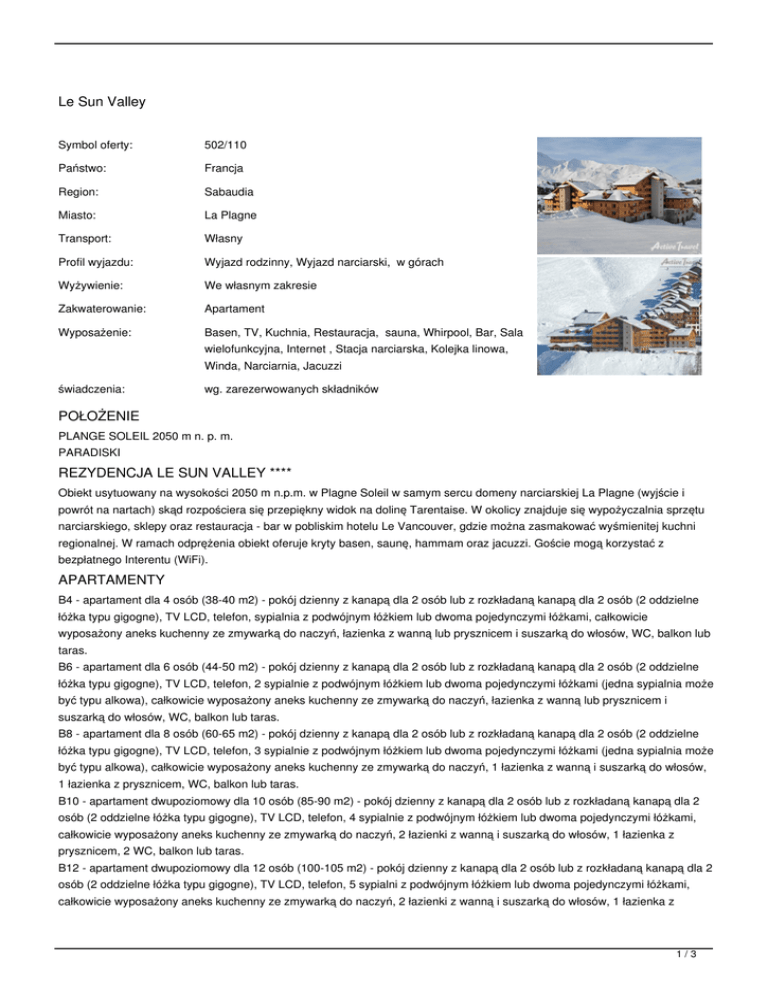 Le Sun Valley Symbol oferty: 502/110 Państwo: Francja Region: Sabaudia Miasto: La Plagne Transport: Własny Profil wyjazdu: Wyjazd rodzinny, Wyjazd narciarski, w górach Wyżywienie: We własnym zakresie Zakwaterowanie: Apartament Wyposażenie: Basen, TV, Kuchnia, Restauracja, sauna, Whirpool, Bar, Sala wielofunkcyjna, Internet , Stacja narciarska, Kolejka linowa, Winda, Narciarnia, Jacuzzi świadczenia: wg. zarezerwowanych składników POŁOŻENIE PLANGE SOLEIL 2050 m n. p. m. PARADISKI REZYDENCJA LE SUN VALLEY **** Obiekt usytuowany na wysokości 2050 m n.p.m. w Plagne Soleil w samym sercu domeny narciarskiej La Plagne (wyjście i powrót na nartach) skąd rozpościera się przepiękny widok na dolinę Tarentaise. W okolicy znajduje się wypożyczalnia sprzętu narciarskiego, sklepy oraz restauracja - bar w pobliskim hotelu Le Vancouver, gdzie można zasmakować wyśmienitej kuchni regionalnej. W ramach odprężenia obiekt oferuje kryty basen, saunę, hammam oraz jacuzzi. Goście mogą korzystać z bezpłatnego Interentu (WiFi). APARTAMENTY B4 - apartament dla 4 osób (38-40 m2) - pokój dzienny z kanapą dla 2 osób lub z rozkładaną kanapą dla 2 osób (2 oddzielne łóżka typu gigogne), TV LCD, telefon, sypialnia z podwójnym łóżkiem lub dwoma pojedynczymi łóżkami, całkowicie wyposażony aneks kuchenny ze zmywarką do naczyń, łazienka z wanną lub prysznicem i suszarką do włosów, WC, balkon lub taras. B6 - apartament dla 6 osób (44-50 m2) - pokój dzienny z kanapą dla 2 osób lub z rozkładaną kanapą dla 2 osób (2 oddzielne łóżka typu gigogne), TV LCD, telefon, 2 sypialnie z podwójnym łóżkiem lub dwoma pojedynczymi łóżkami (jedna sypialnia może być typu alkowa), całkowicie wyposażony aneks kuchenny ze zmywarką do naczyń, łazienka z wanną lub prysznicem i suszarką do włosów, WC, balkon lub taras. B8 - apartament dla 8 osób (60-65 m2) - pokój dzienny z kanapą dla 2 osób lub z rozkładaną kanapą dla 2 osób (2 oddzielne łóżka typu gigogne), TV LCD, telefon, 3 sypialnie z podwójnym łóżkiem lub dwoma pojedynczymi łóżkami (jedna sypialnia może być typu alkowa), całkowicie wyposażony aneks kuchenny ze zmywarką do naczyń, 1 łazienka z wanną i suszarką do włosów, 1 łazienka z prysznicem, WC, balkon lub taras. B10 - apartament dwupoziomowy dla 10 osób (85-90 m2) - pokój dzienny z kanapą dla 2 osób lub z rozkładaną kanapą dla 2 osób (2 oddzielne łóżka typu gigogne), TV LCD, telefon, 4 sypialnie z podwójnym łóżkiem lub dwoma pojedynczymi łóżkami, całkowicie wyposażony aneks kuchenny ze zmywarką do naczyń, 2 łazienki z wanną i suszarką do włosów, 1 łazienka z prysznicem, 2 WC, balkon lub taras. B12 - apartament dwupoziomowy dla 12 osób (100-105 m2) - pokój dzienny z kanapą dla 2 osób lub z rozkładaną kanapą dla 2 osób (2 oddzielne łóżka typu gigogne), TV LCD, telefon, 5 sypialni z podwójnym łóżkiem lub dwoma pojedynczymi łóżkami, całkowicie wyposażony aneks kuchenny ze zmywarką do naczyń, 2 łazienki z wanną i suszarką do włosów, 1 łazienka z 1/3 prysznicem, 2 WC, balkon lub taras. B14 - apartament dwupoziomowy dla 14 osób (105-110 m2) - pokój dzienny z kanapą dla 2 osób lub z rozkładaną kanapą dla 2 osób (2 oddzielne łóżka typu gigogne), TV LCD, telefon, 6 sypialni z podwójnym łóżkiem lub dwoma pojedynczymi łóżkami lub łóżkiem piętrowym, całkowicie wyposażony aneks kuchenny ze zmywarką do naczyń, 2 łazienki z wanną i suszarką do włosów, 1 łazienka z prysznicem, 2 WC, balkon lub taras. CENA Cena zawiera: -zakwaterowanie w wybranym typie apartamentu z pościelą i ręcznikami, -korzystanie z basenu, wejście do sauny i hammamu, -bezprzewodowy internet w apartamentach. Cena nie zawiera dopłat obowiązkowych: -kaucji zwrotnej za apartament 500 EUR (tylko gotówka lub zastawiony paszport), -opłaty klimatycznej 2,48 EUR/osoba/dzień. Cena nie zawiera dopłat opcjonalnych: -wyżywienia, -transportu, -ubezpieczenia KL, NNW, -ubezpieczenia narciarskiego, -ubezpieczenia od kosztów rezygnacji 3 %, -ubezpieczenia od chorób przewlekłych, -parkingu 55 EUR / tydz. (wysokość 2.10 m), -karnetu narciarskiego płatnego na miejscu. Uwaga! Istnieje możliwość wykupienia śniadania w hotelu w tym samym budynku: BB - 12 EUR / dzień płatne na miejscu. Atrakcje: La Plagne oferuje emocjonujący zjazd na bobslejach, które mogą osiągnąć prędkość do 120 km/h. <a rel="nofollow" href="http://www.la-plagne.com/en/winter/bobsleigh-plagne.html/">Bobsleje Snow park <a rel="nofollow" href="https://www.facebook.com/pages/Snowparks-La-plagne/581585528524542?fref=ts/">Snow park Możliwość odwiedzenia wioski igloo <a rel="nofollow" href="http://www.blacksheep-igloo.com/">Iglo Lodowisko (dodatkowo płatne) <a rel="nofollow" href="http://www.la-plagne.com/en/winter/guide/activities/nearby/skating-rinks--sitraLOI500777--ice-rink-plagne-bellecote.html# 11/">Lodowisko Kręgielnia oraz bilard The Bowling Center. Psie zaprzęgi, wycieczki w góry w rakietach śnieżnych. W stacji La Plagne można również wykupić kartę Pass Glacier umożliwiającą wjazd gondolą na lodowiec, z którego roztacza się widok na Alpy oraz umożliwiającą wejście do groty z rzeźbami z lodu. <a rel="nofollow" href="http://www.la-plagne.com/en/winter/guide/activities/hiking/glacier-pass.html">Grota z rzeźbami z lodu TERMINY: od: 2017-03-04 do: 2017-03-11 (8 dni), miejsca: zamów cena od: 1046 PLN od: 2017-03-11 do: 2017-03-18 (8 dni), miejsca: zamów cena od: 1046 PLN od: 2017-03-18 do: 2017-03-25 (8 dni), miejsca: zamów cena od: 873 PLN od: 2017-04-01 do: 2017-04-08 (8 dni), miejsca: zamów cena od: 1046 PLN od: 2017-04-08 do: 2017-04-15 (8 dni), miejsca: zamów cena od: 830 PLN od: 2017-04-15 do: 2017-04-22 (8 dni), miejsca: zamów cena od: 526 PLN 2/3 CENNIK: Długość pobytu: 8 dni 8 dni 8 dni 8 dni Grupa cenowa: A H J I 10 10 10 10 -20 (-) (-) (-) 3845 4277 5400 5832 9029 107